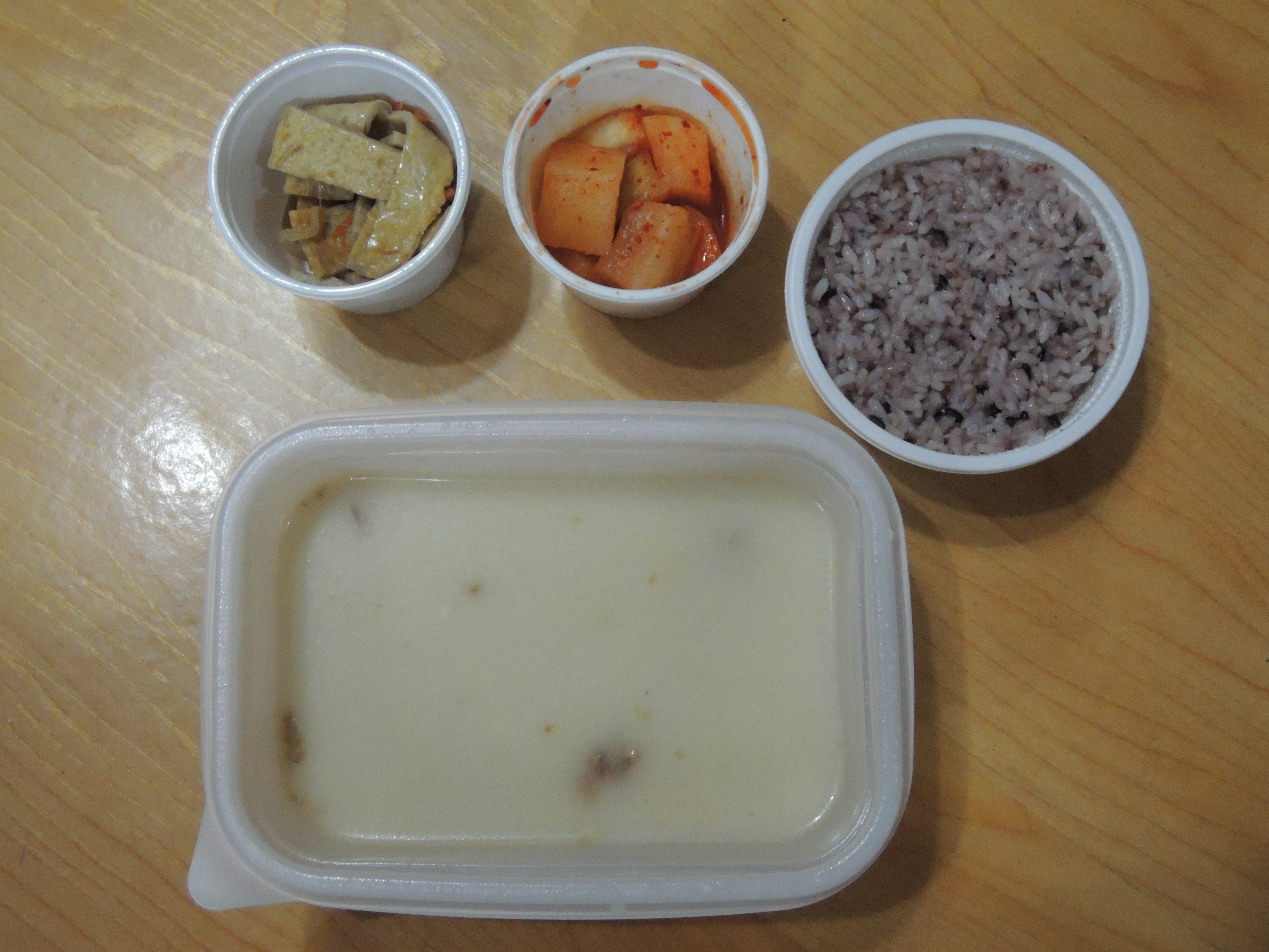 곰탕, 흑미밥, 깍뚜기, 오뎅볶음의 구성입니다. ㅎㅎ