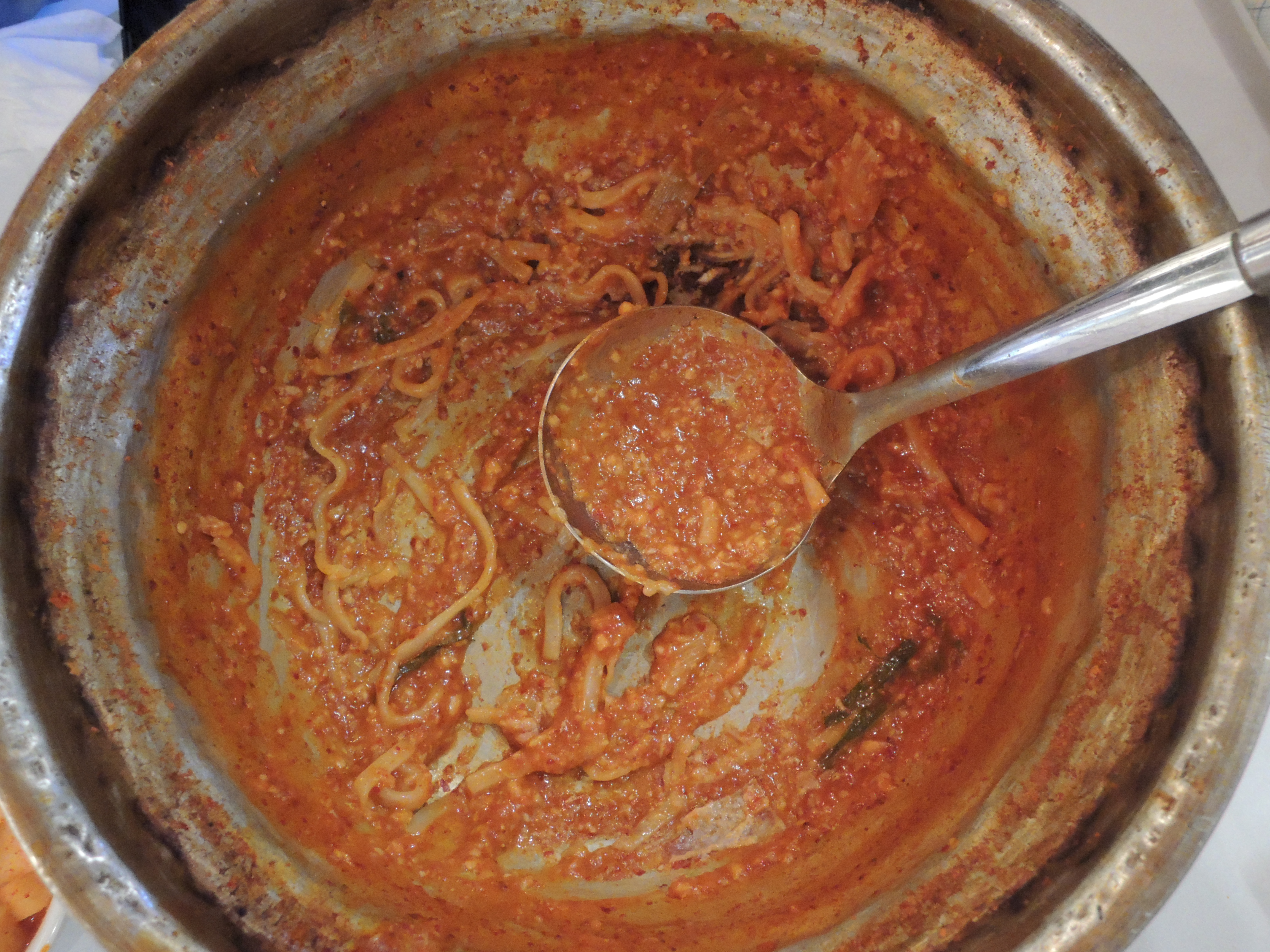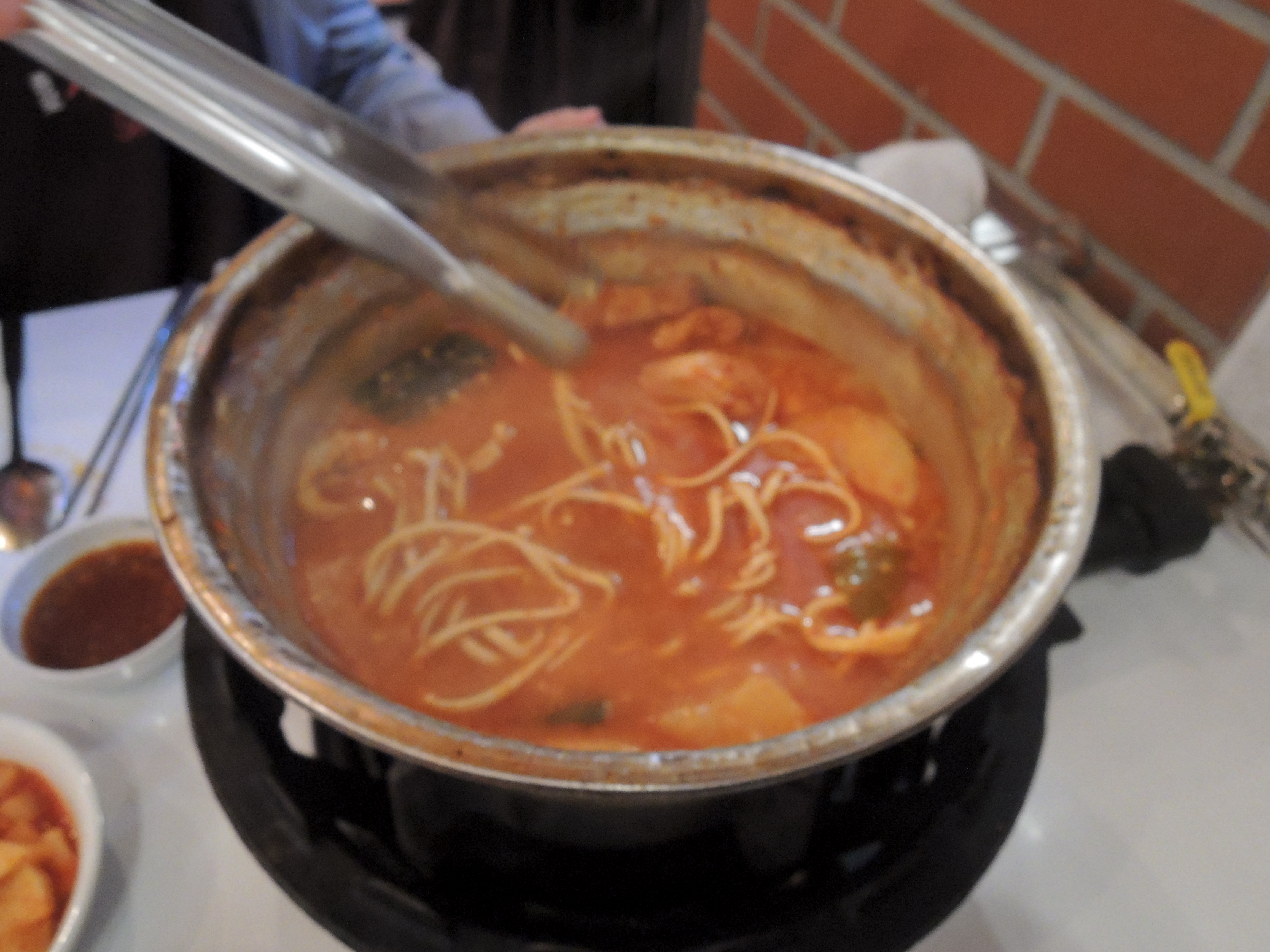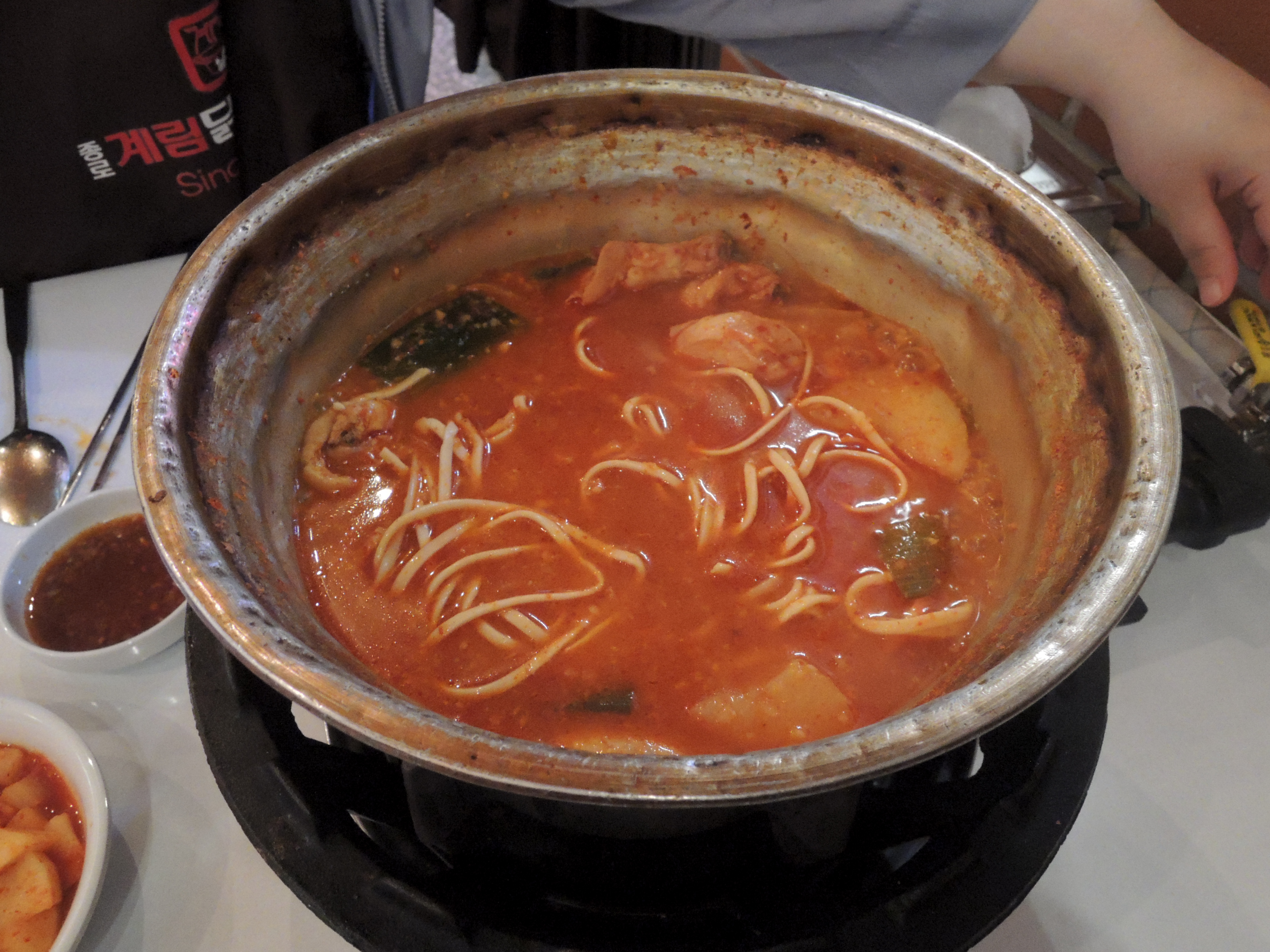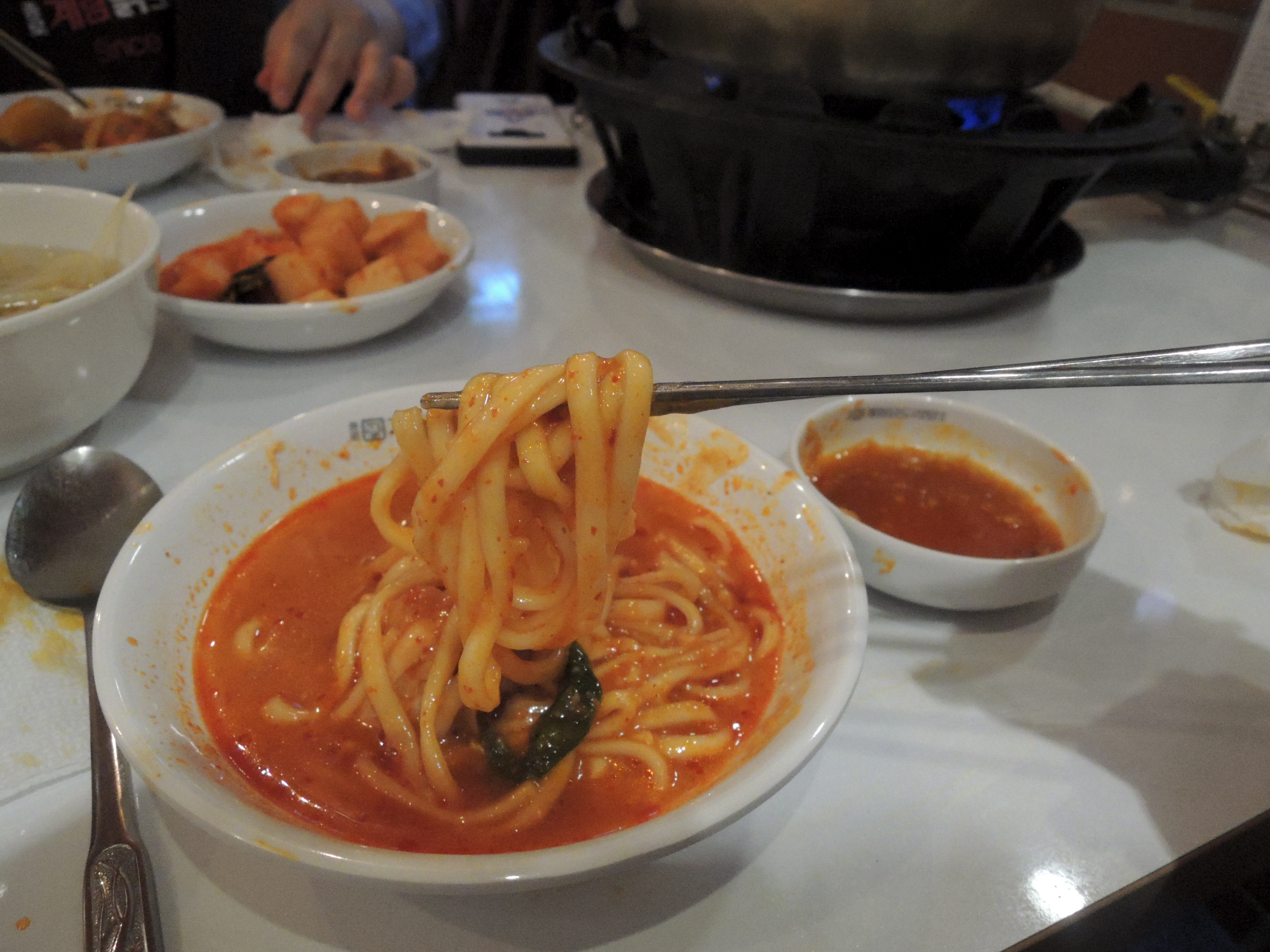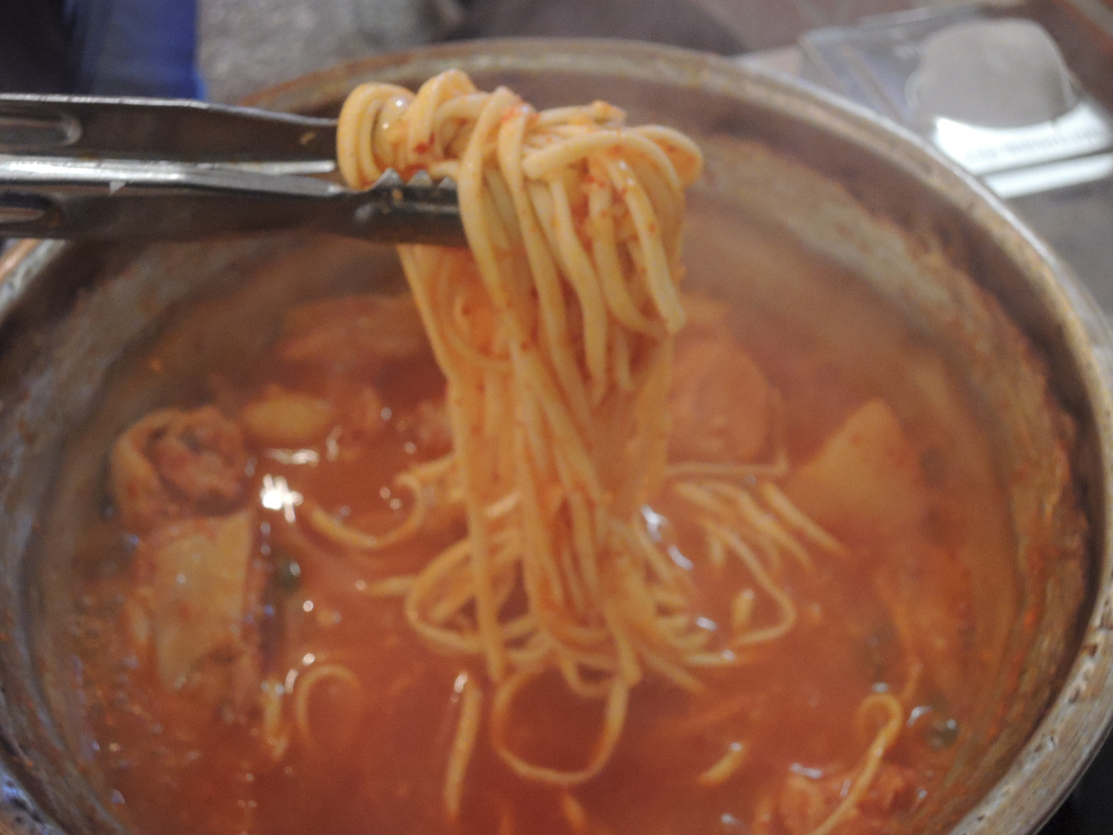 어느정도 건더기를 먹었다 싶으면 바로 칼국수사리를 넣어줍니다. 투하!