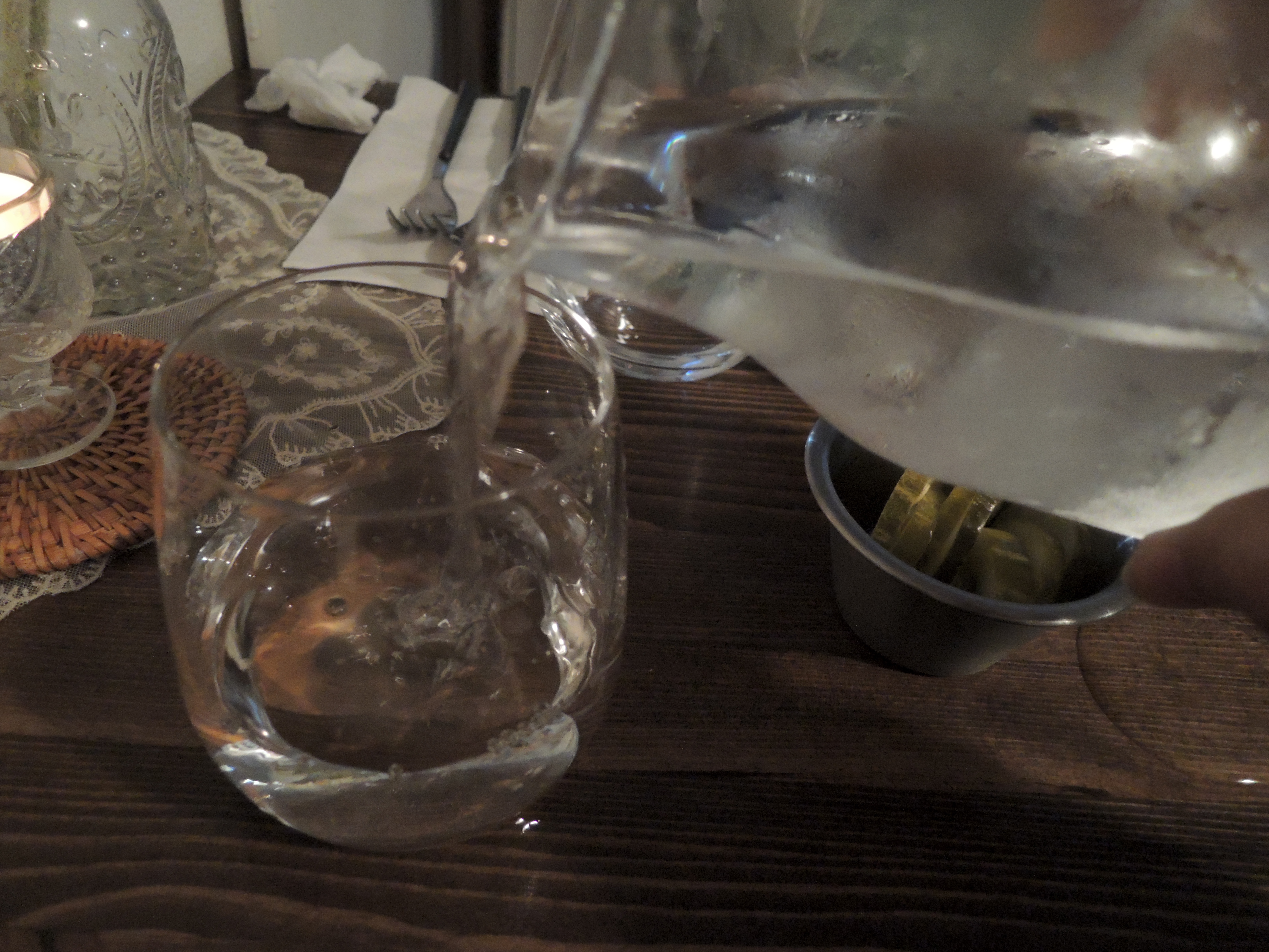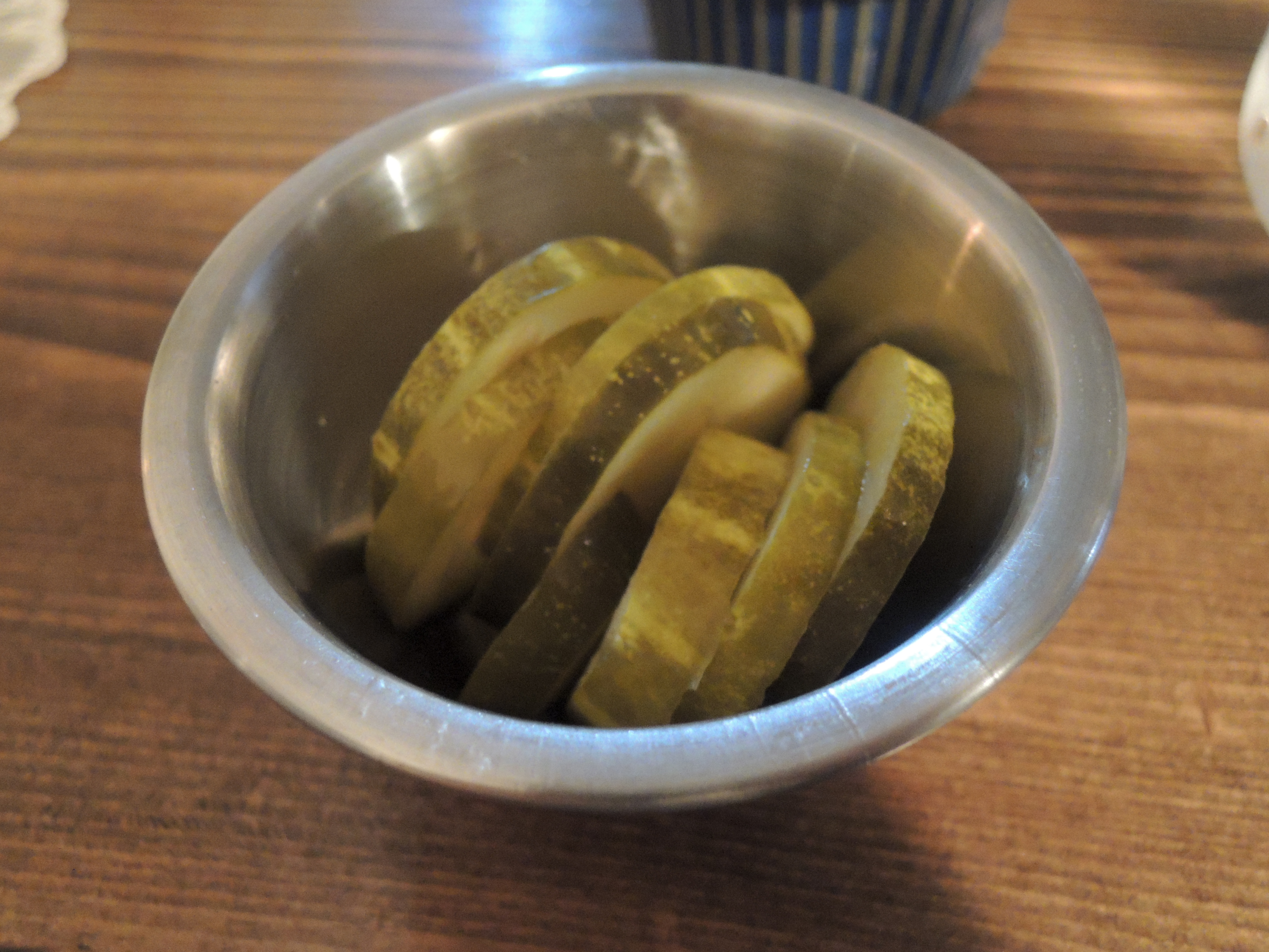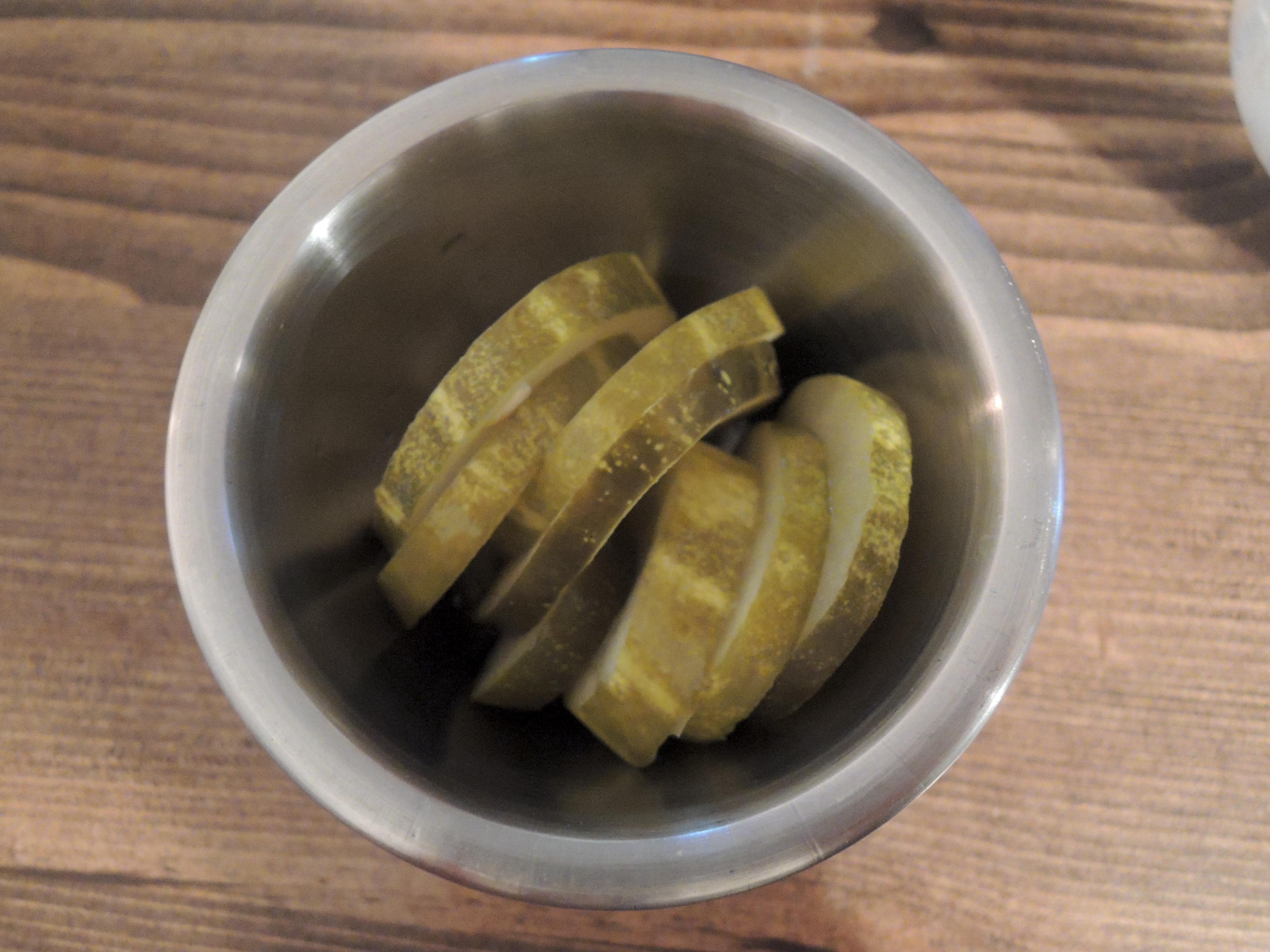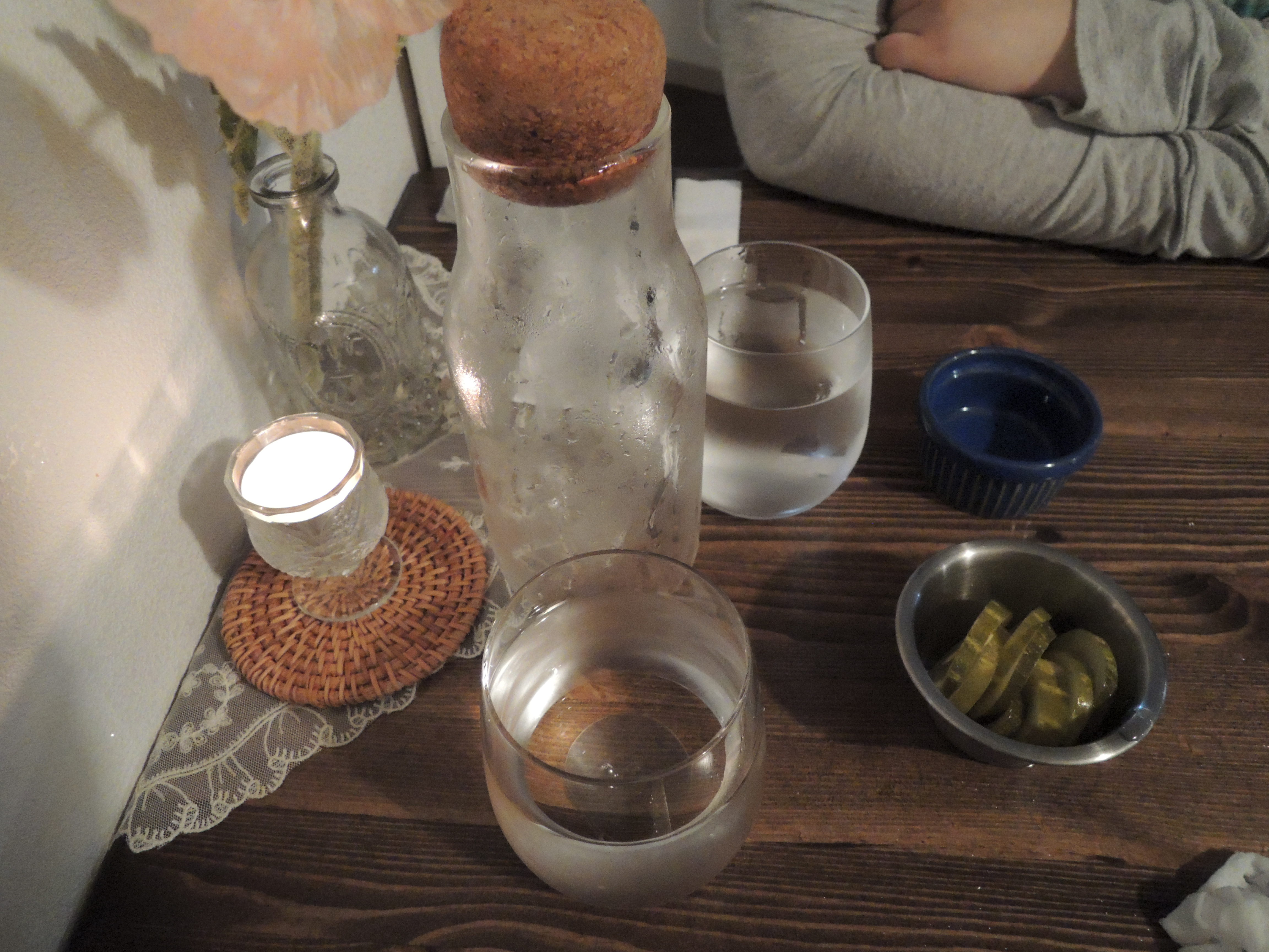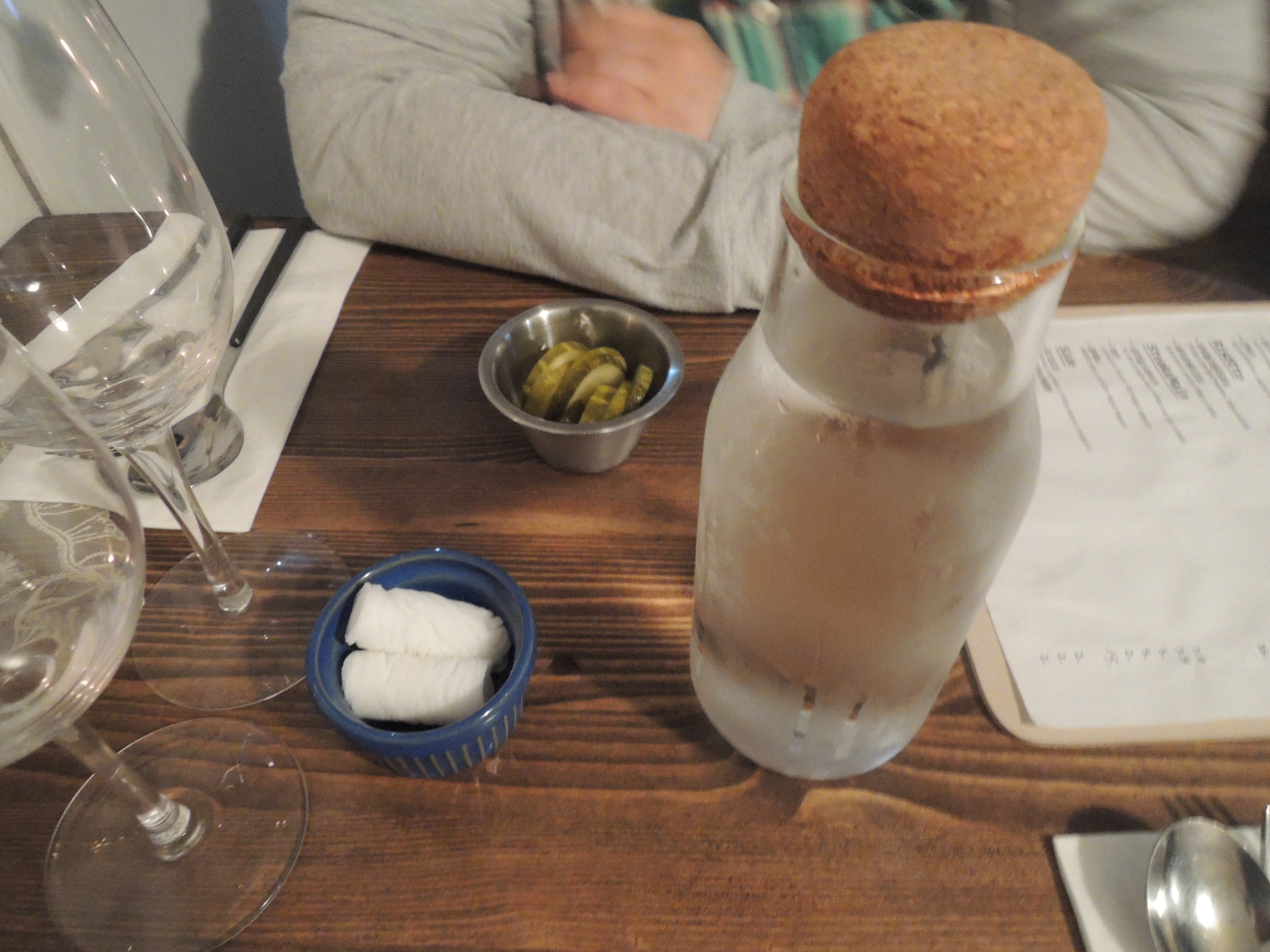 자리에 앉으면 이렇게 마실 물과, 손닦을 물티슈, 그리고 피클을 가져다 주세요.