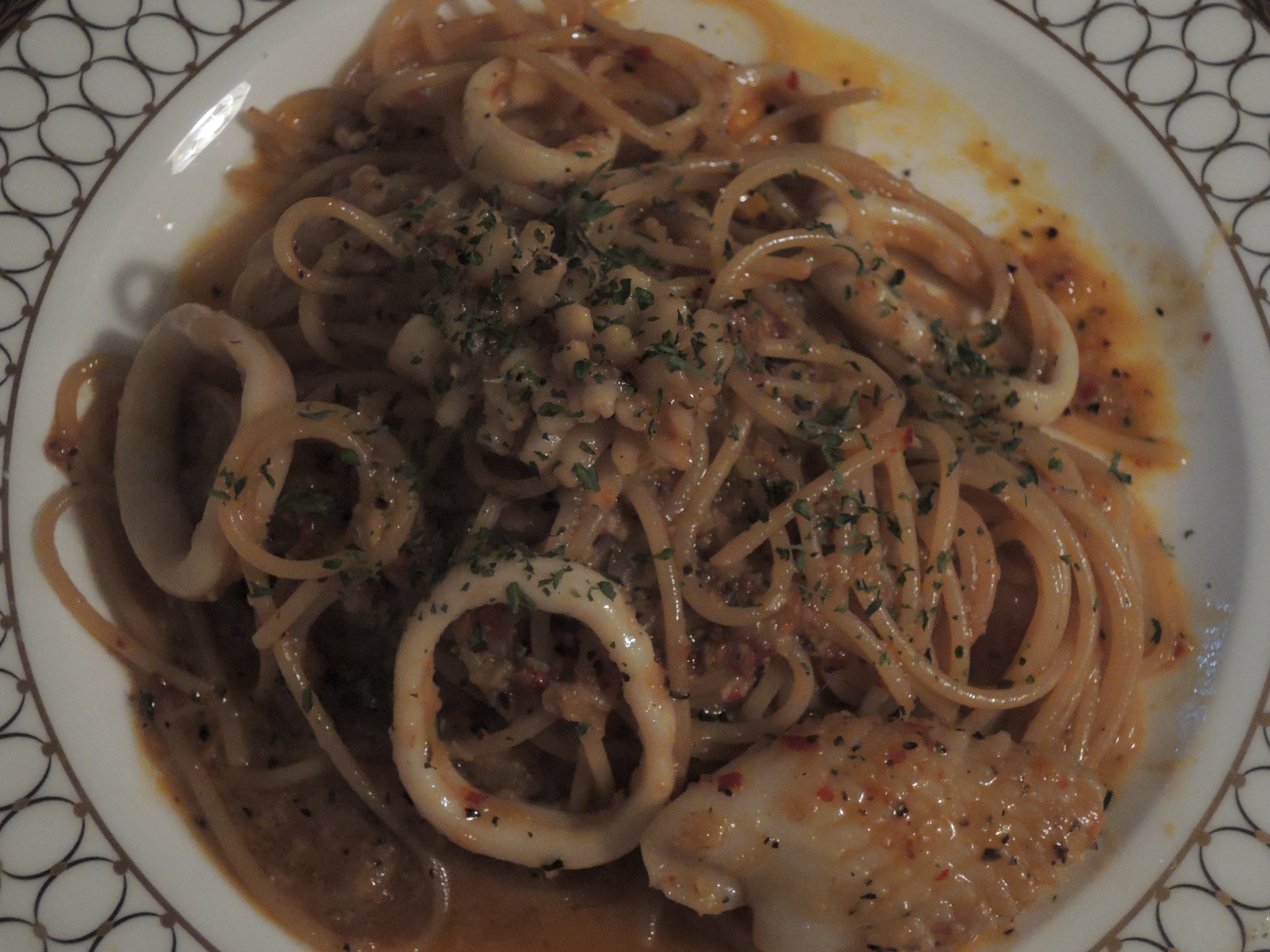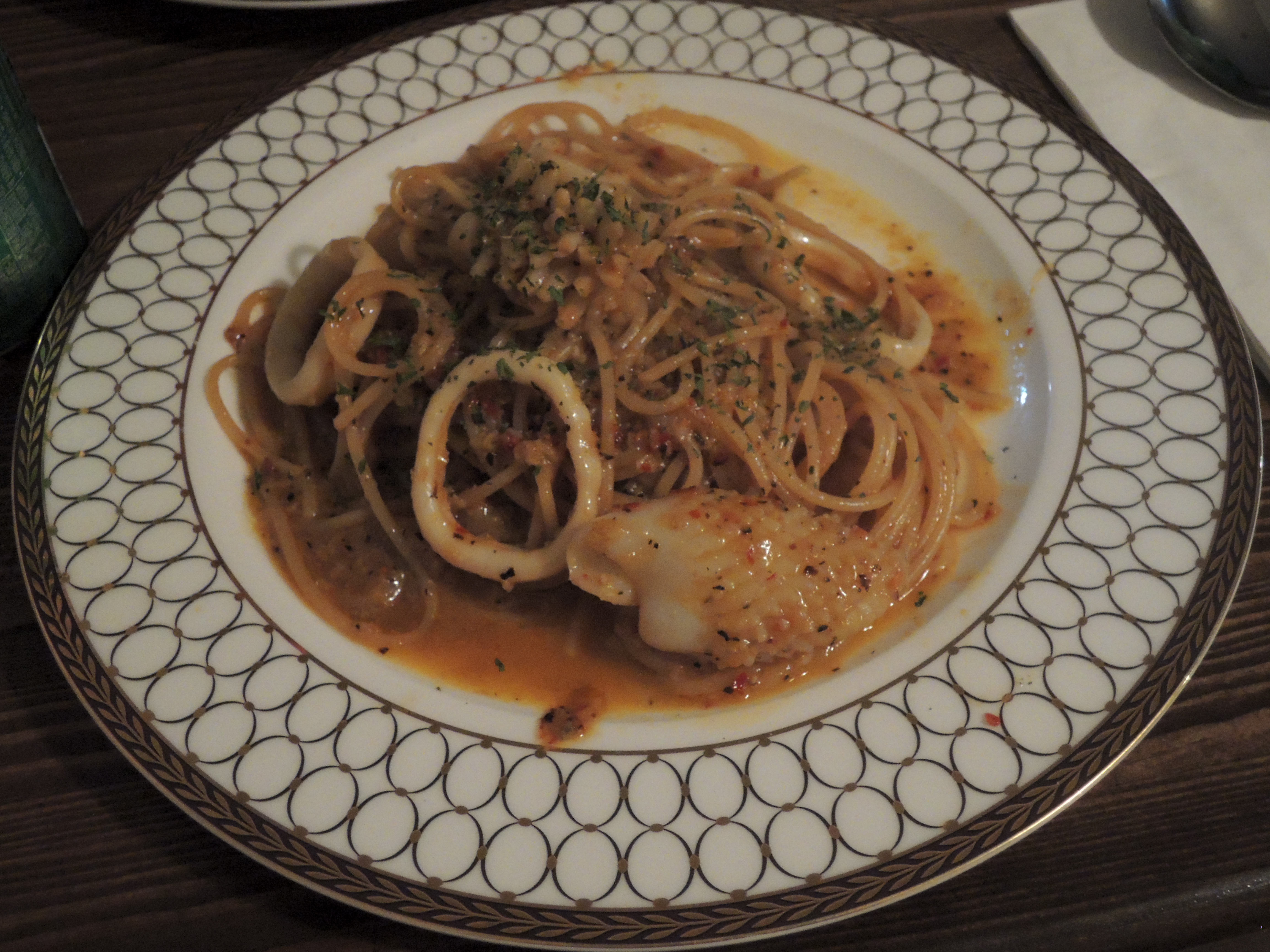 다양하게 손질된 오징어, 그리고 그 위에 파슬리를 듬뿍올렸습니다. 오일파스타라 윤기가 반짝반짝 하네요.