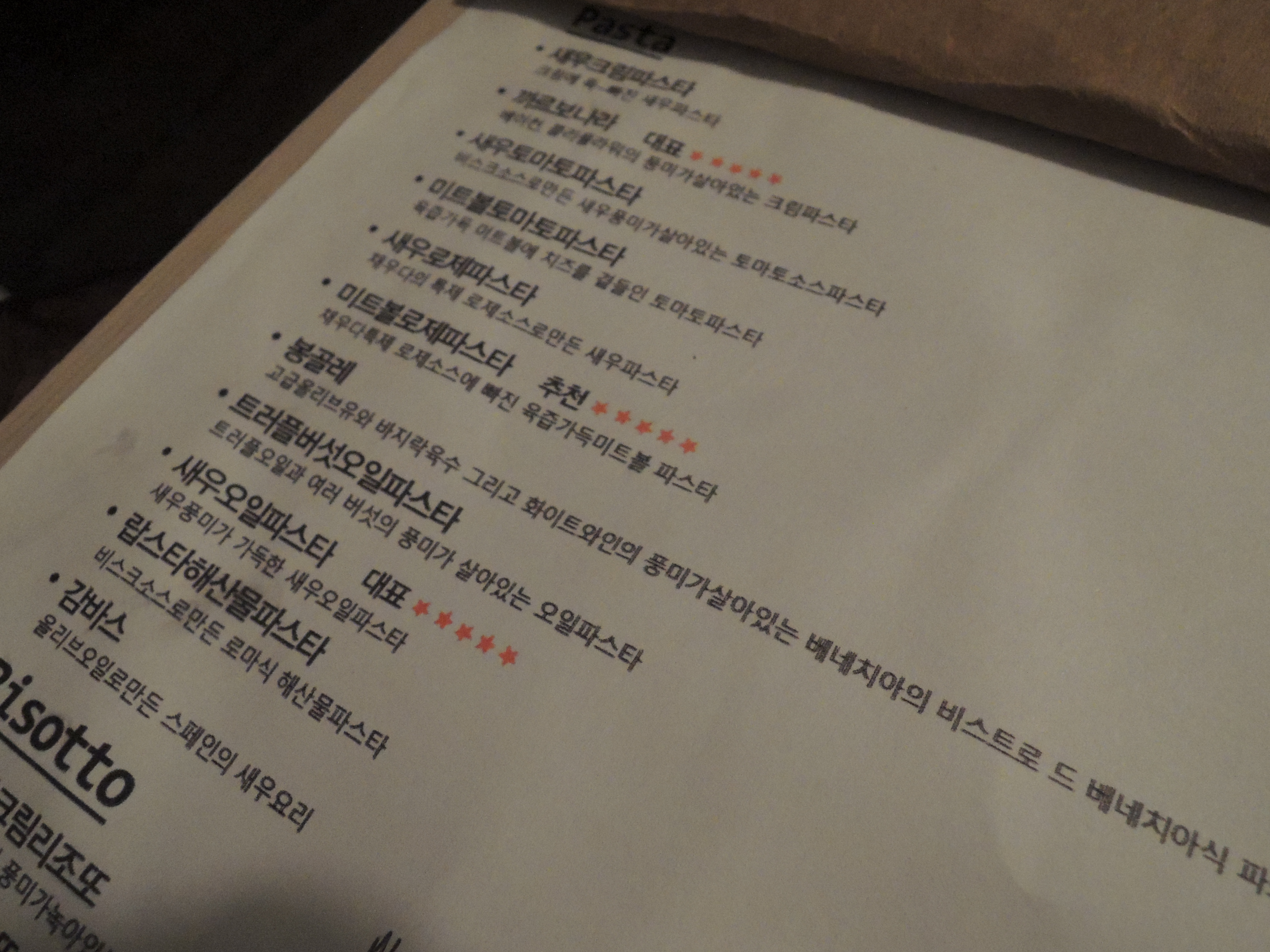 뒷장은 파스타, 리조또, 스테이크, 사이드메뉴가 적혀있습니다.