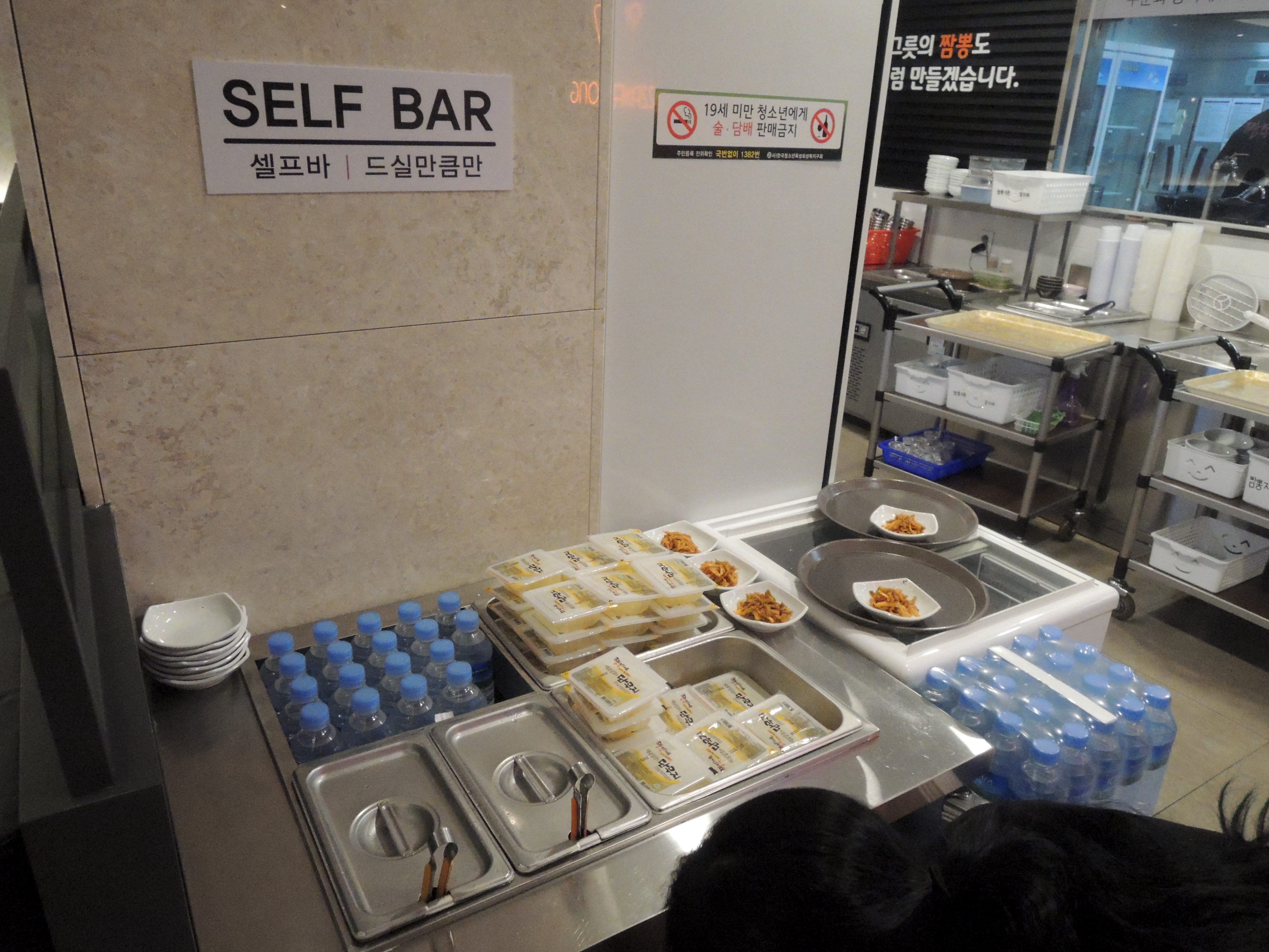물도 일반물이 아니라 무려 생수를 주는점, 그리고 단무지 기성품으로 주시는 점은 맘에 들더라고요. 유통기한도 제대로 적혀 있어서 믿고 먹을 수 있습니다. 셀프바가 따로 마련되어 있어서 생수나 단무지, 짜사이가 부족하면 더 먹을 수 있게 잘 되어 있어요.