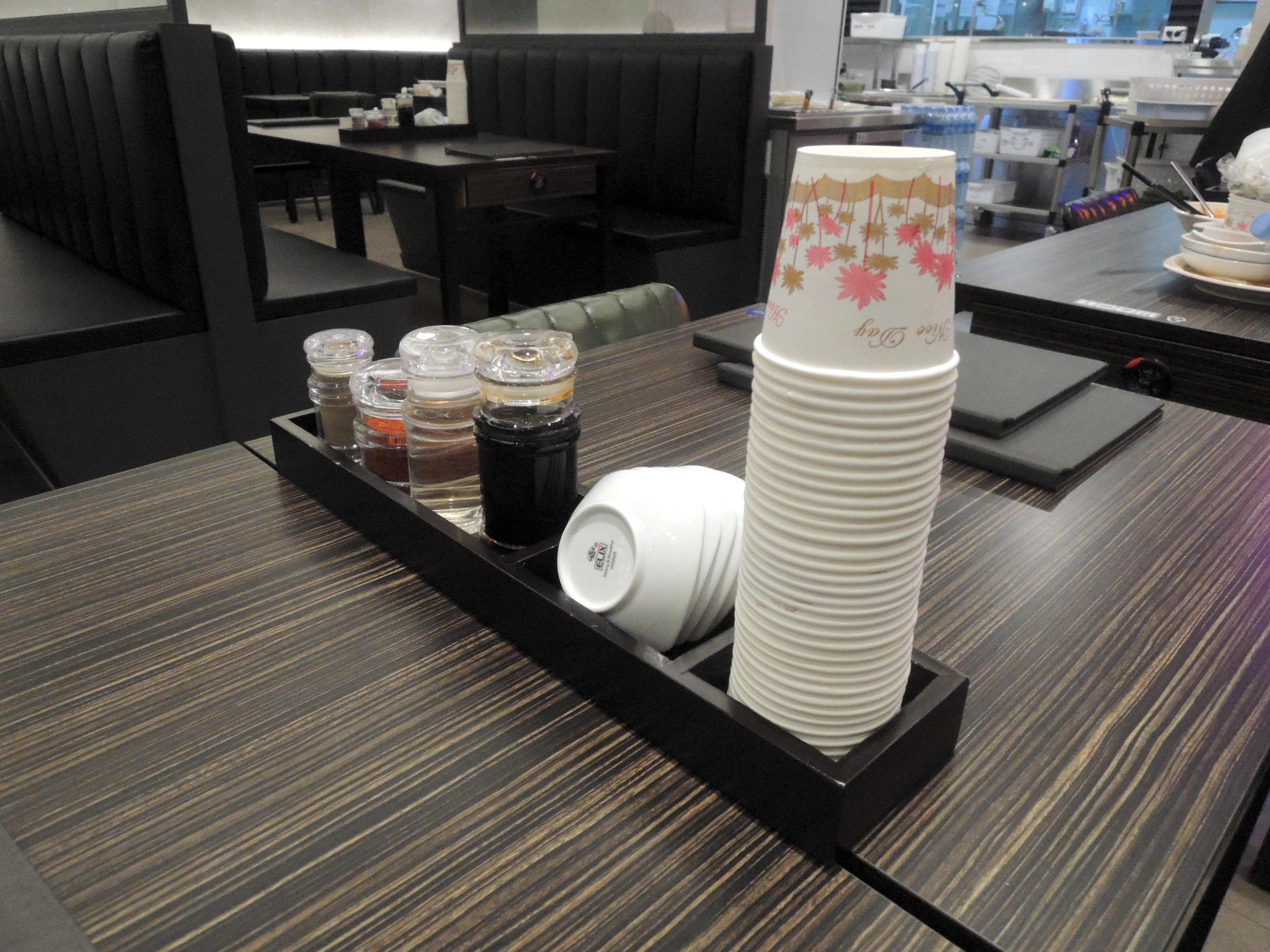 테이블 한켠에는 식초, 고춧가루, 간장 등 향신료와, 종이컵, 그리고 간장그릇이 준비되어 있습니다.