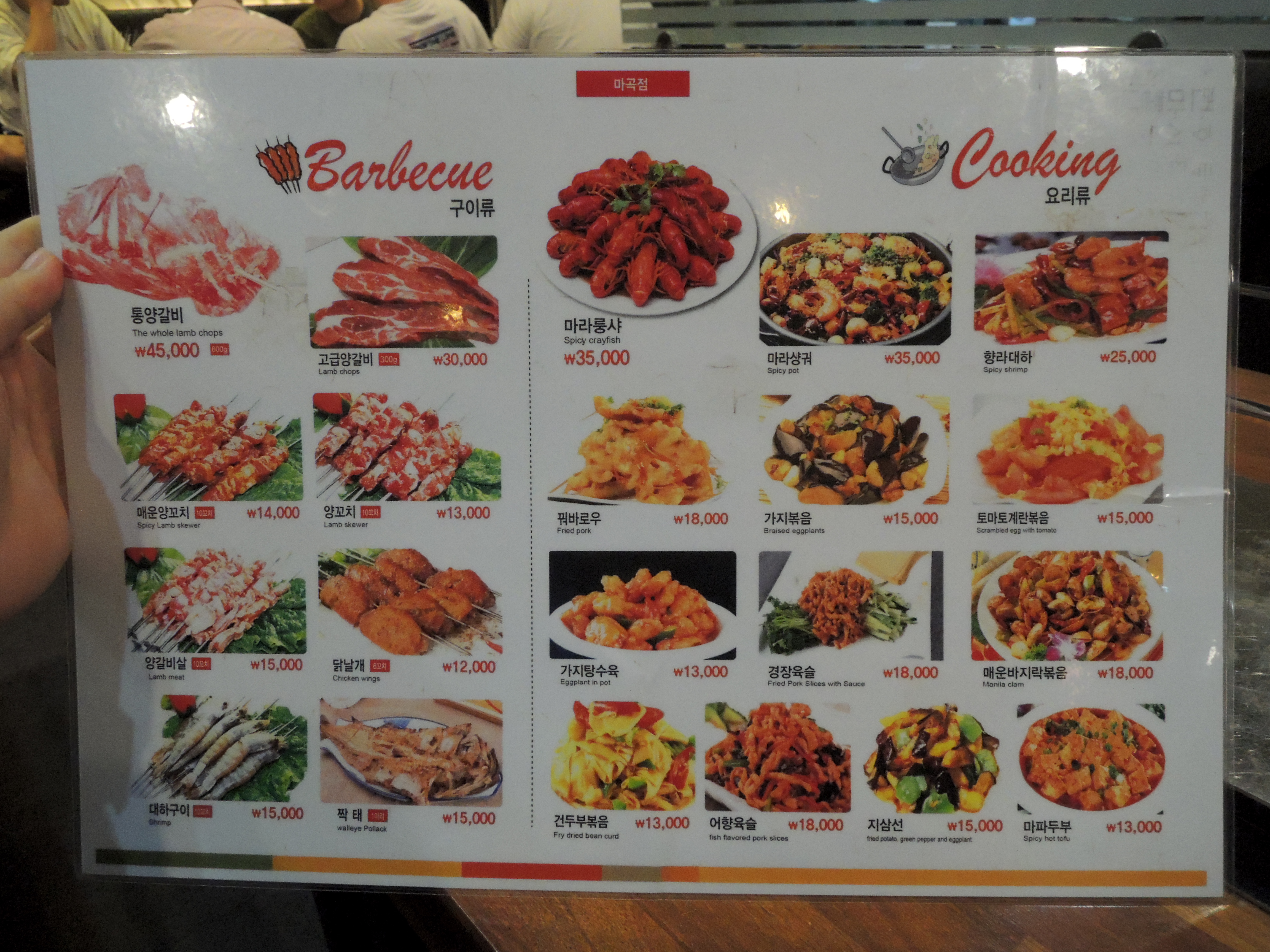 메뉴판입니다. 저는 양꼬치2인분과 꿔바로우를 주문했어요.