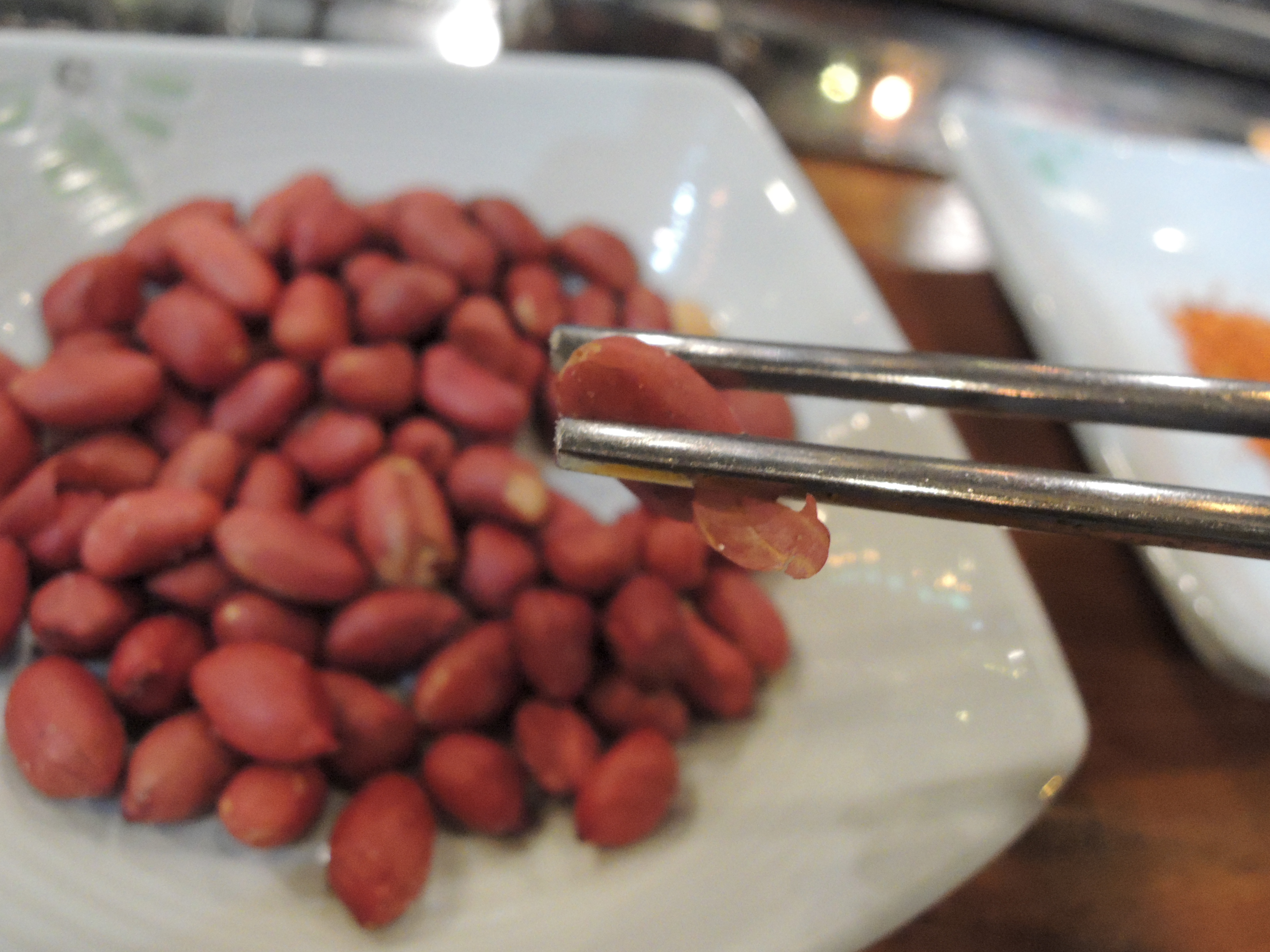 양꼬치를 주문하면 나오는 기본찬 3종세트입니다. 양파절임, 짜사이, 그리고 땅콩볶음!