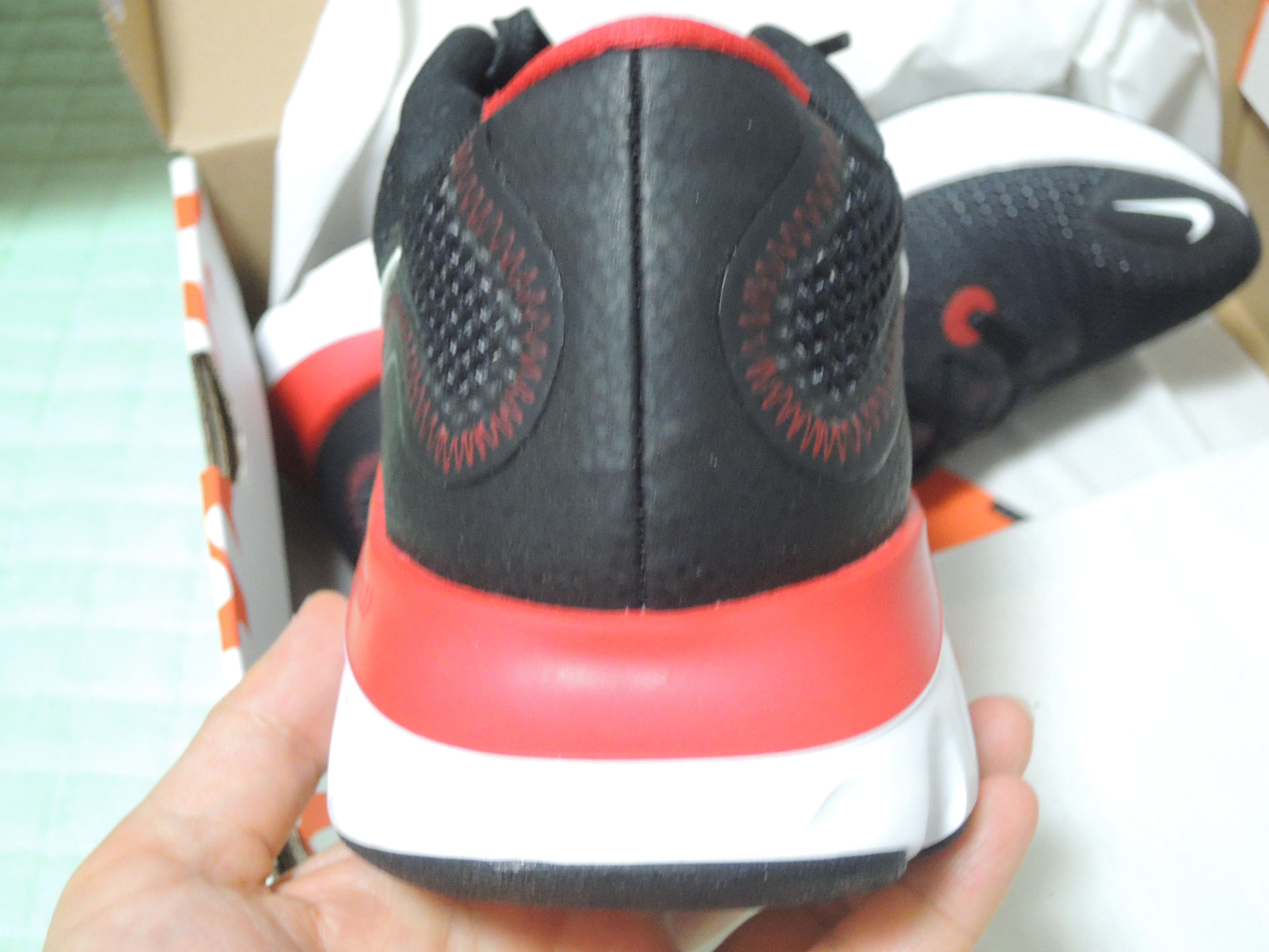 검은색 컬러에 빨간색으로 포인트를 줬네요. 마감이 고급스럽다는 느낌은 아니고요. 첫인상은 그저 미드솔이 두터운게 신기합니다.