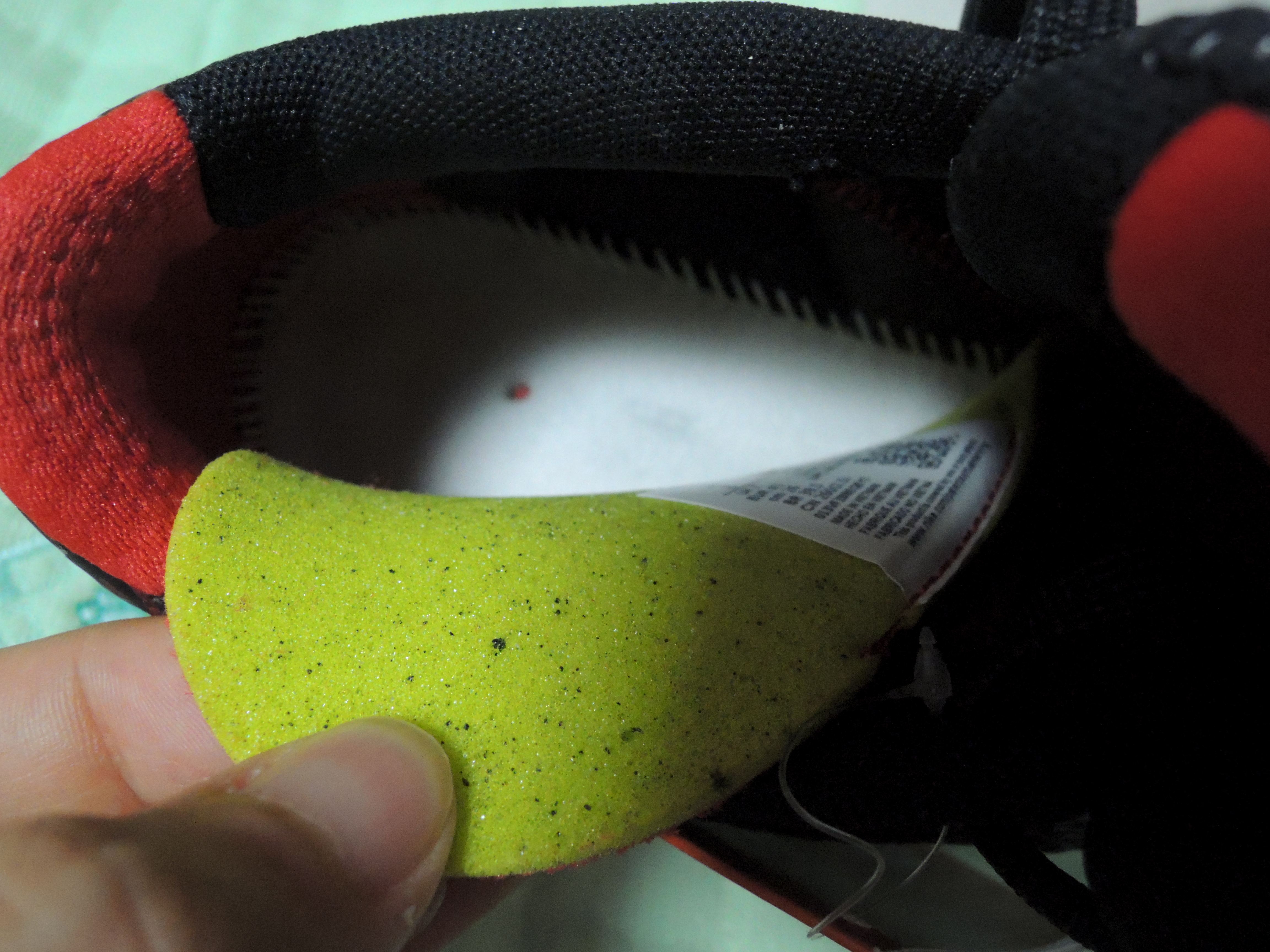 인솔을 한번 보았습니다. 살짝 접착력이 있는 부직포형태의 약간의 쿠션감이있는 인솔입니다. 신발과 닿는 부분이 약간 찐득합니다.