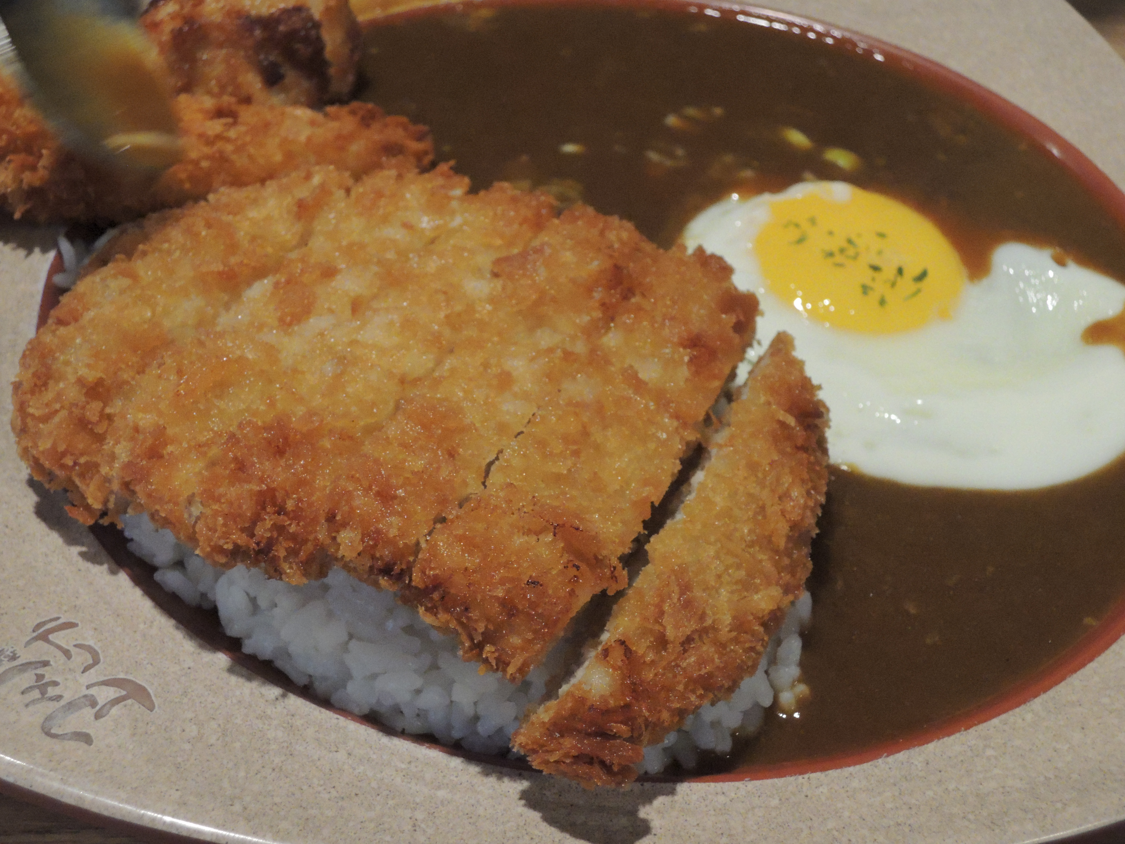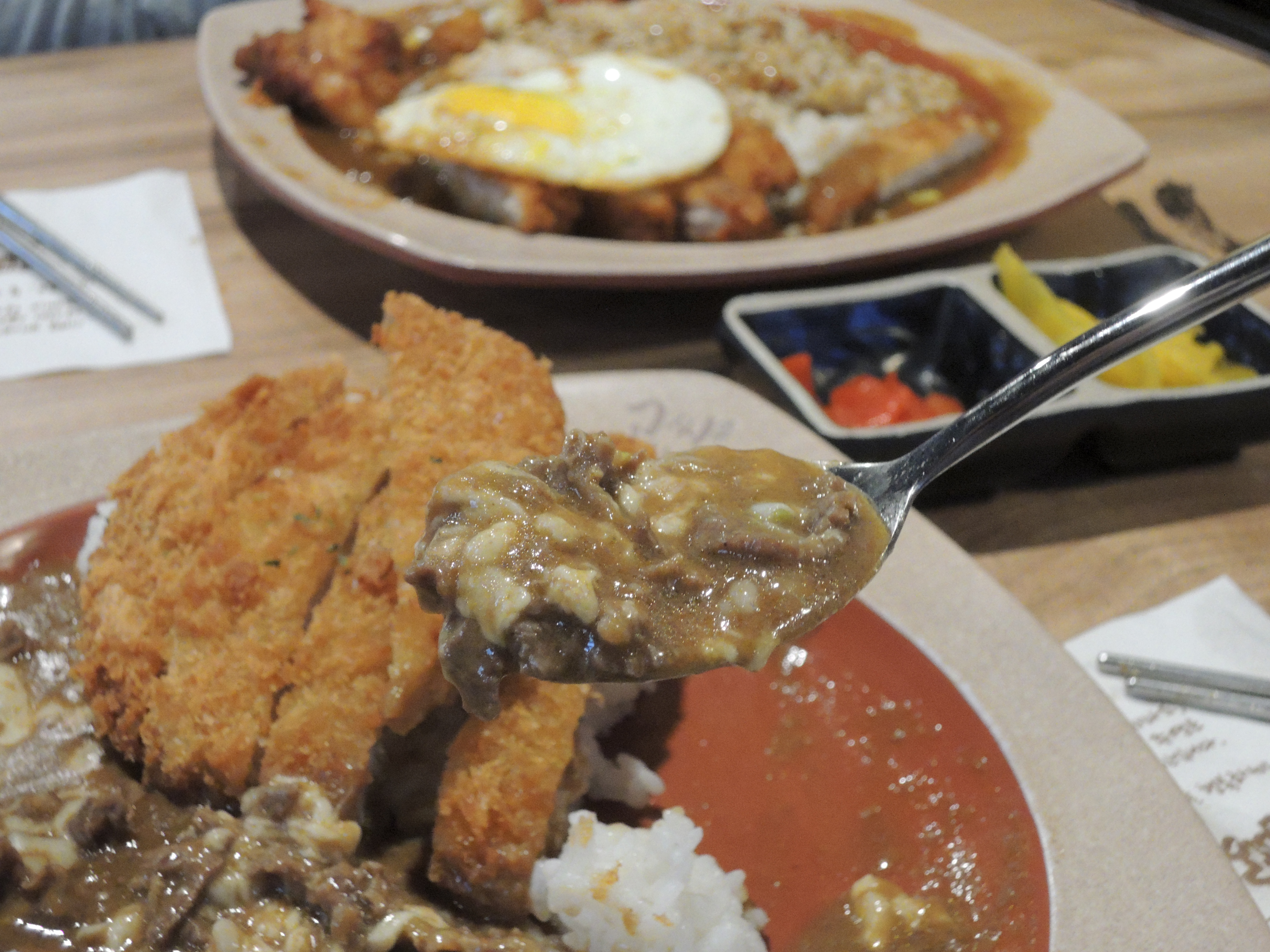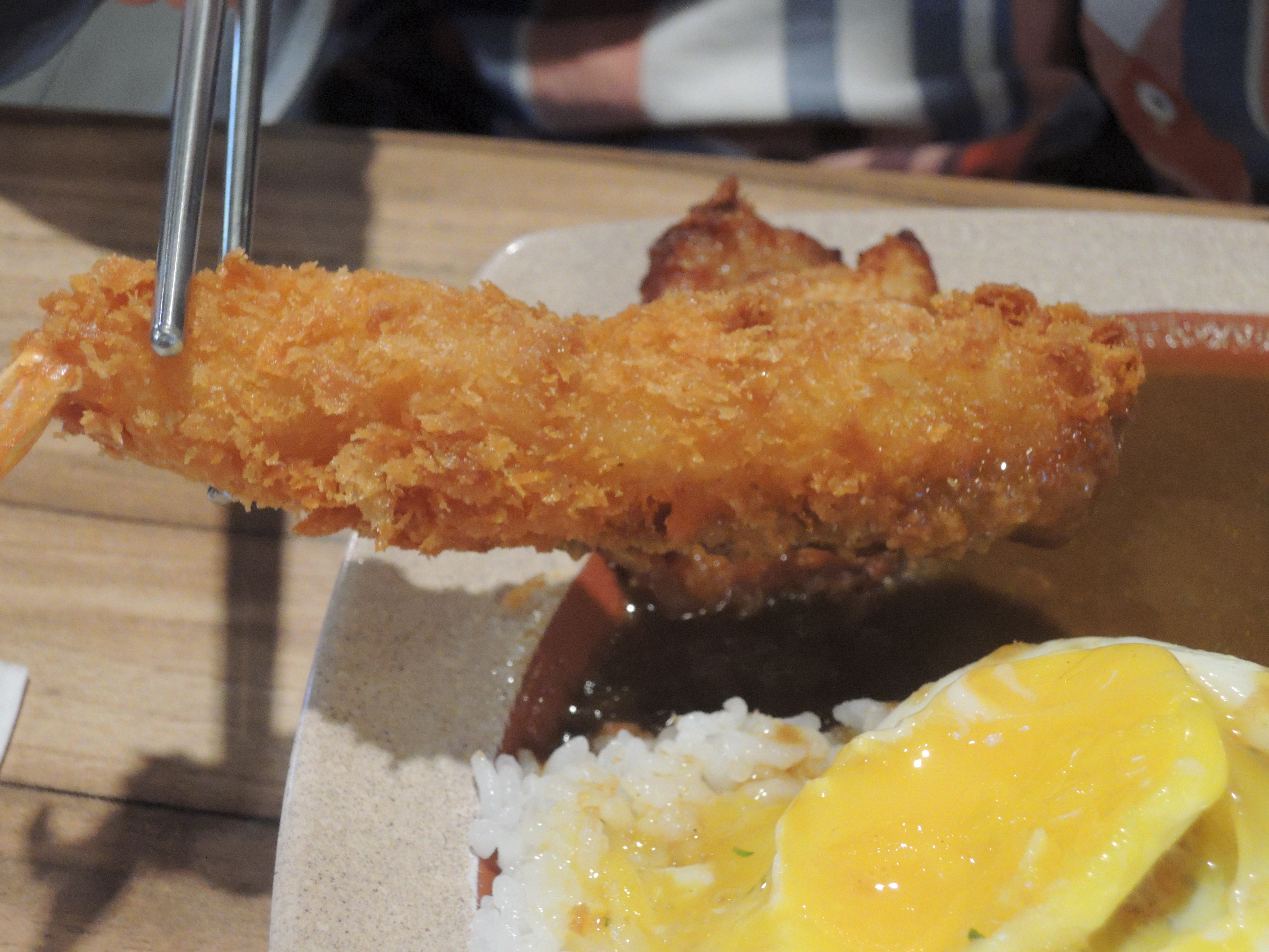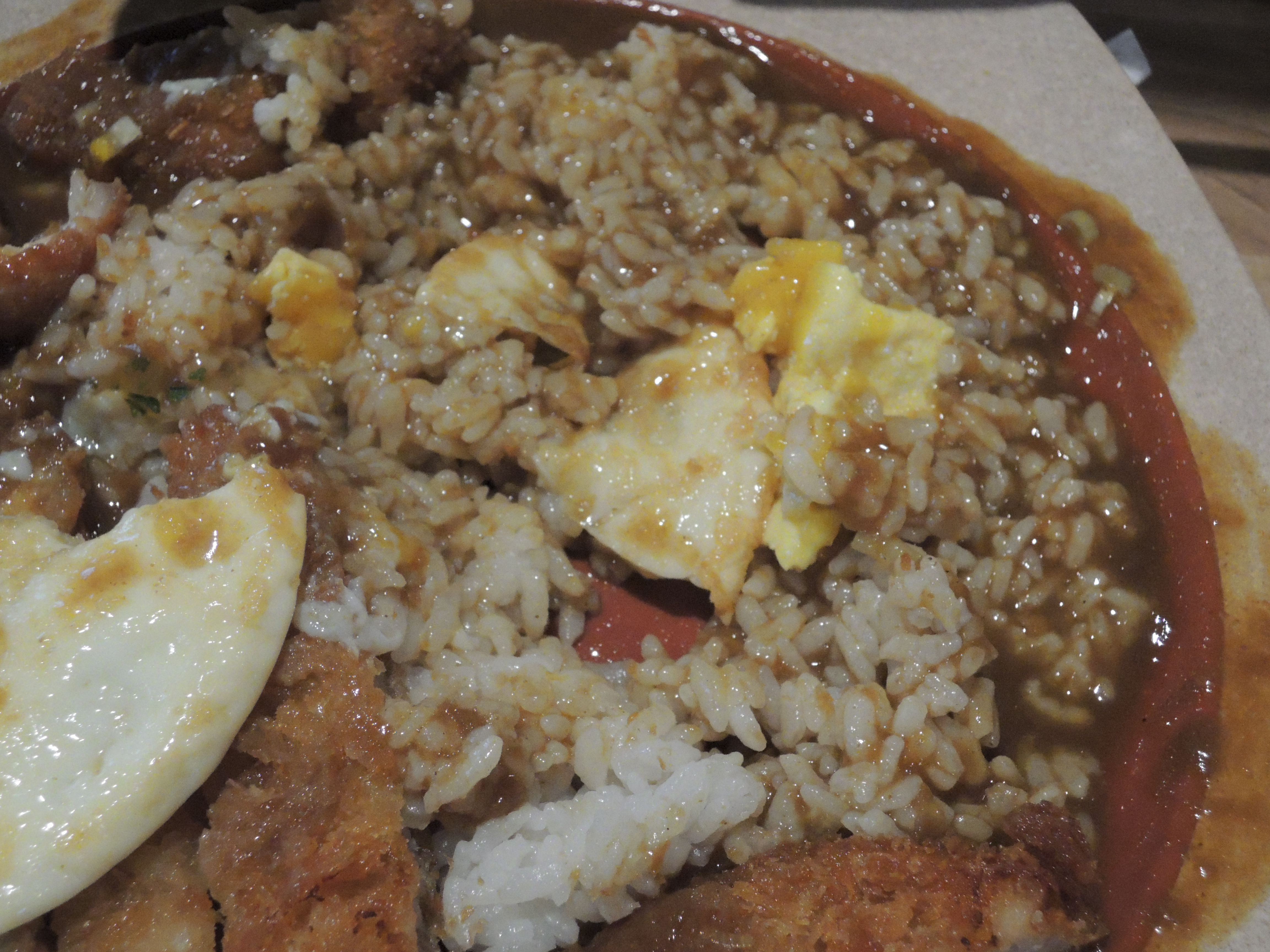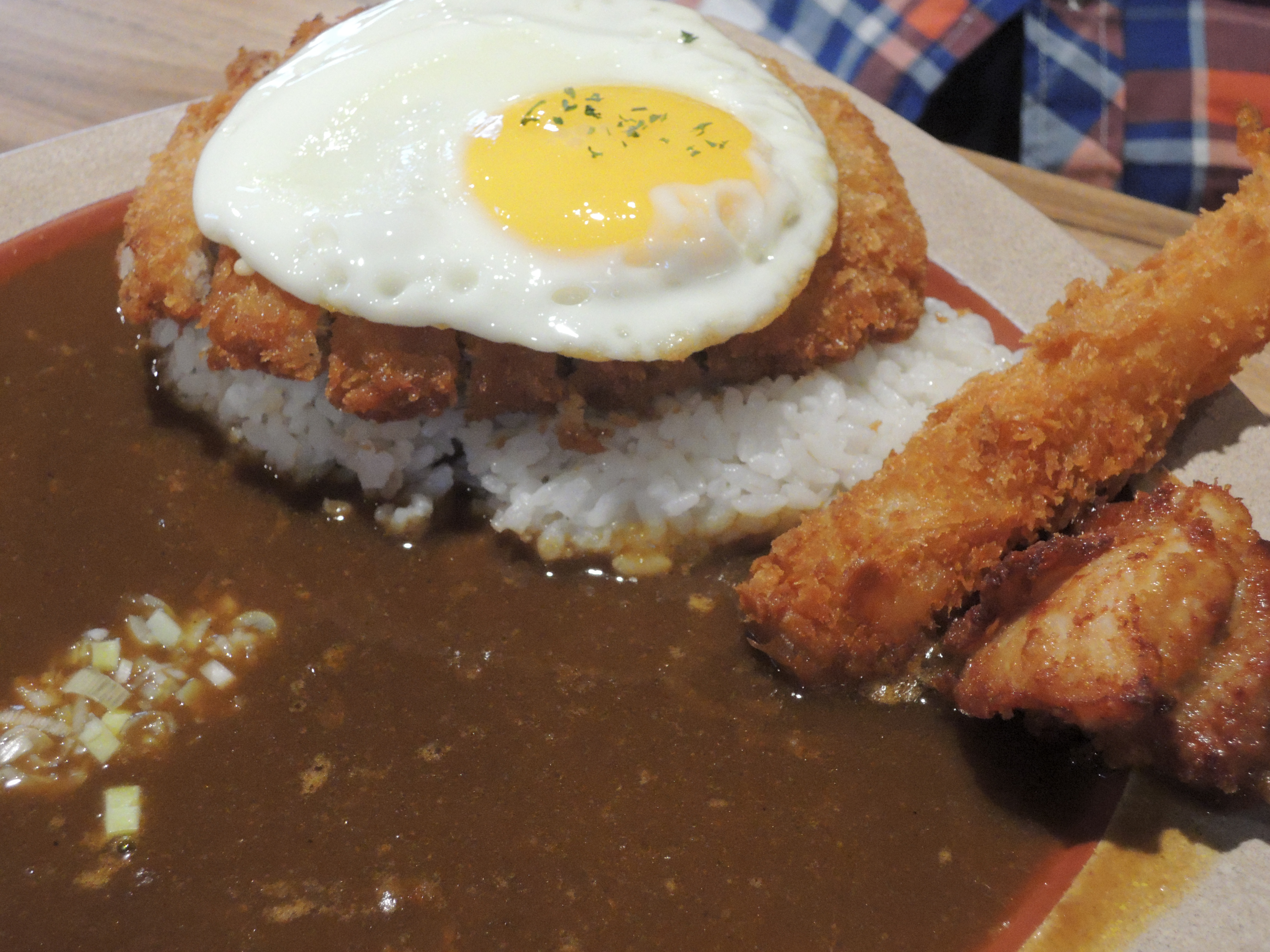 돈까스 카레입니다. 일본풍의 카레색깔이 정말 먹음직스러워보입니다. 돈까스위에 토핑으로 추가한 계란후라이가 올라가있고, 새우튀김도 있습니다.