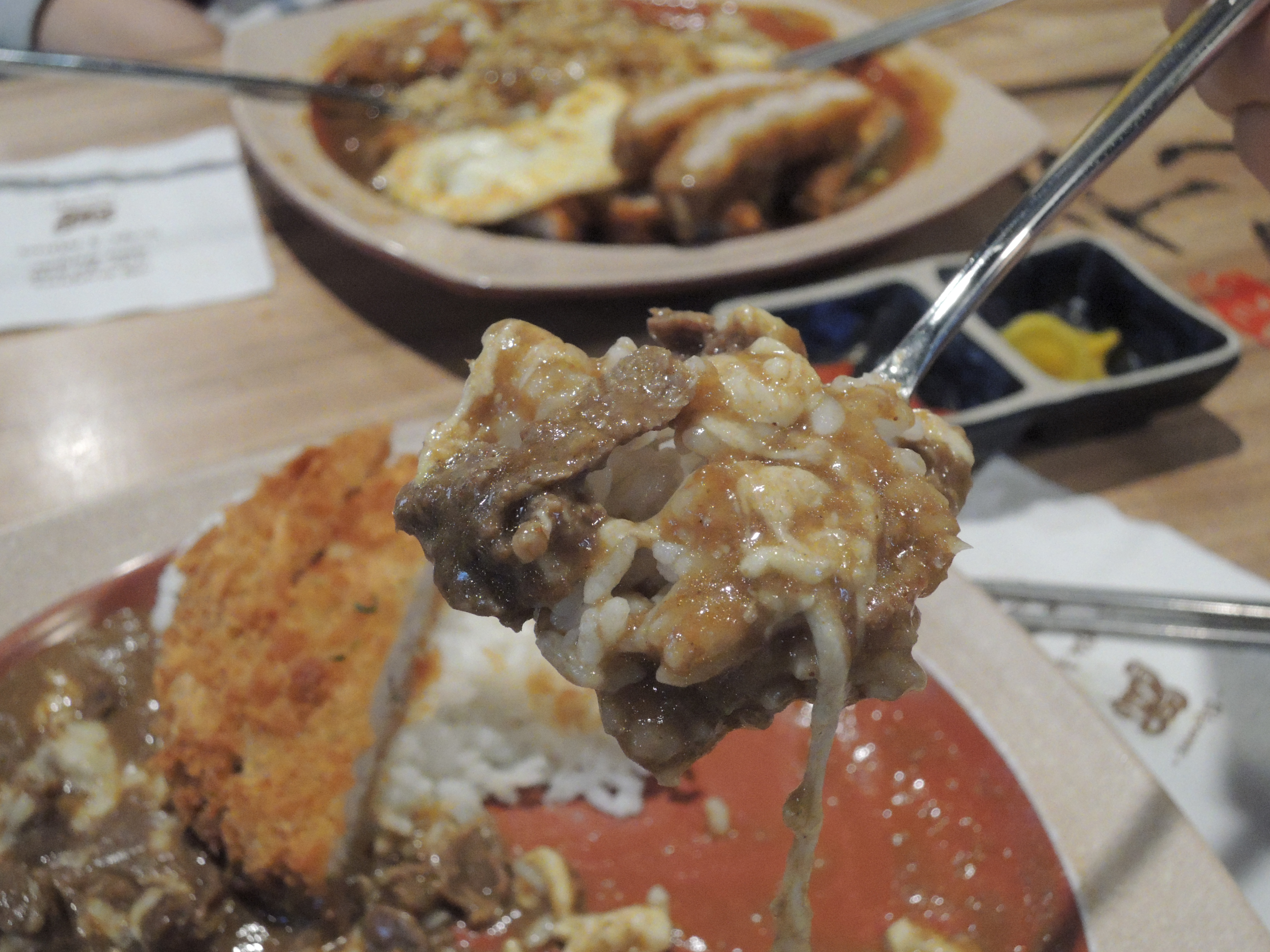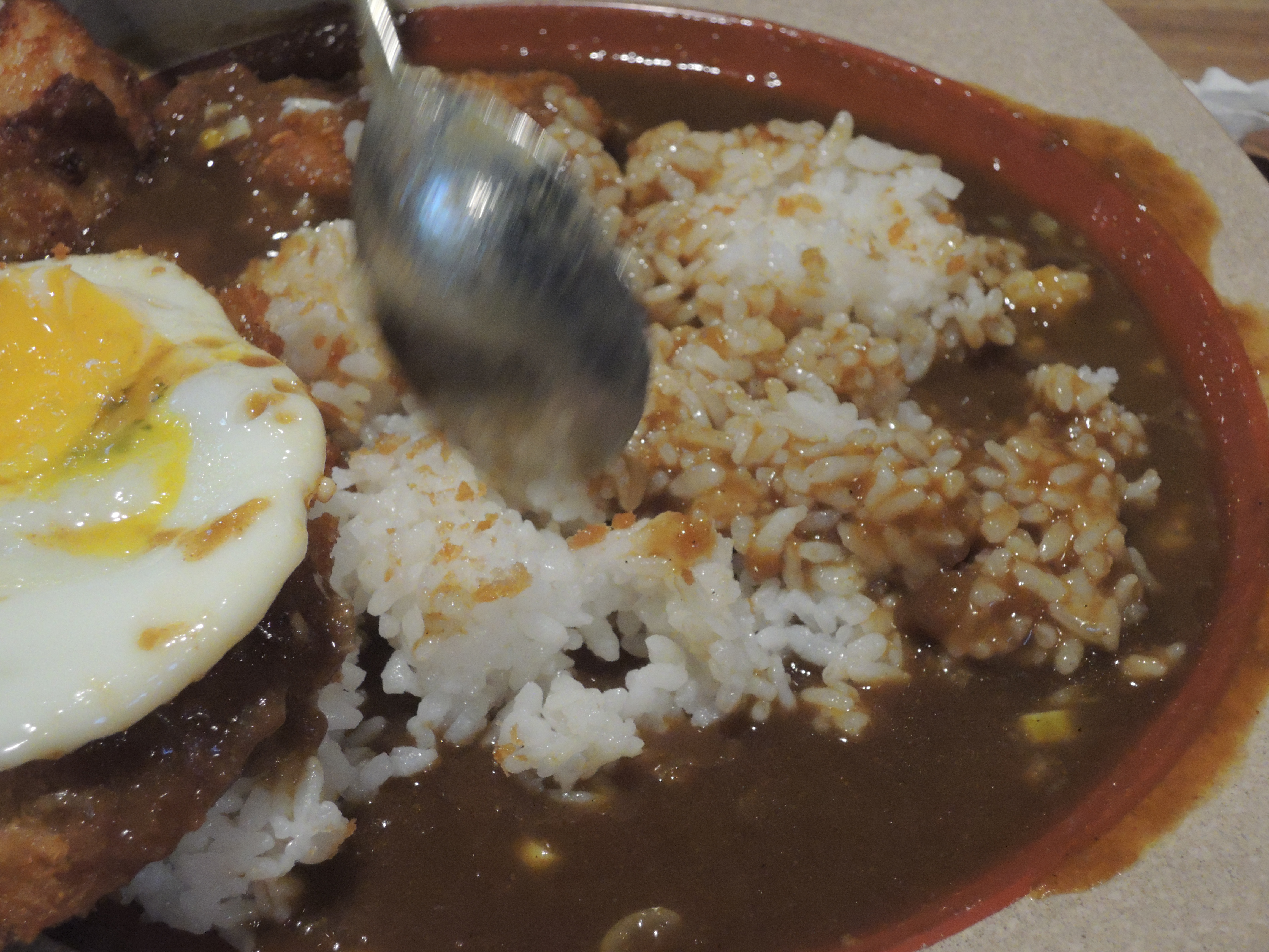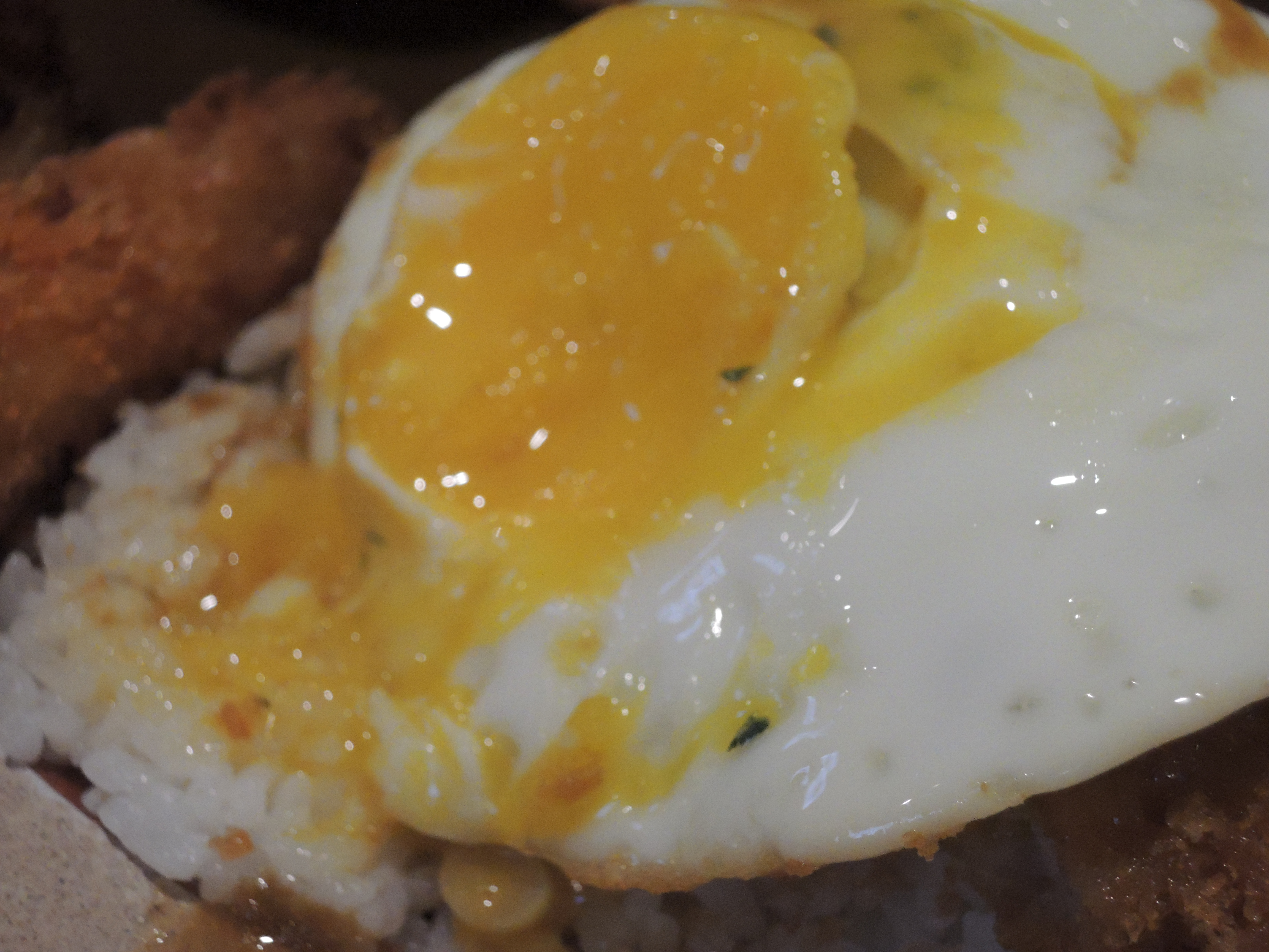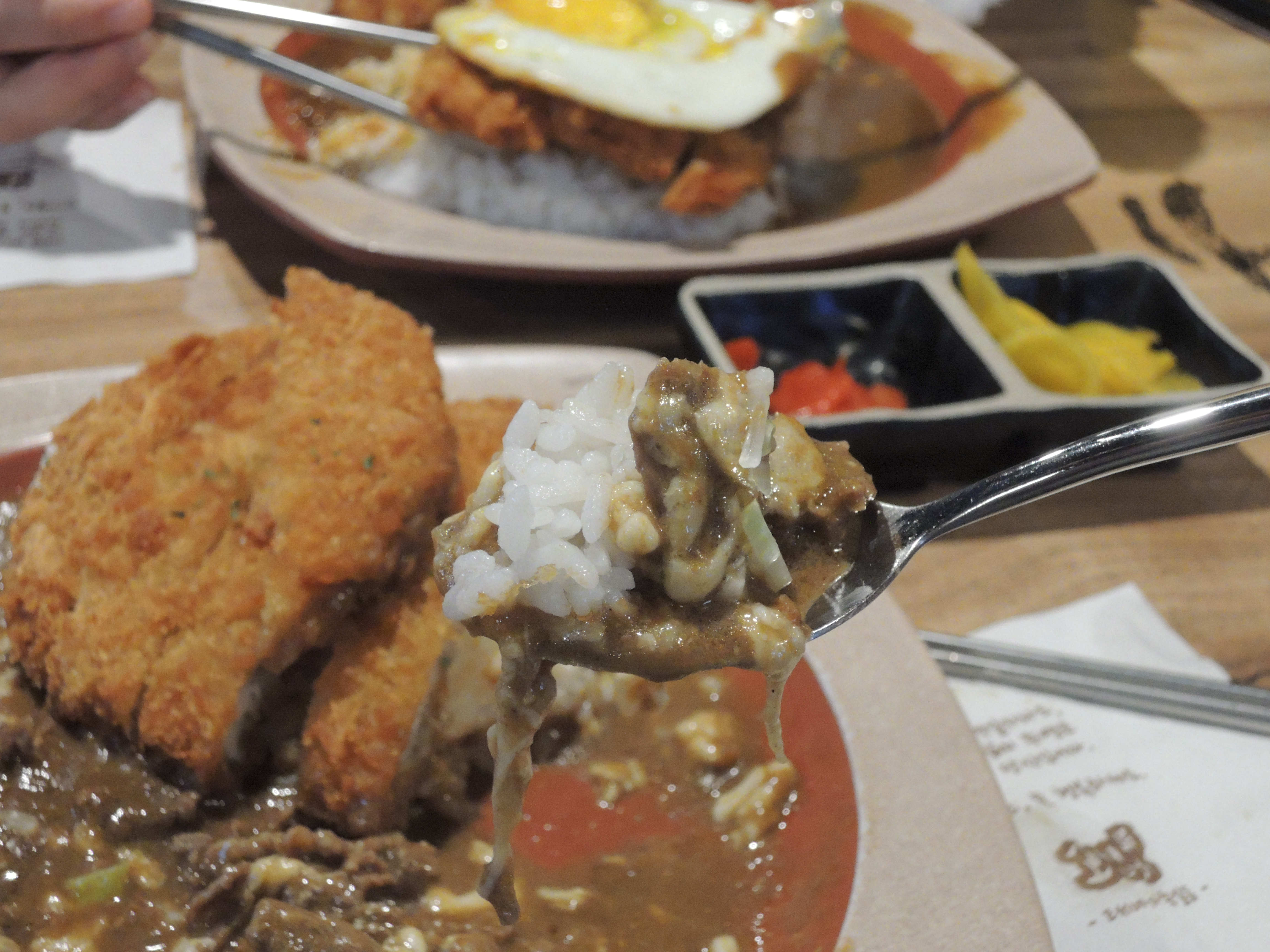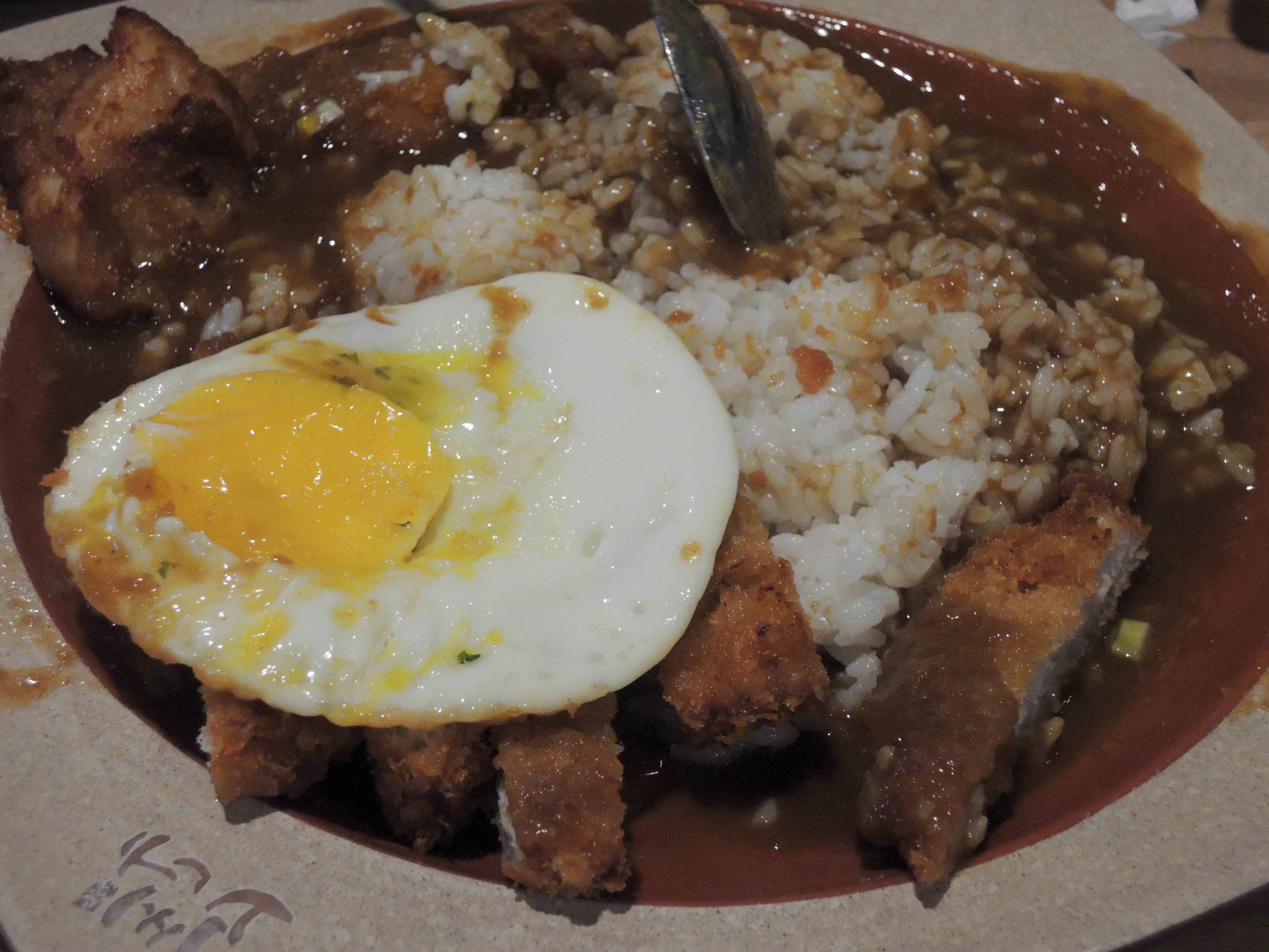돈까스 카레입니다. 일본풍의 카레색깔이 정말 먹음직스러워보입니다. 돈까스위에 토핑으로 추가한 계란후라이가 올라가있고, 새우튀김도 있습니다.