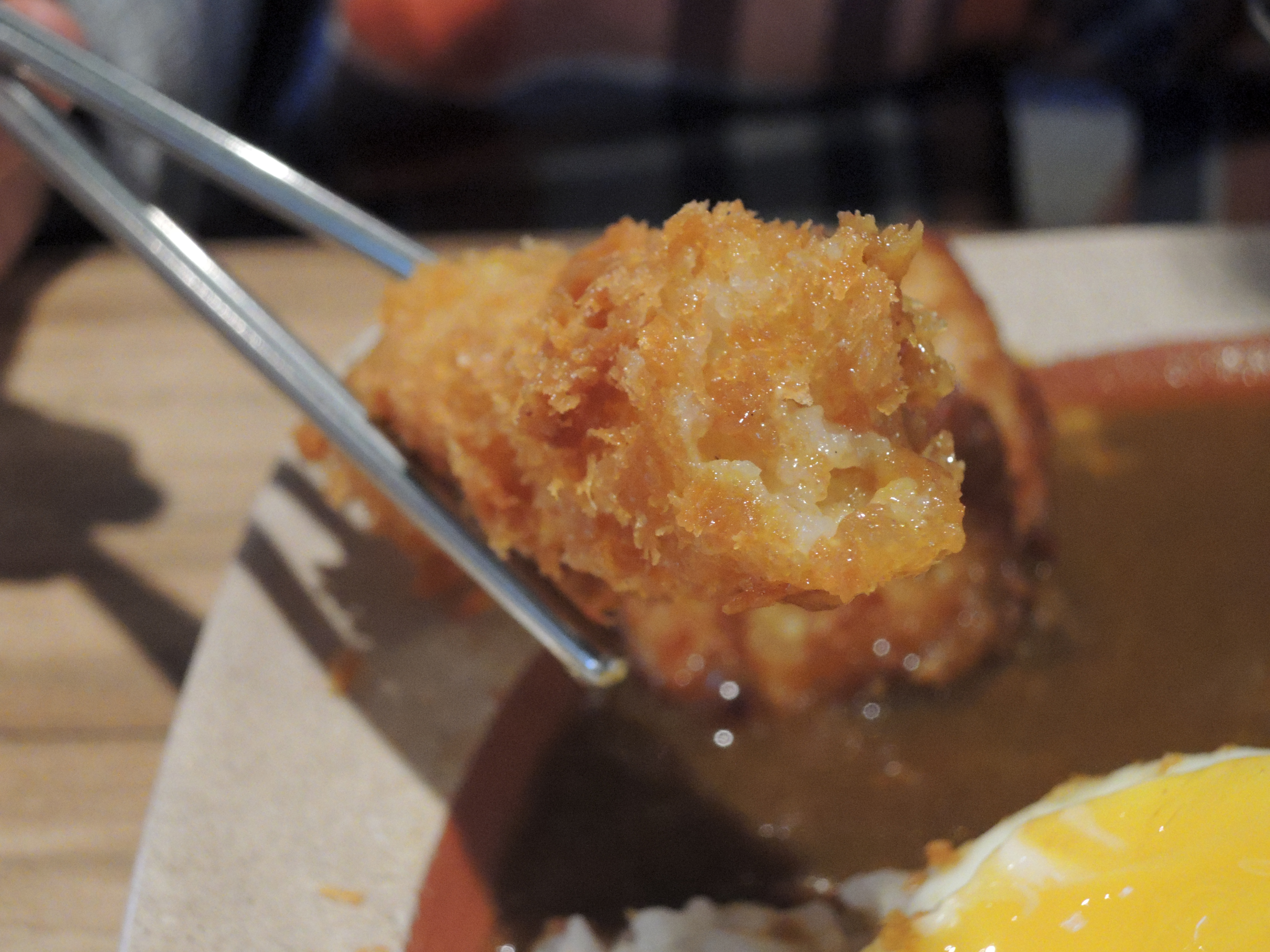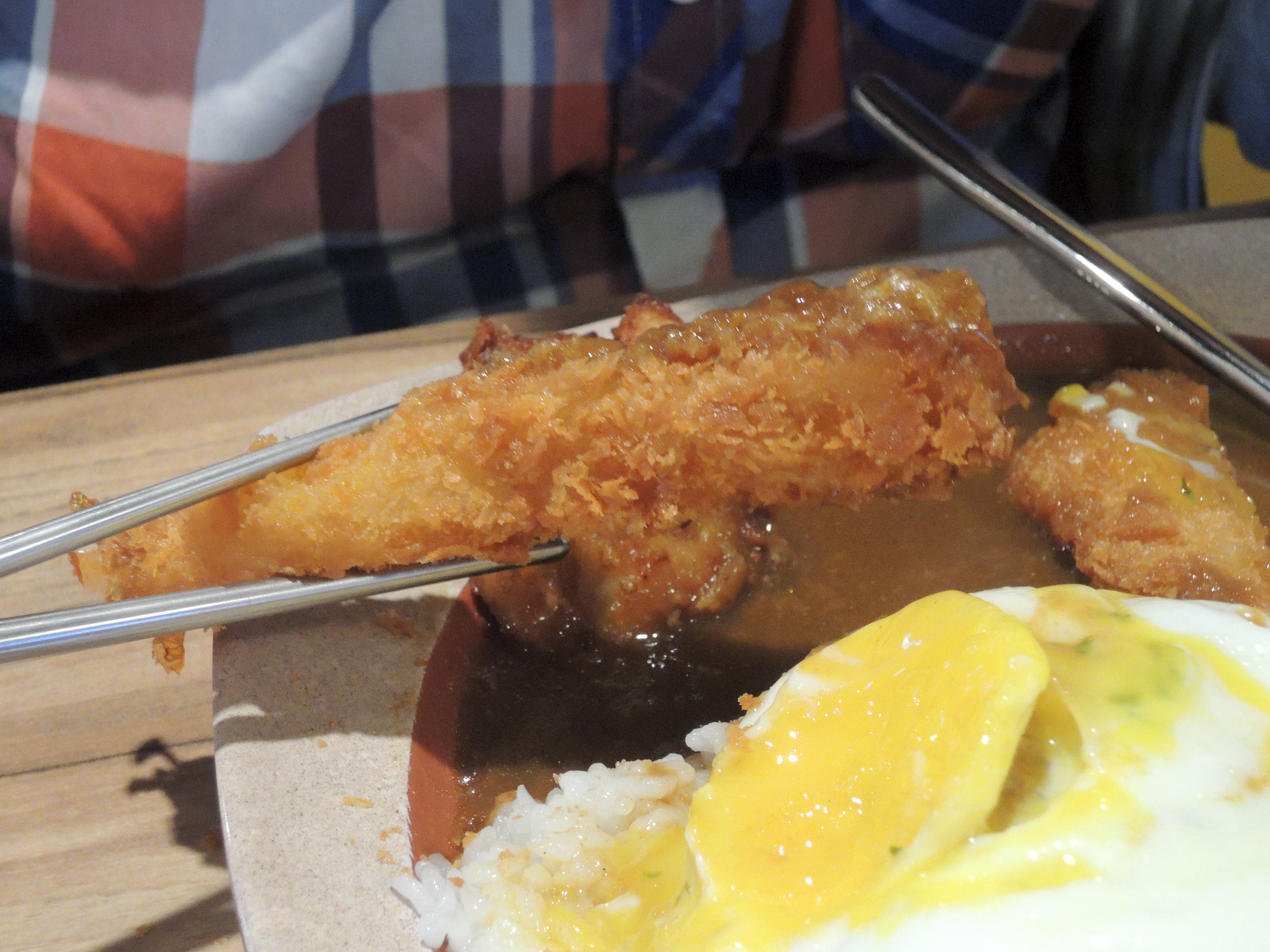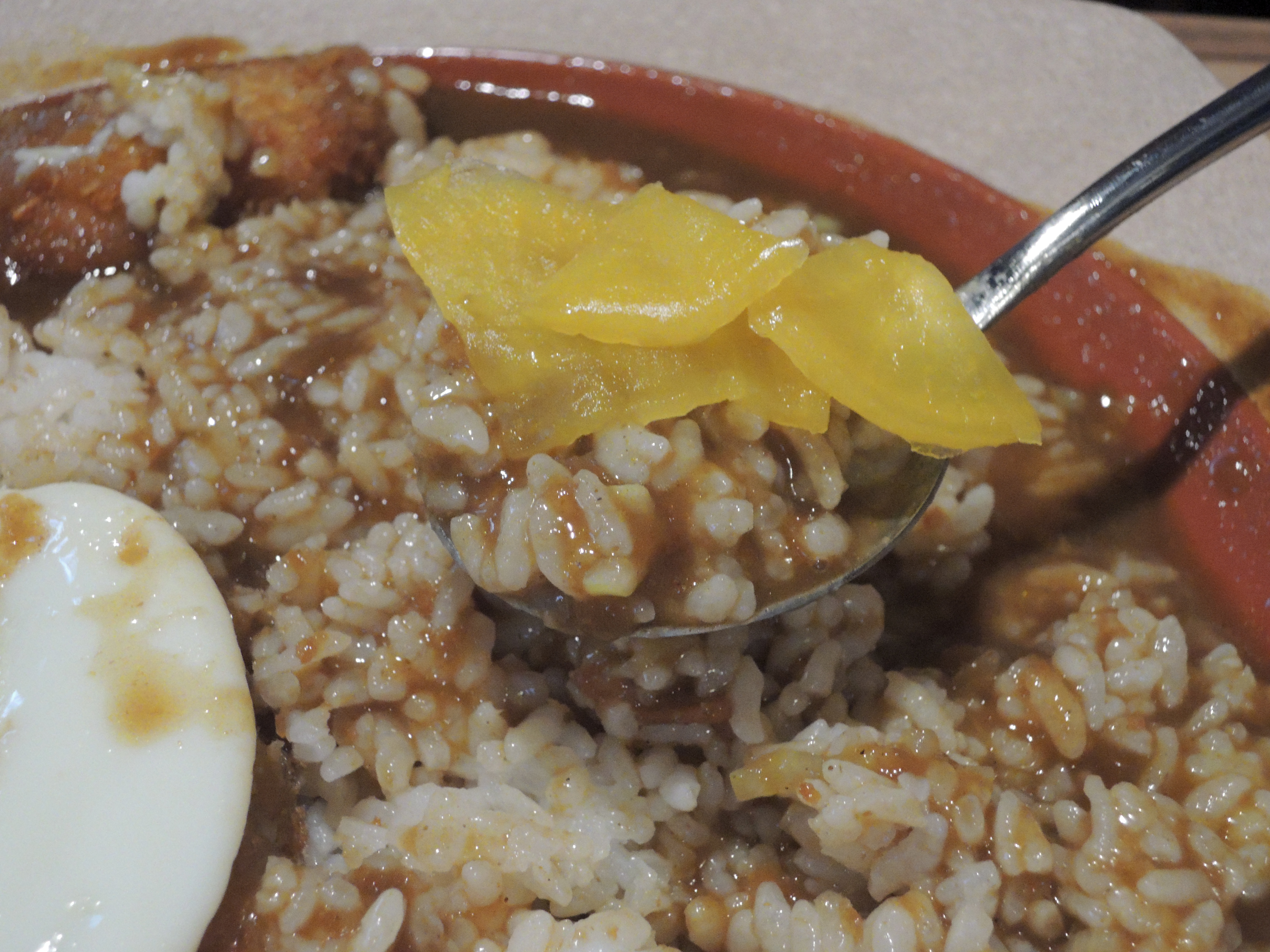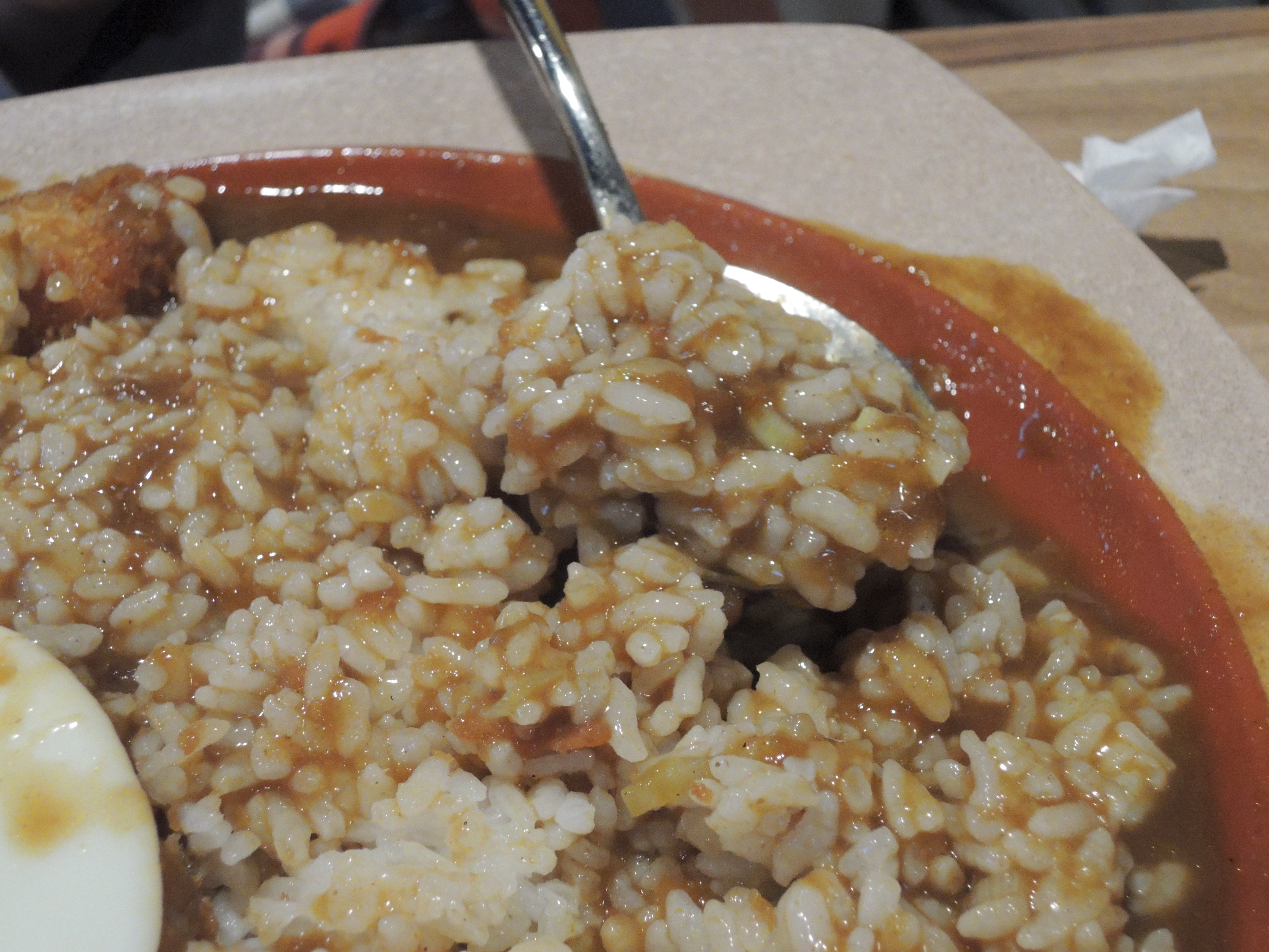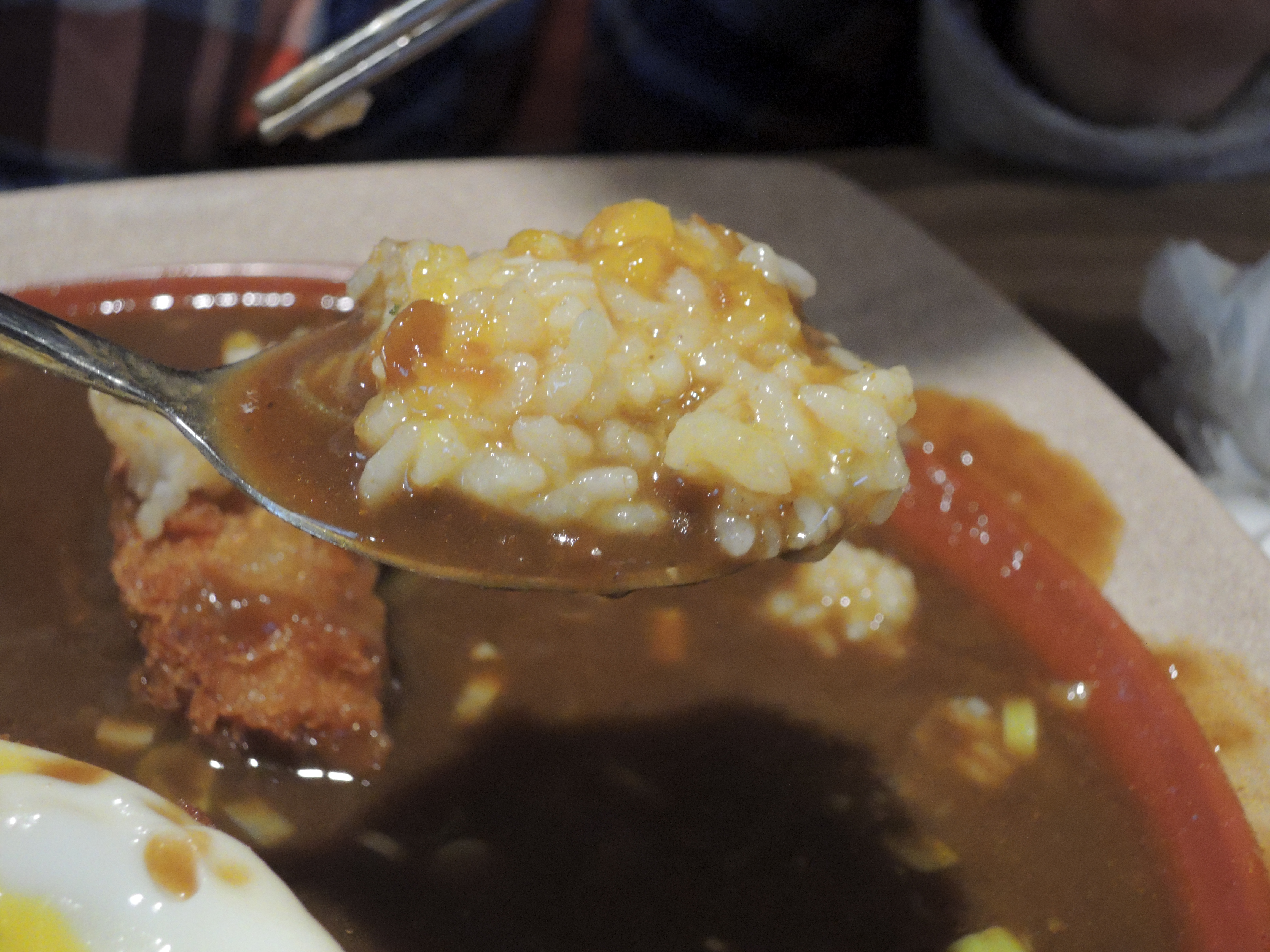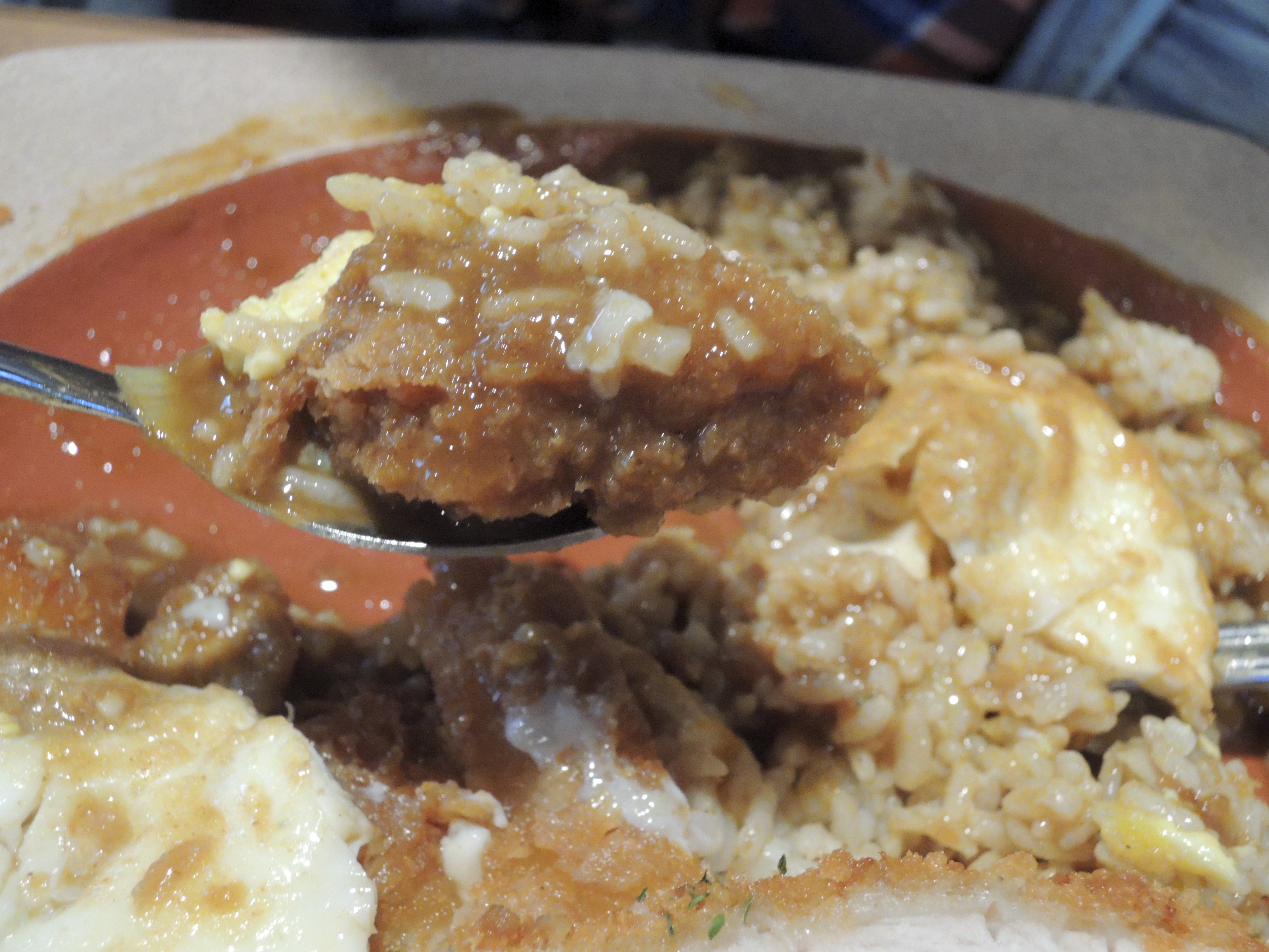 돈까스 카레입니다. 일본풍의 카레색깔이 정말 먹음직스러워보입니다. 돈까스위에 토핑으로 추가한 계란후라이가 올라가있고, 새우튀김도 있습니다.