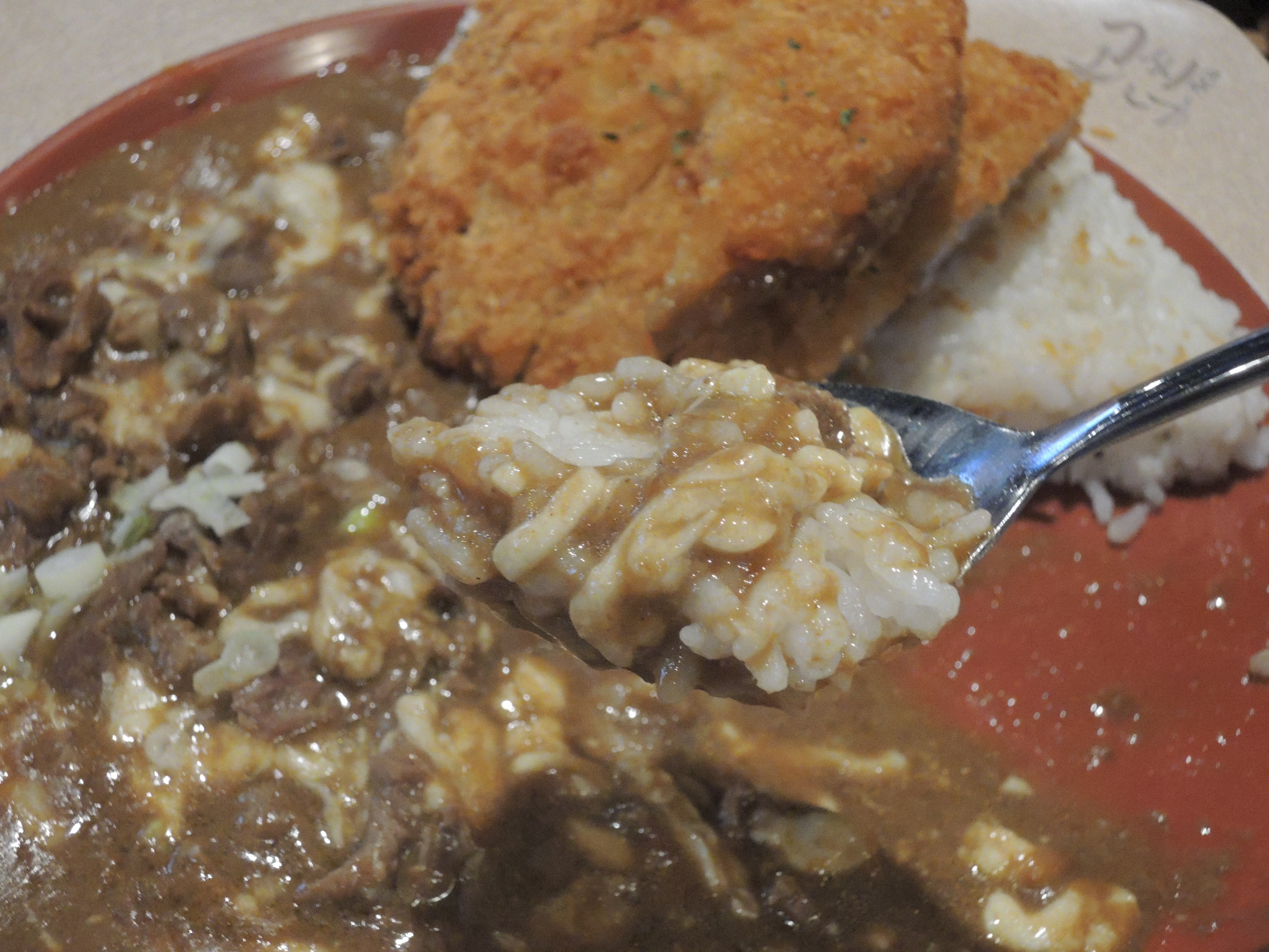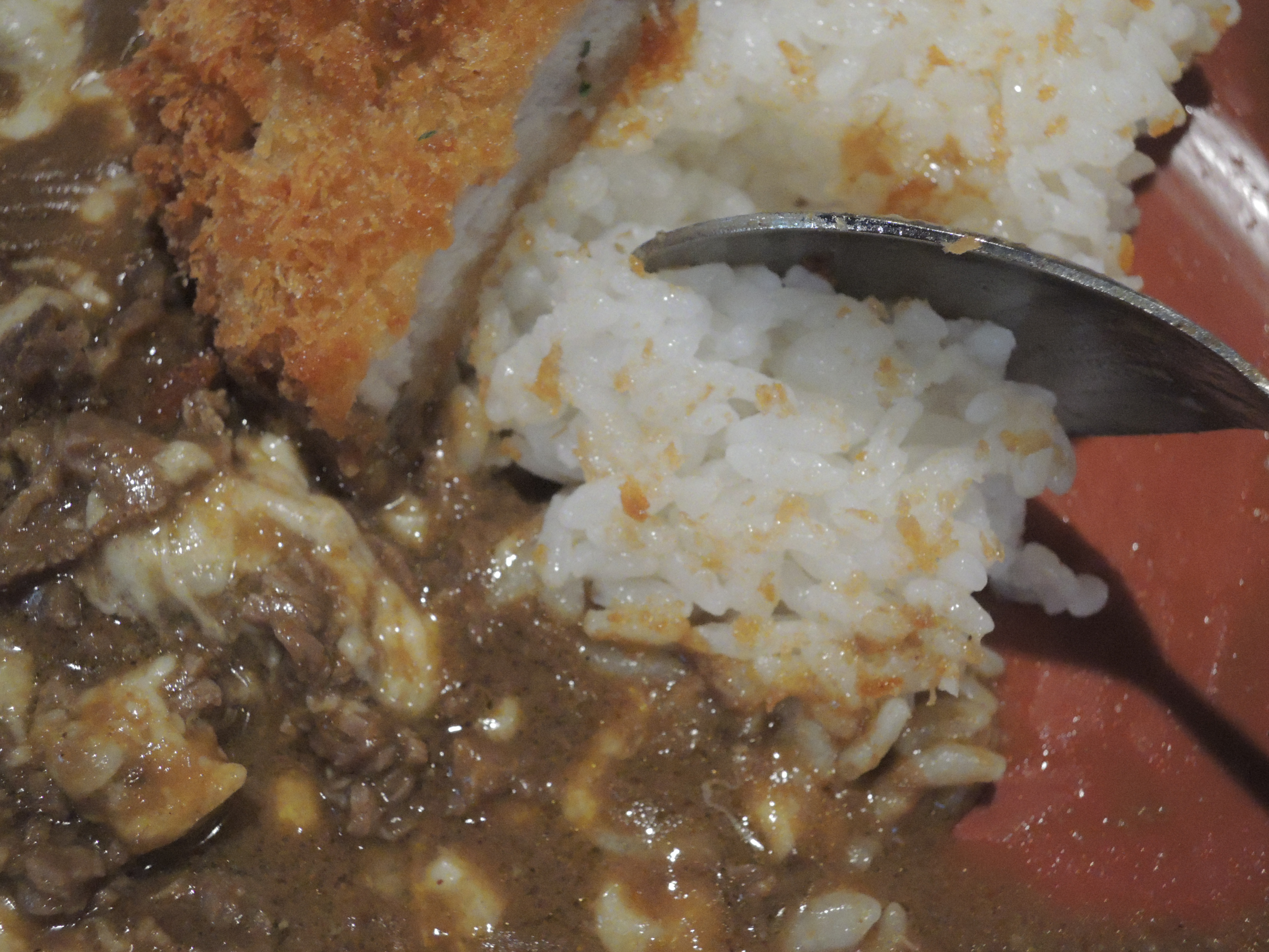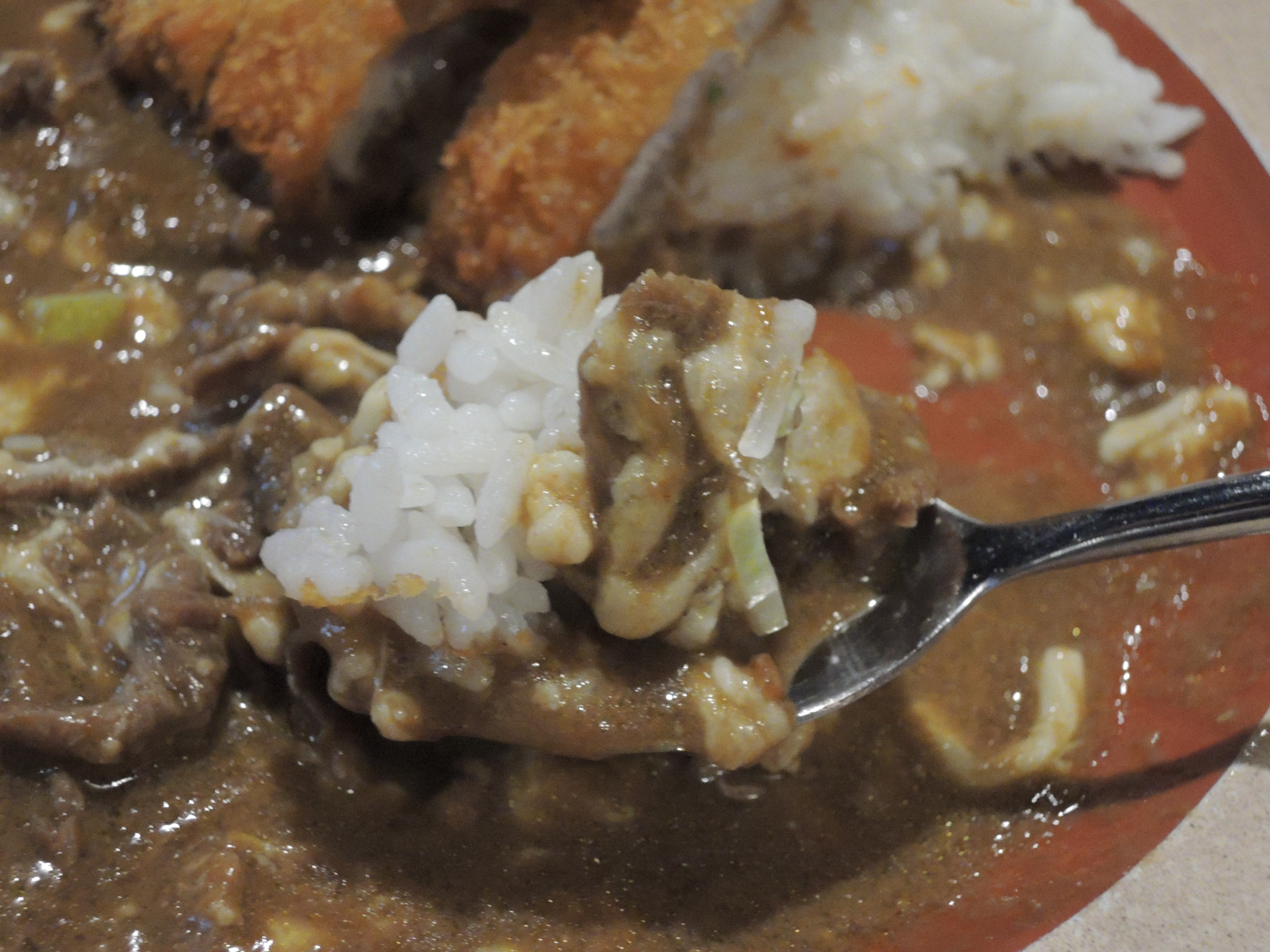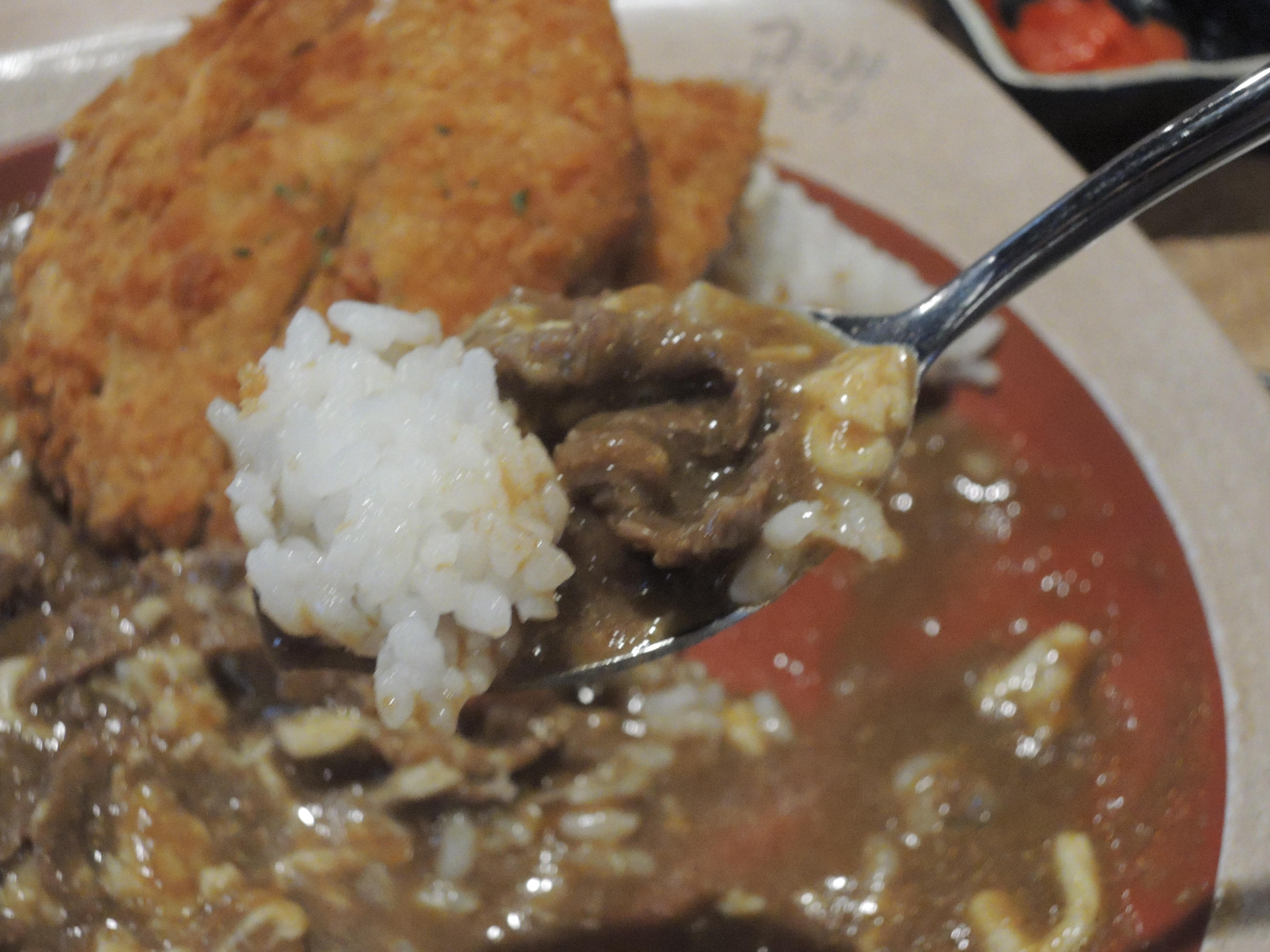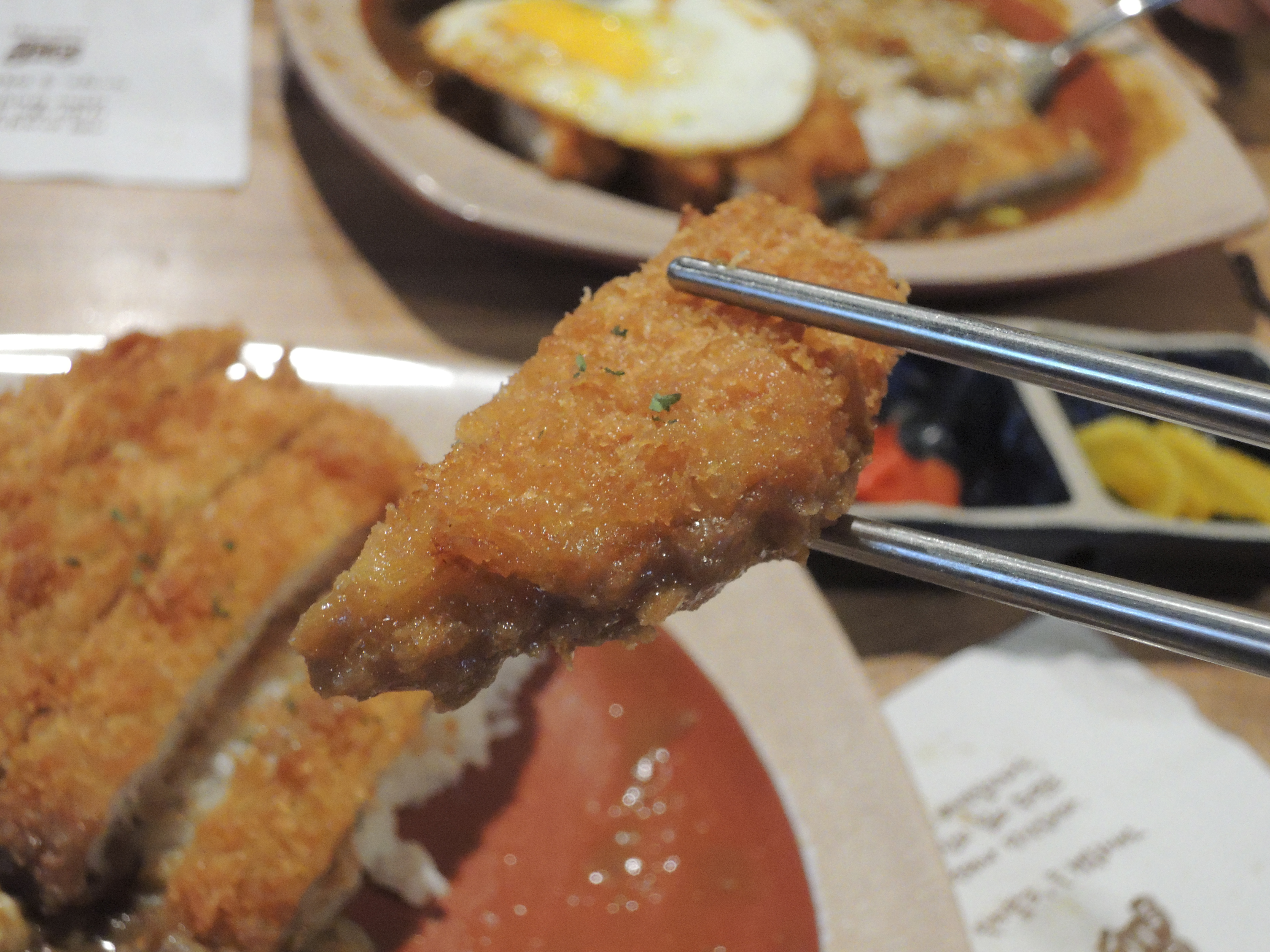 돈까스 카레입니다. 일본풍의 카레색깔이 정말 먹음직스러워보입니다. 돈까스위에 토핑으로 추가한 계란후라이가 올라가있고, 새우튀김도 있습니다.