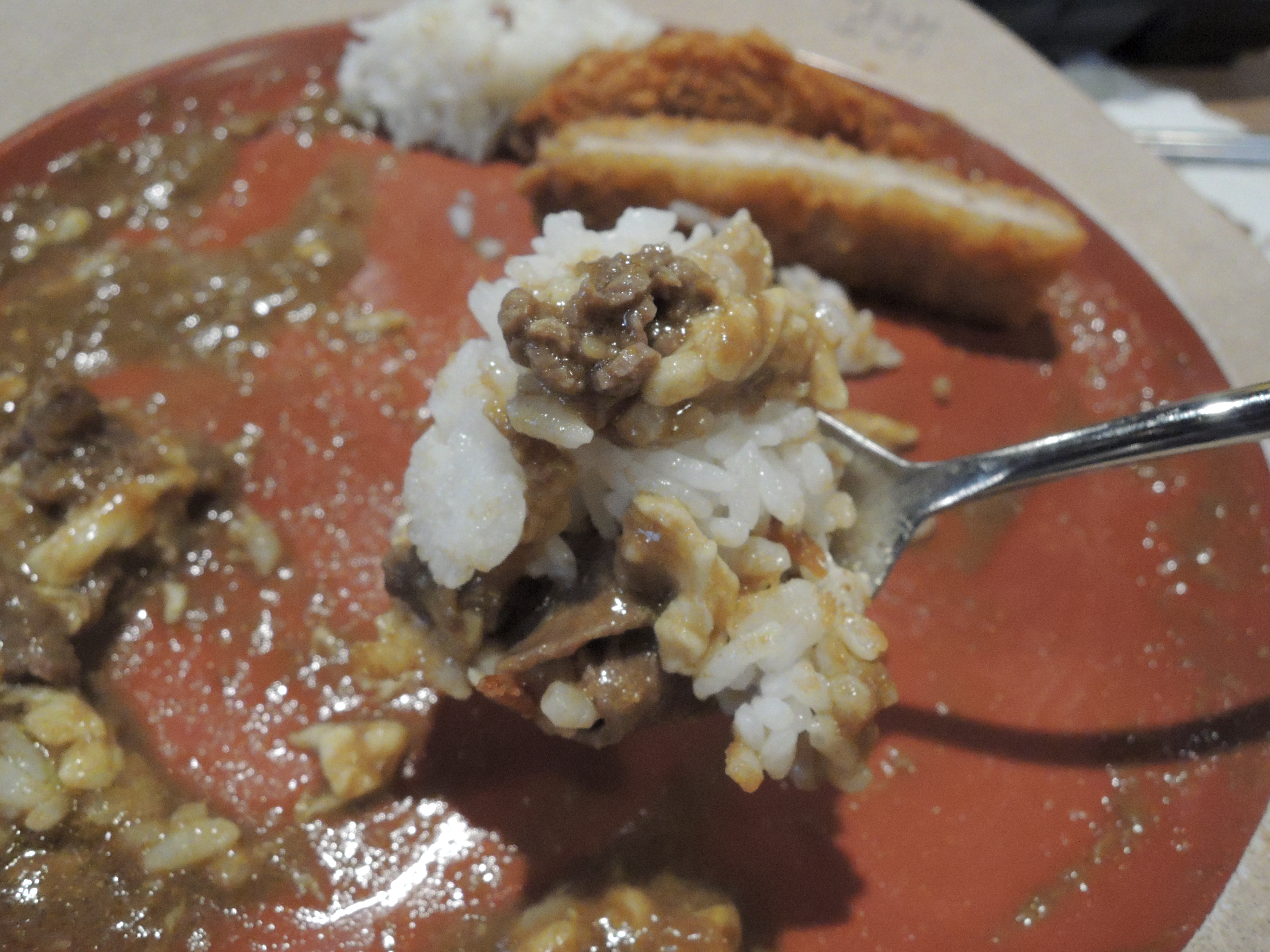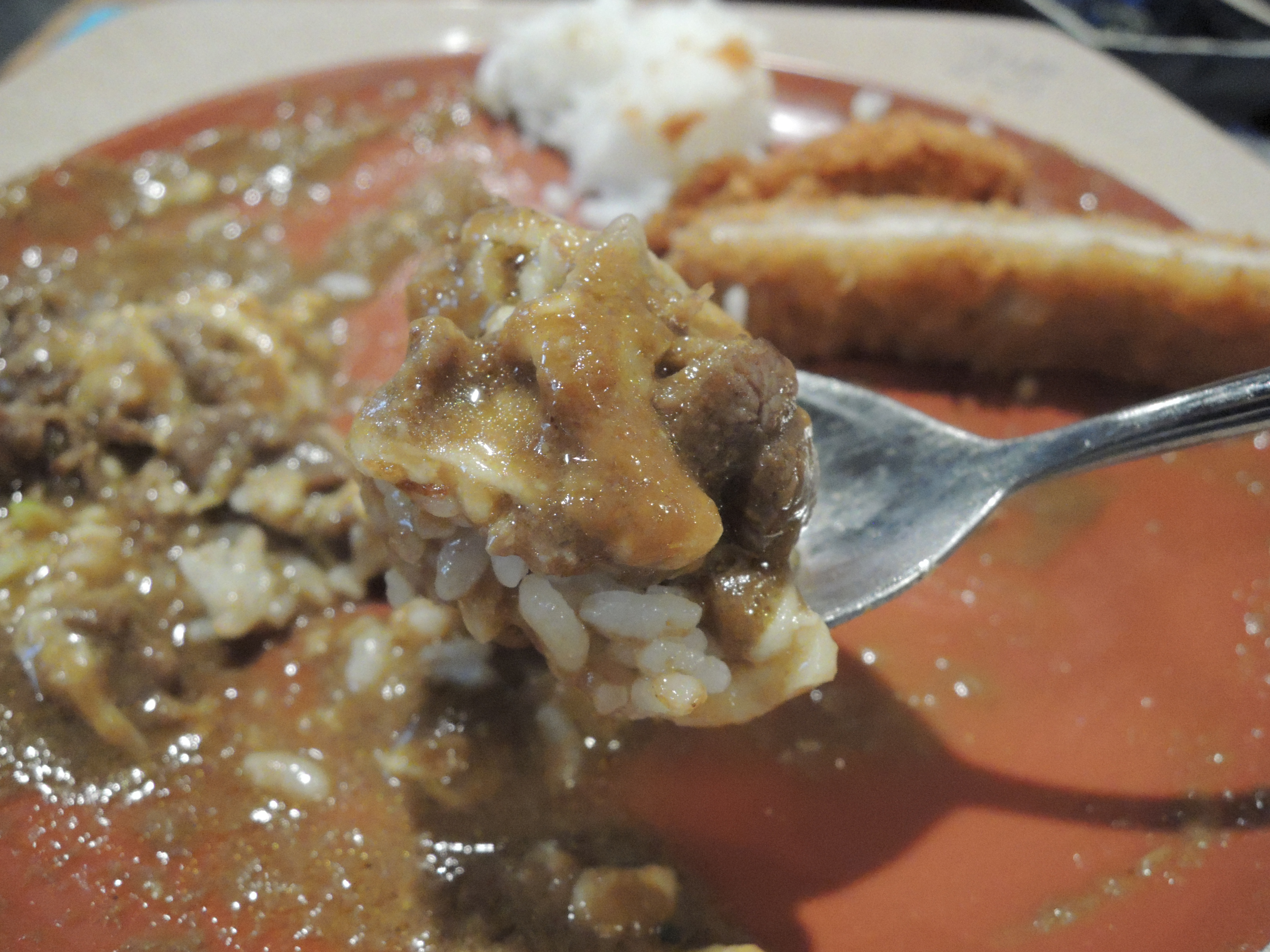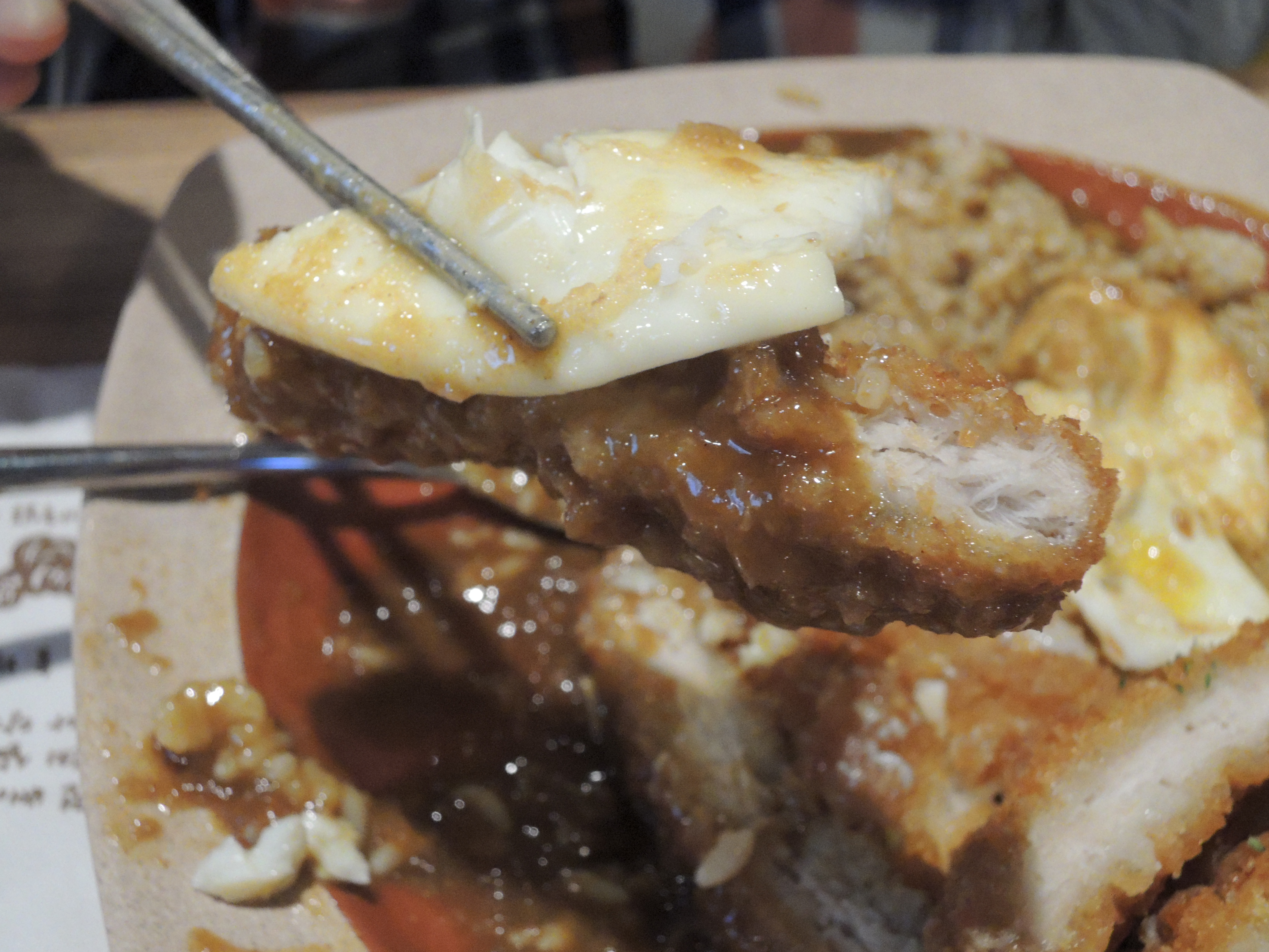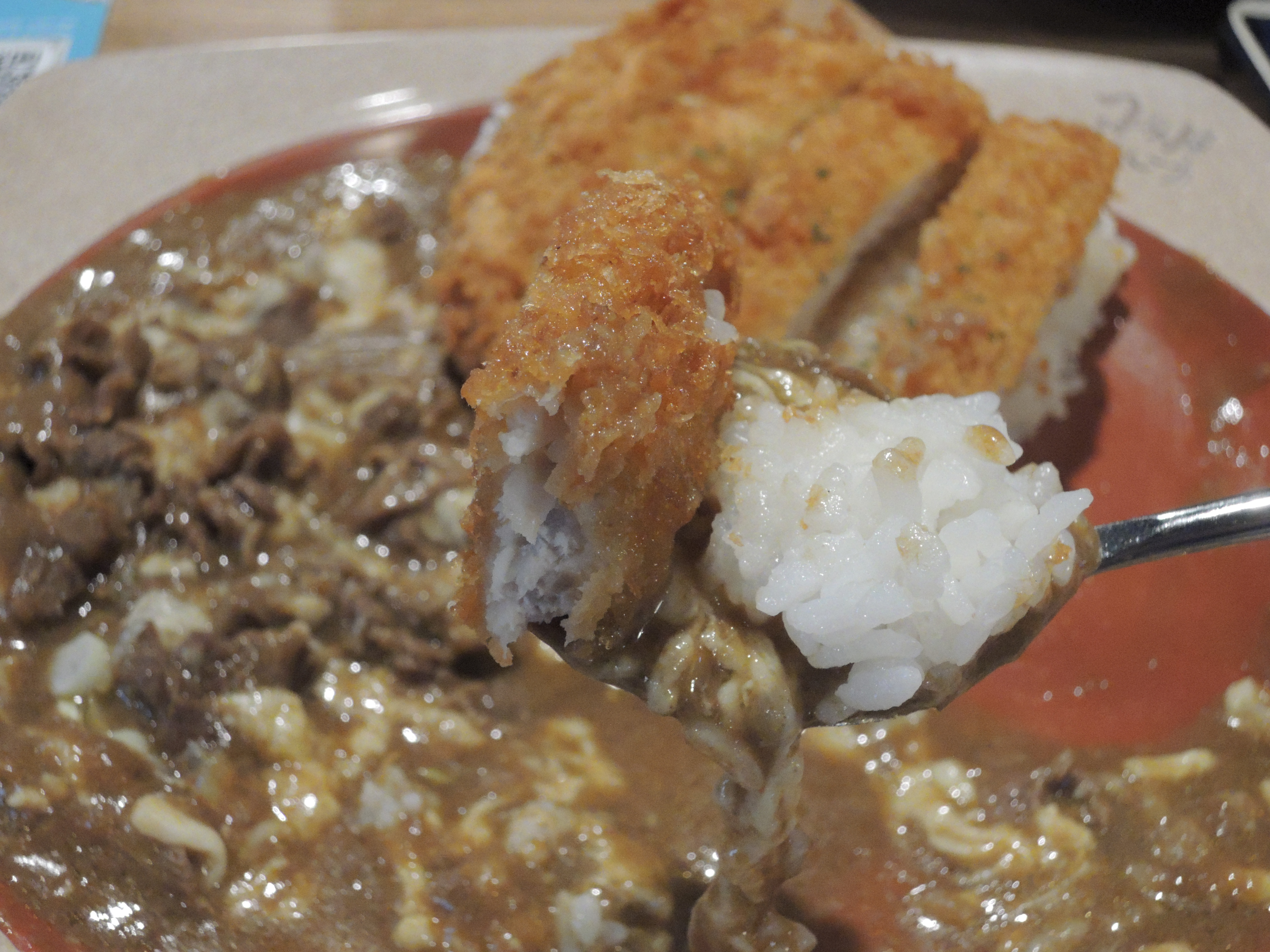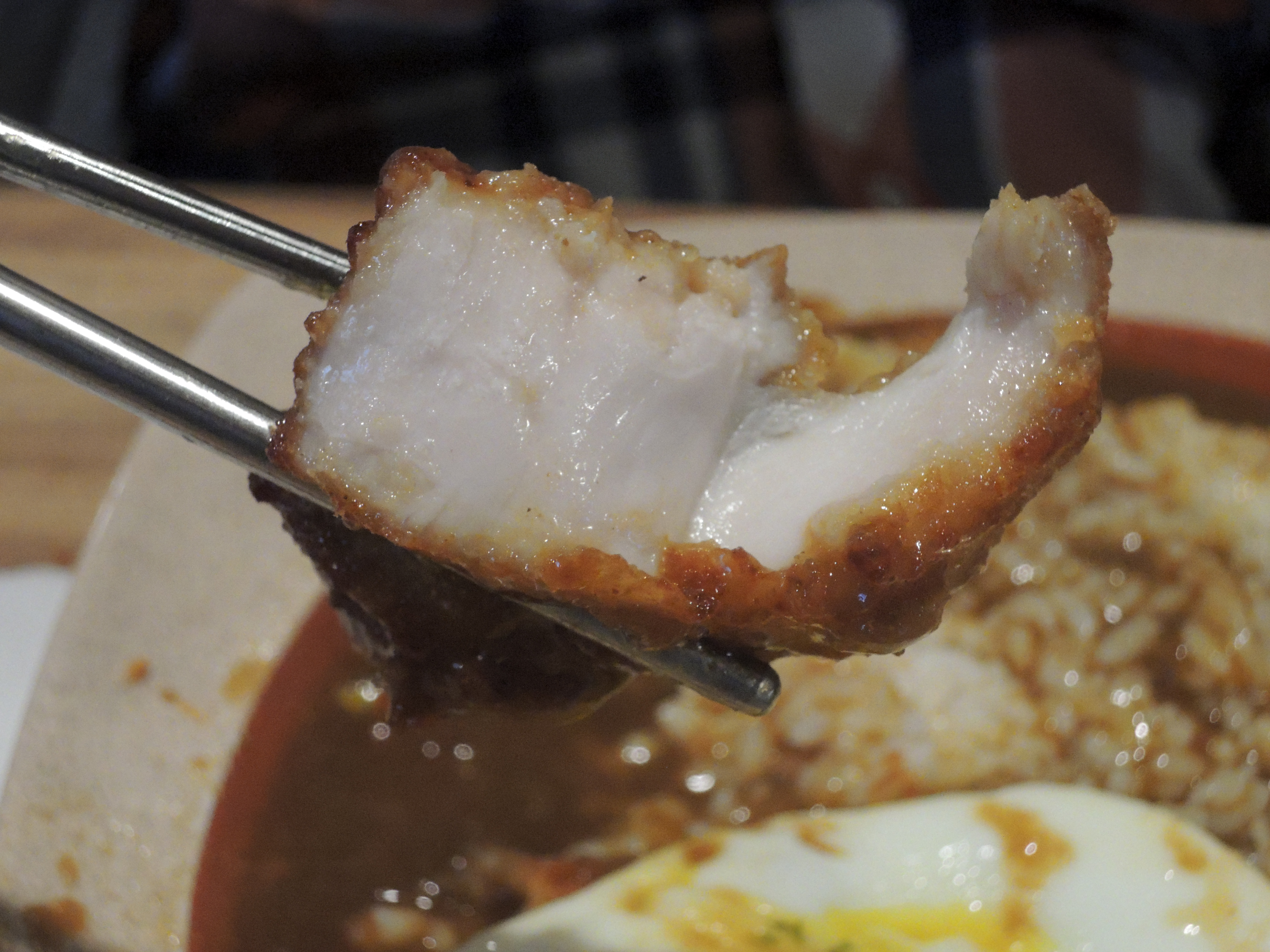 돈까스 카레입니다. 일본풍의 카레색깔이 정말 먹음직스러워보입니다. 돈까스위에 토핑으로 추가한 계란후라이가 올라가있고, 새우튀김도 있습니다.