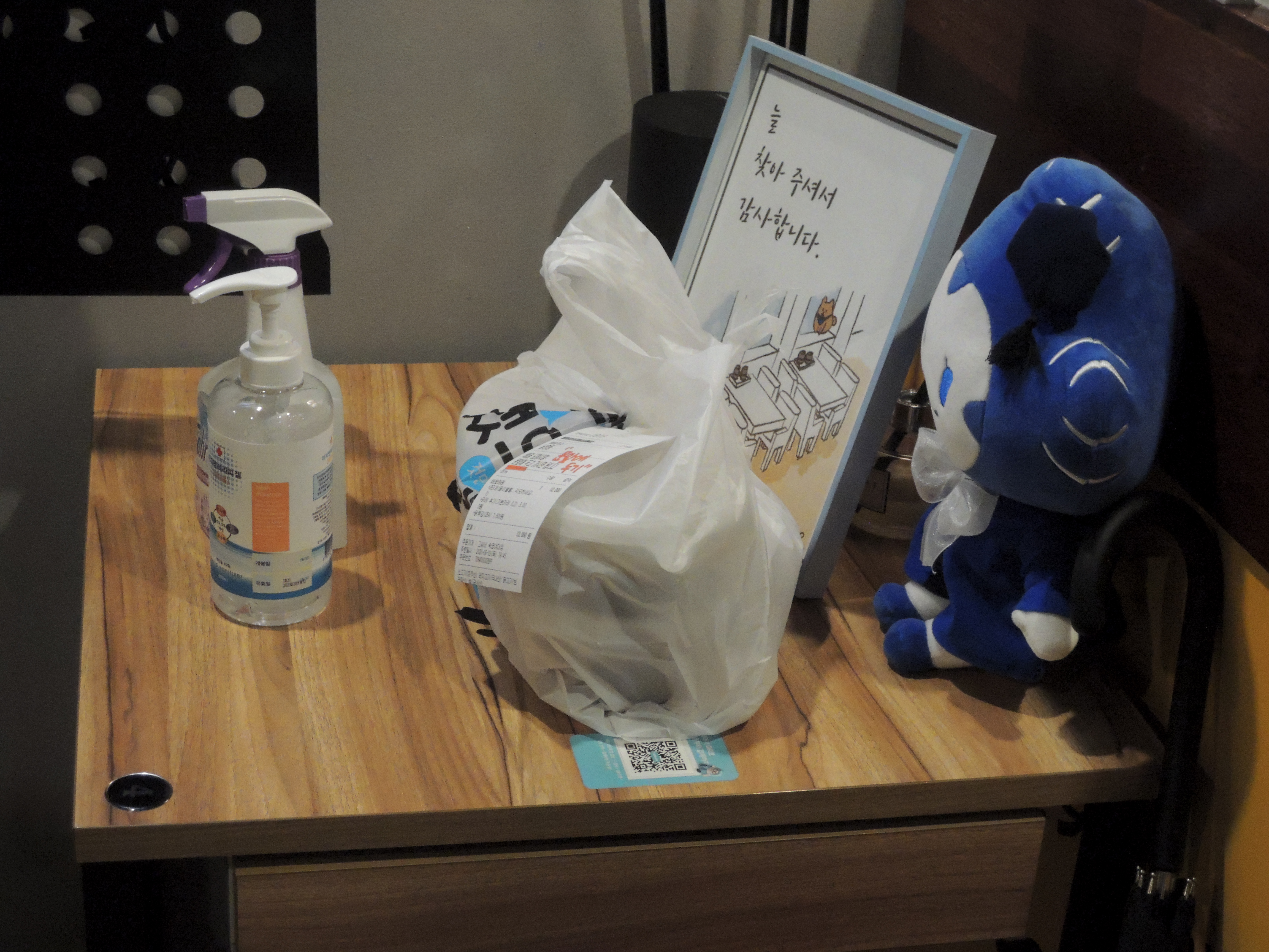 코로나예방을 위한 손소독제 당연히 입구에 마련되어 있습니다. 입구에 왜 테이블을 놓았나 싶었는데, 배달주문이 오면 여기에 포장해서 배달원께서 찾아가기 쉽게 하는 용도네요.