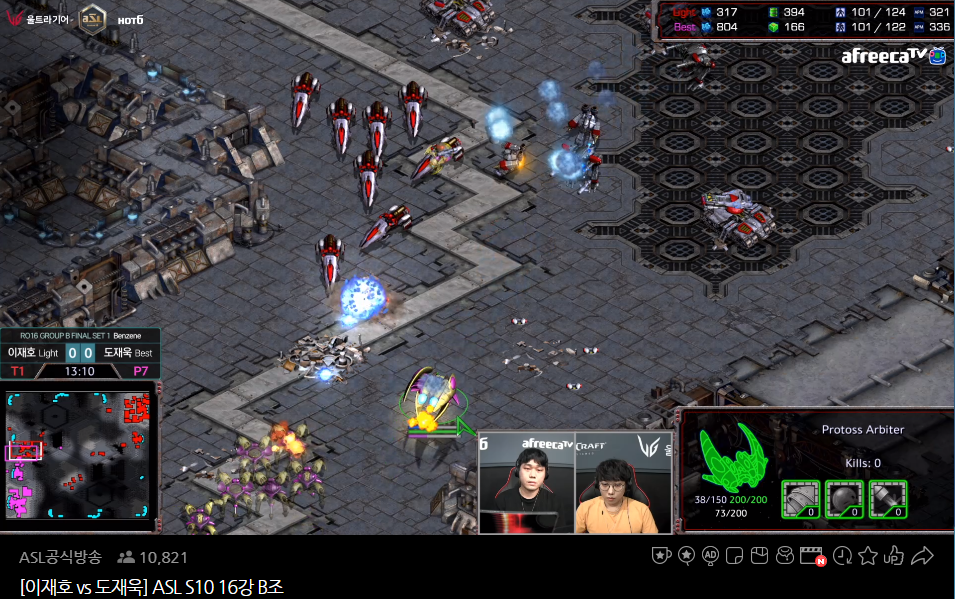 도재욱선수는 고전끝에 이재호선수의 앞마당 병력을 걷어내는데 성공하지만, 조금 뒷쪽에 이재호선수의 메카닉진영이 완성이 되고요. 도재욱선수는 전투과정에서 아비터마저 잃습니다.