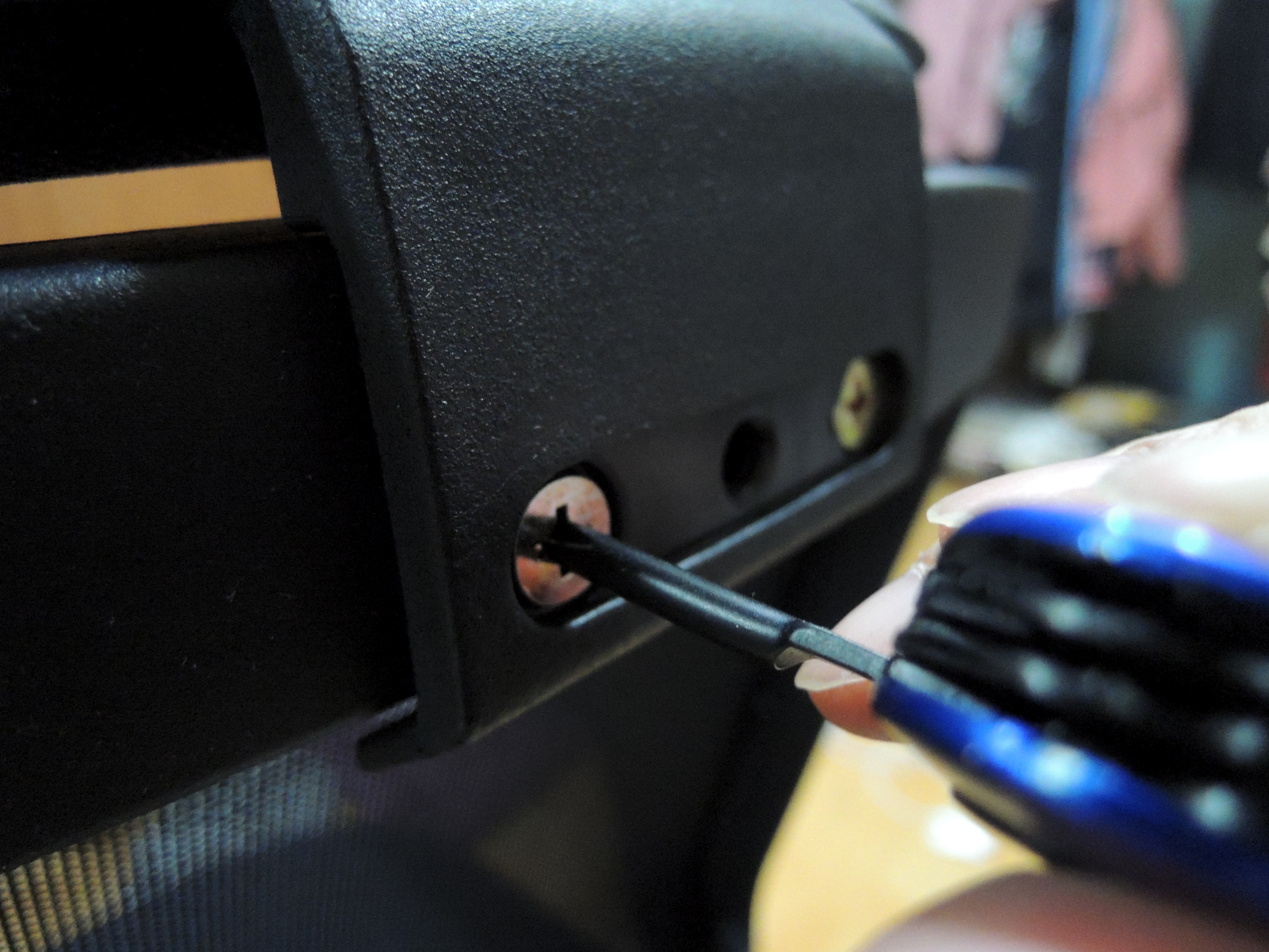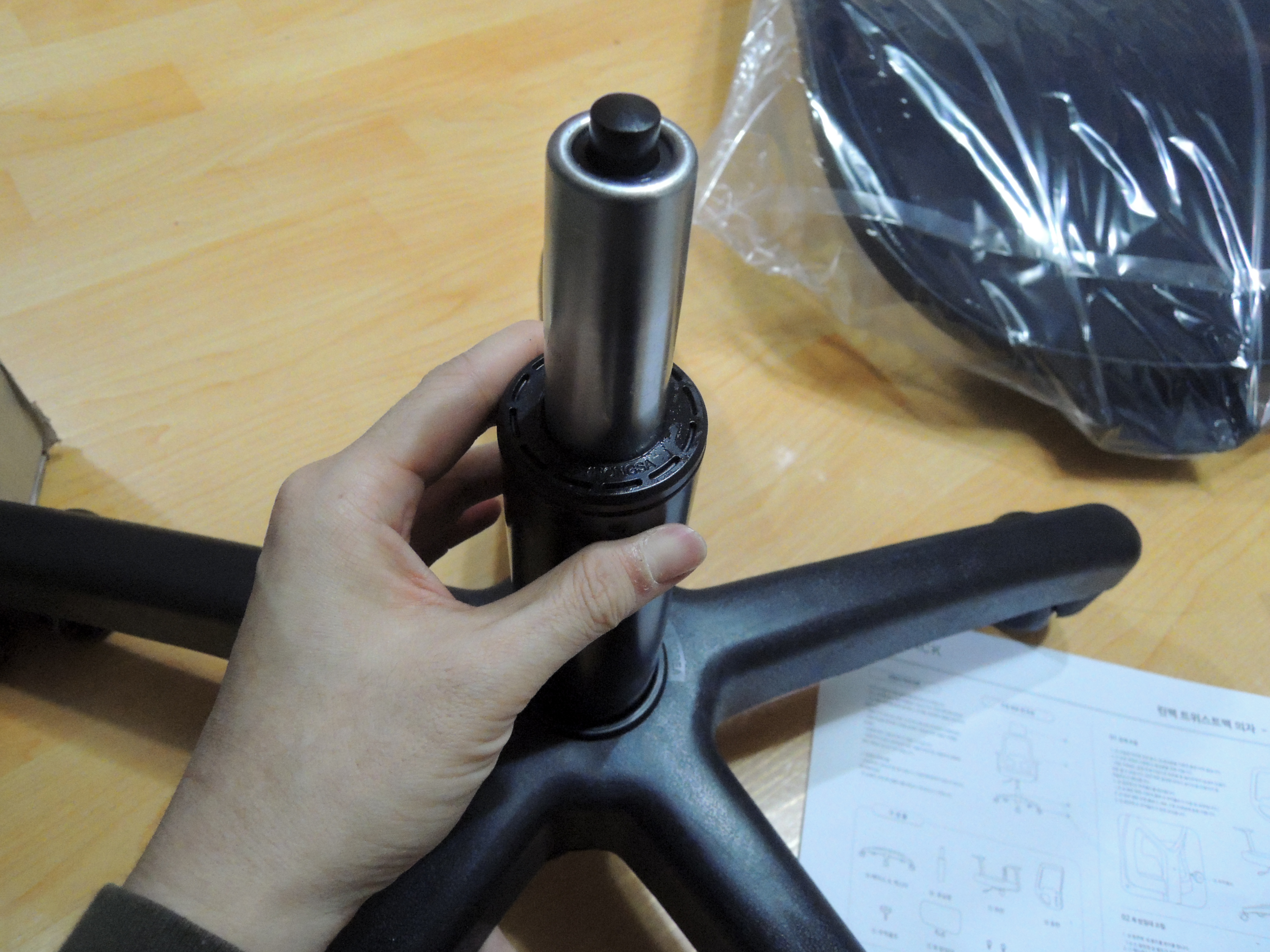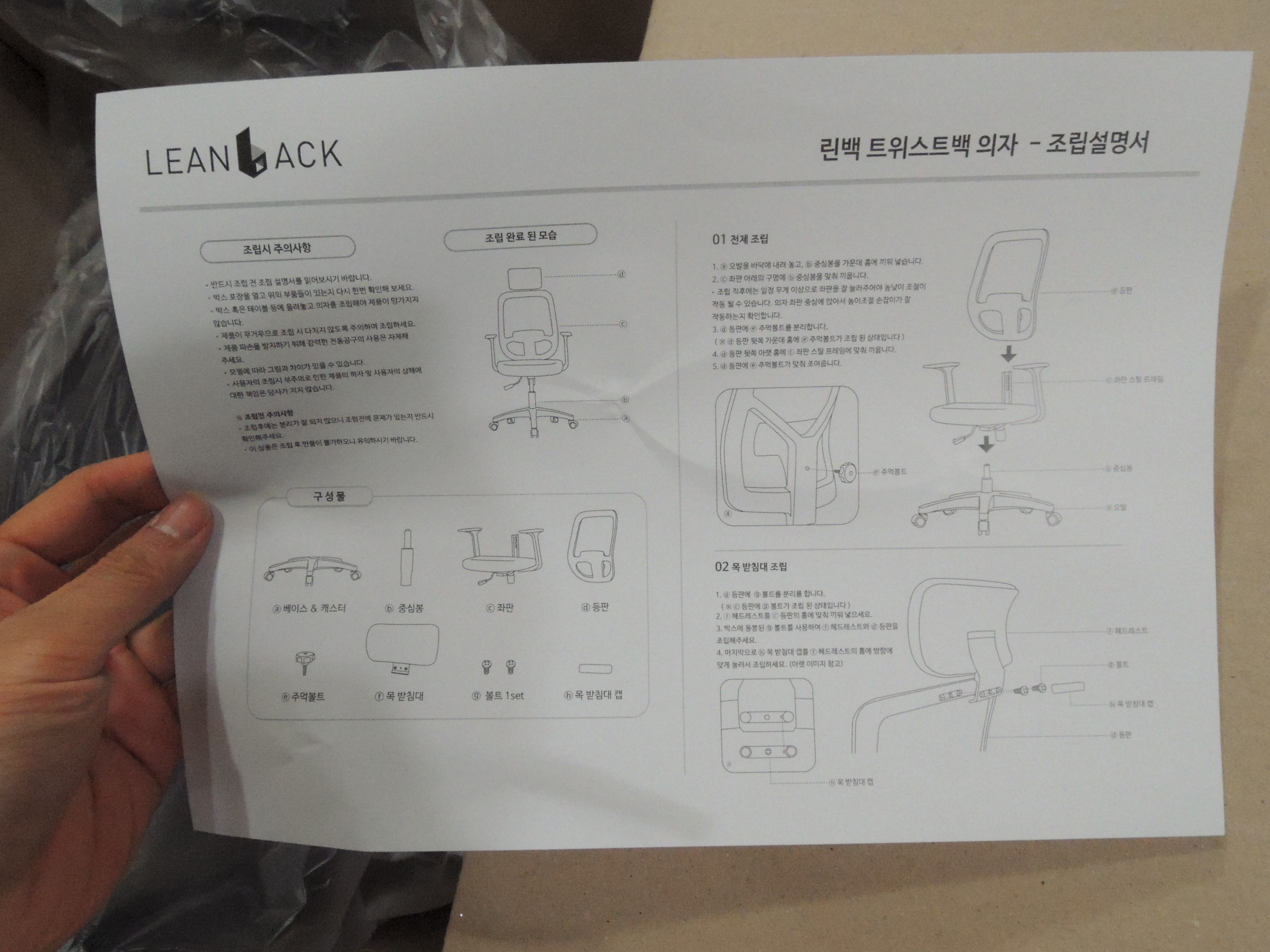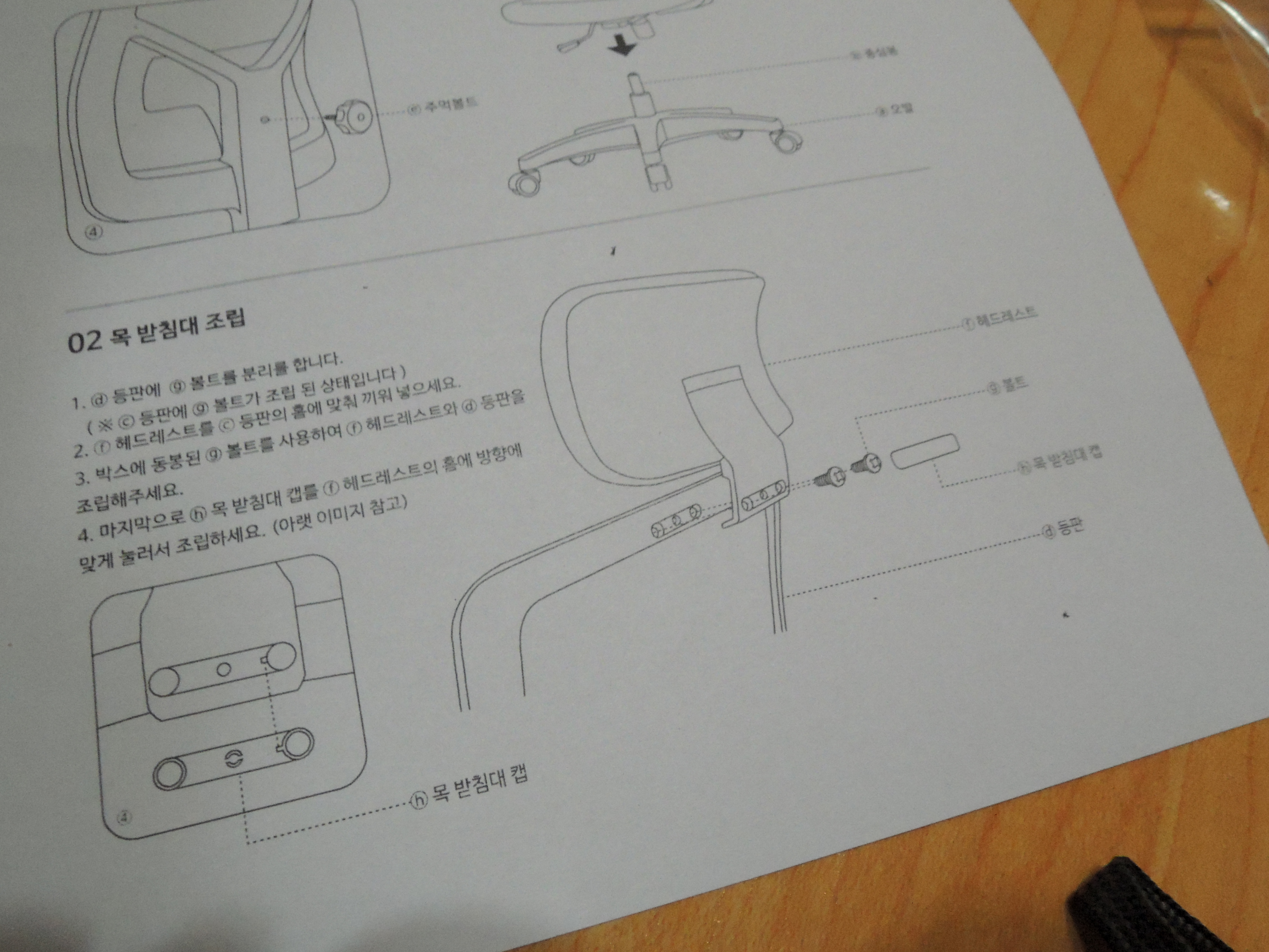 목받침을 조립해봅시다. 위 설명서처럼 등받이에 목받침을 끼우고, 나사를 조인뒤, 덮개를 씌우면 됩니다.