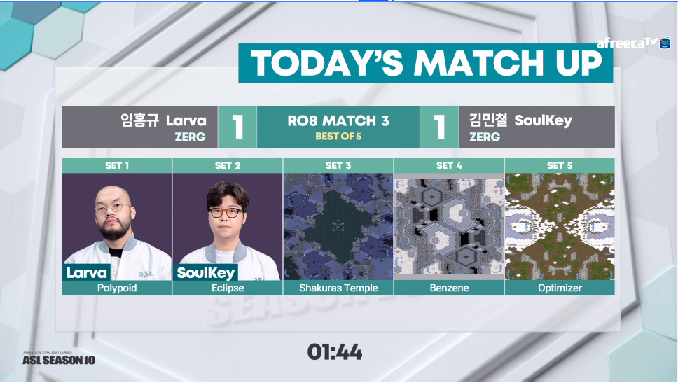 | ASL S10 8강 3경기 4세트 벤젠 임홍규 vs 김민철 - 임홍규 승, 4강 진출 (0) | 2020.10.25 |