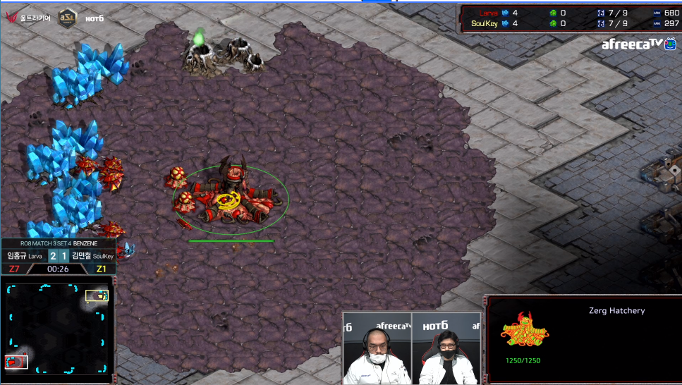 이번 4세트에서는 두 선수 모두 12드론 앞마당 해처리 전략을 사용합니다. 다만 임홍규선수는 11드론 앞마당, 김민철선수는 12드론 앞마당으로 아주 근소한 차이가 있어요.