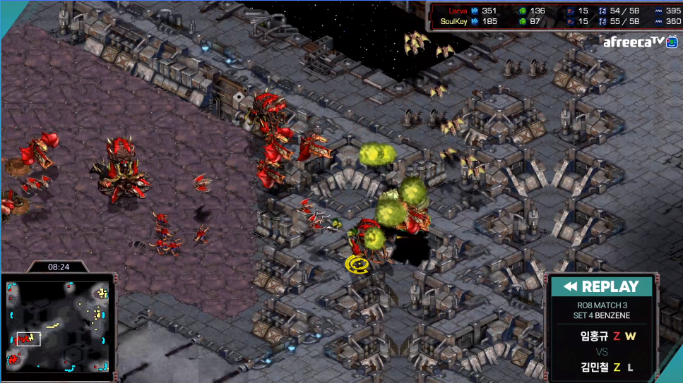 임홍규선수는 뮤탈다수, 스콜지소수, 김민철선수는 뮤탈을 줄이고 스콜지를 늘린 조합으로 맞붙지만, 싸우면서 김민철선수의 뮤탈보다 임홍규선수의 뮤탈 머릿수가 점점 앞서가 임홍규선수가 승리를 가져갑니다. 결국 임홍규선수가 4강에 진출합니다!