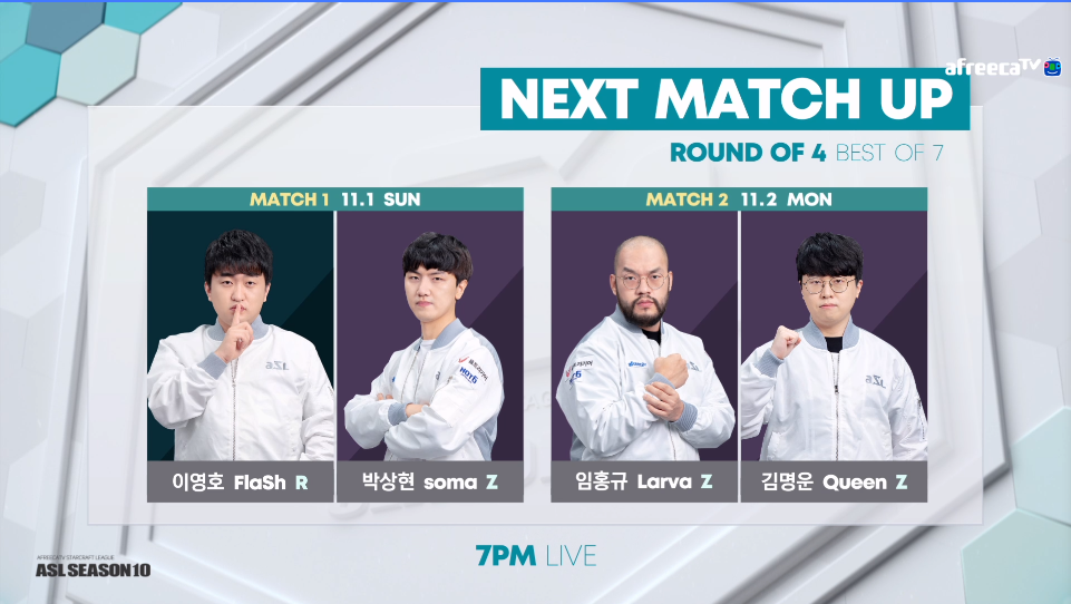 다음경기, 4강전은 11월 1일 일요일, 11월 2일 월요일 이틀에 걸쳐 저녁 7시에 라이브로 진행됩니다.