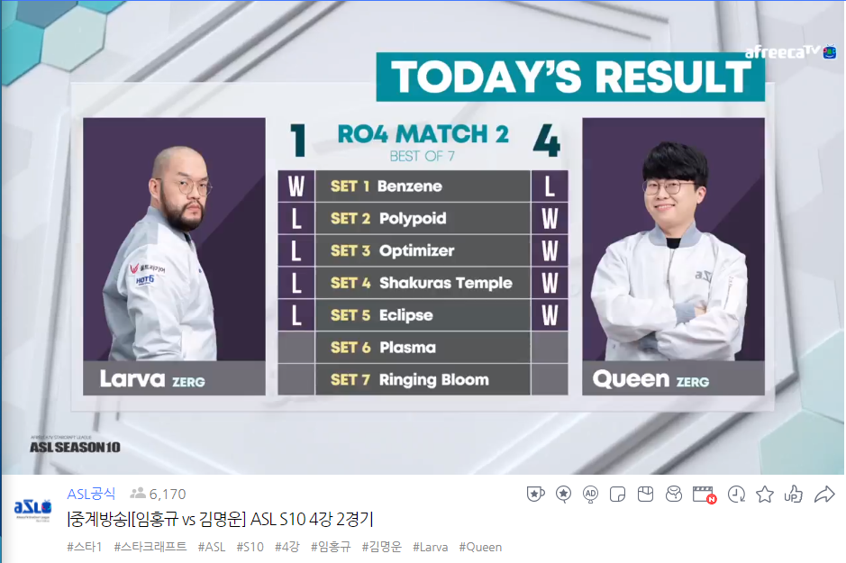 이로서 ASL 2번째 결승이자, 저그 최조 2시즌 연속결승, 그리고 ASL 3번째 2회 우승을 도전하게 되었어요.