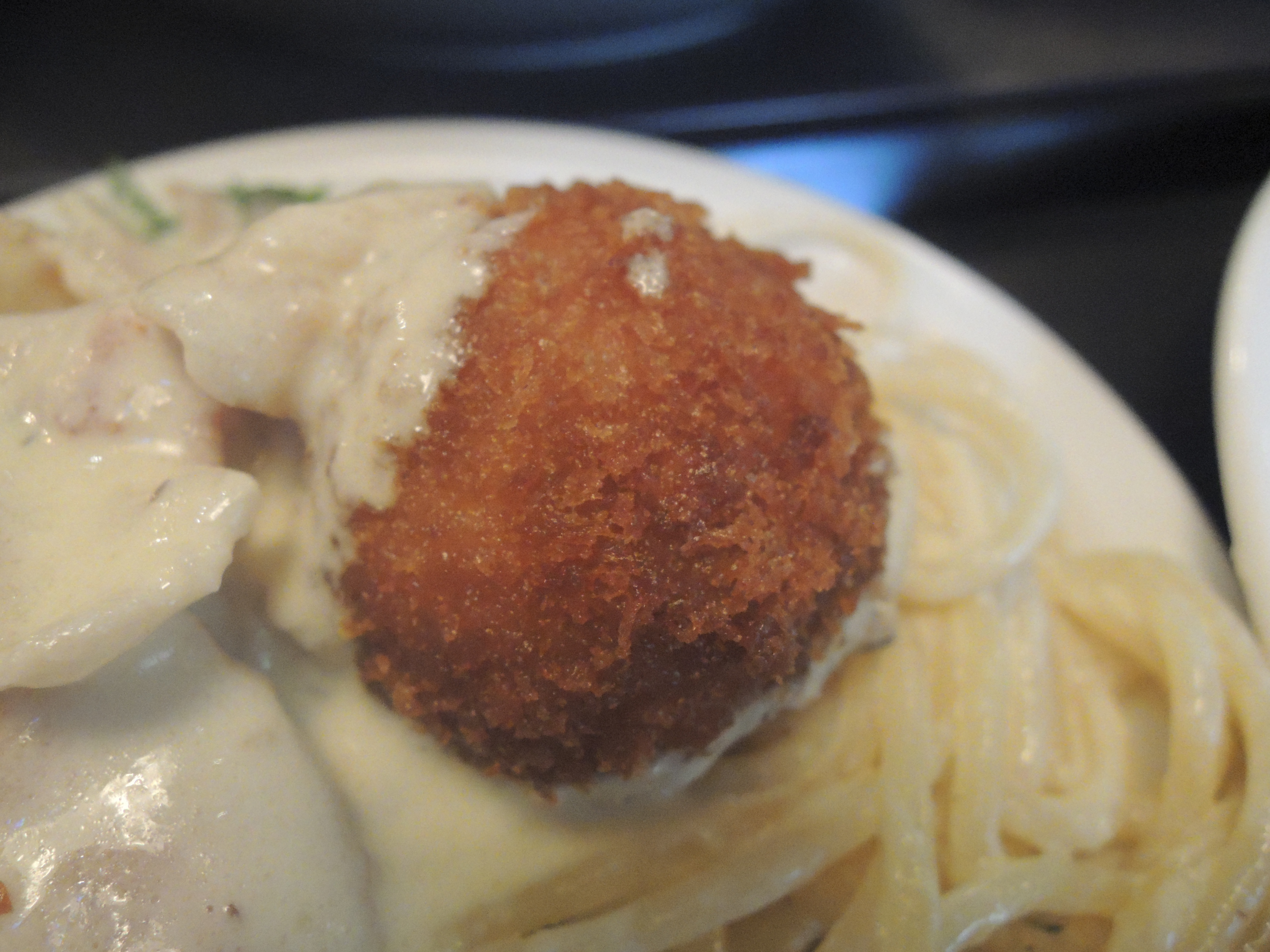 아란치니 크림파스타에요. 파스타위에 올라간 튀김 두개 저 튀김이 아란치니래요. 이탈리아 요리라고 하더라고요.