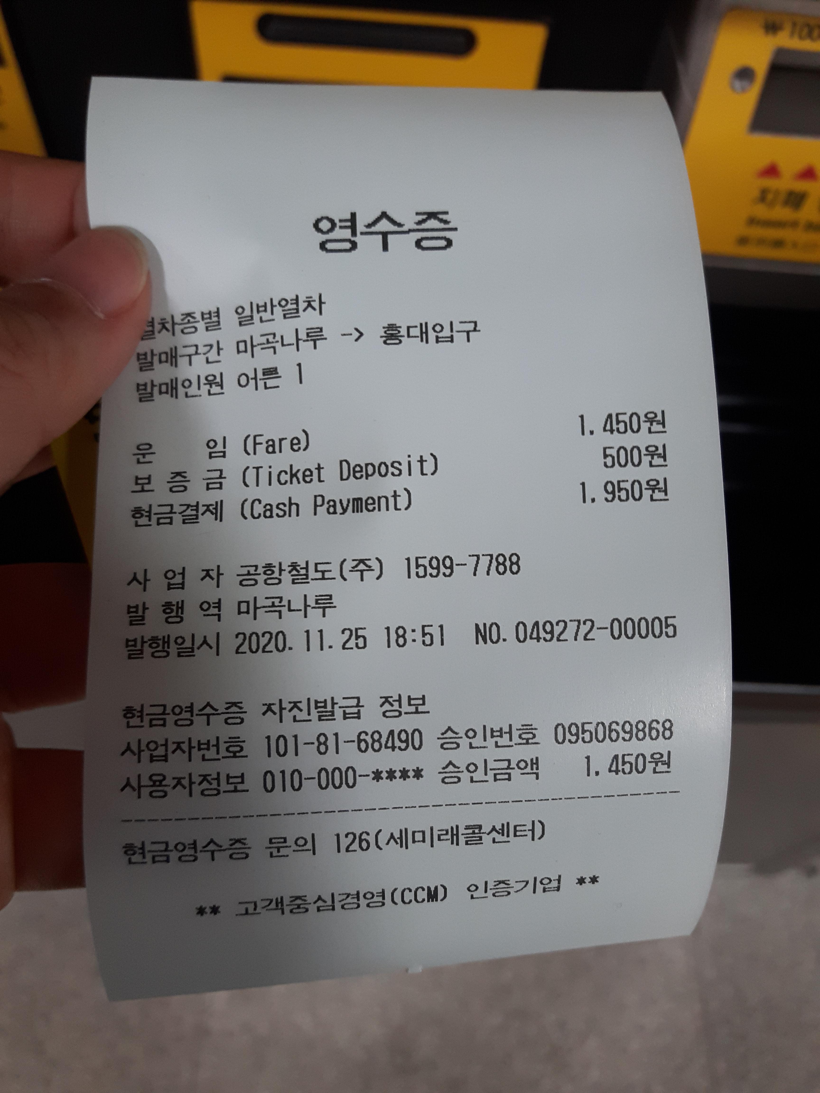 마곡나루에서 홍대입구까지 기본료 1450원에 카드 보증금 500원 추가(카드 반납하면 돌려줌)해서 1950원들었네요.