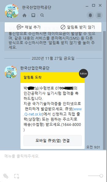 큐넷에 핸드폰번호 등록했더니 방금 합격을 알리는 카톡이 왔습니다.