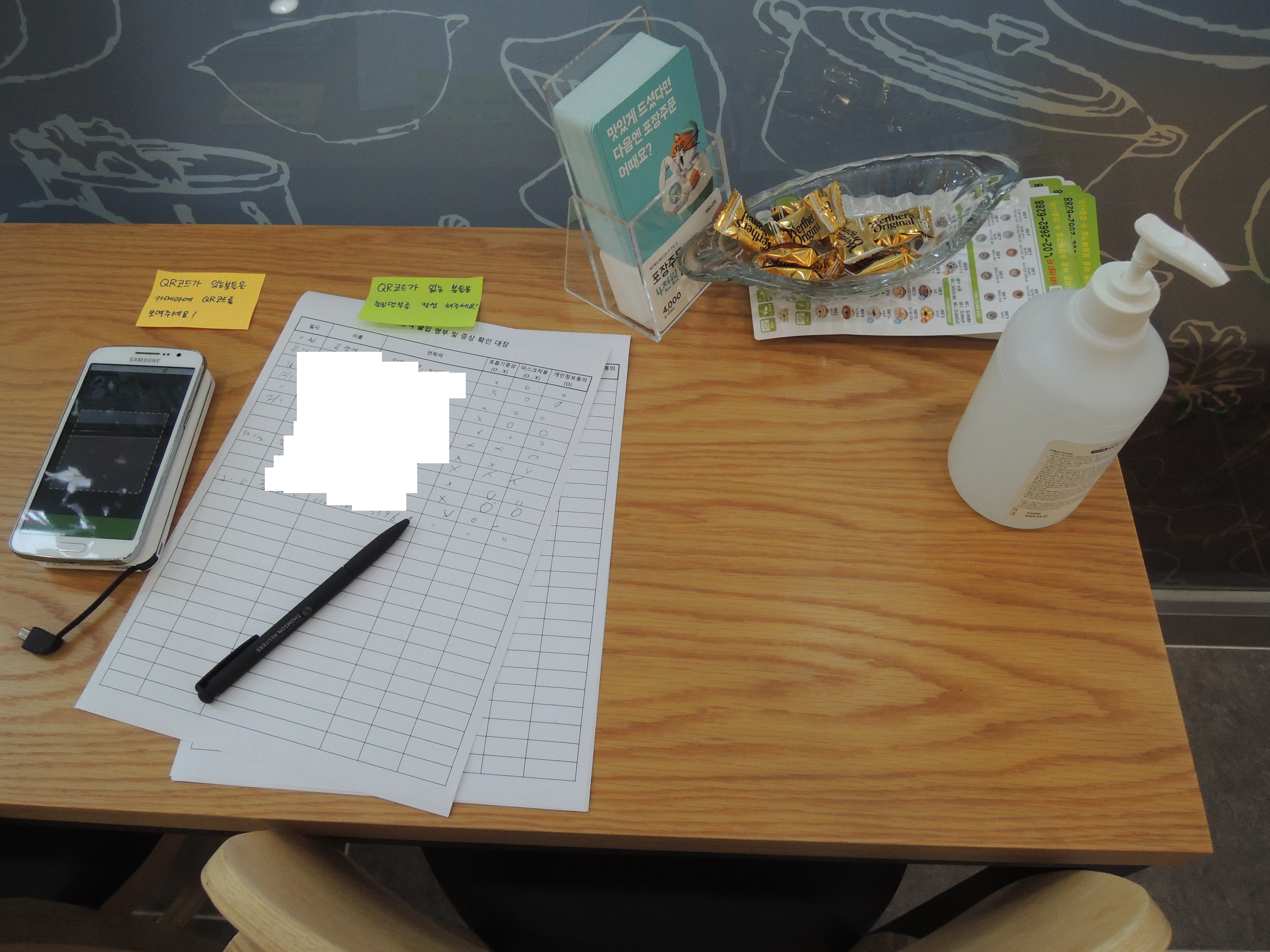코로나 확산방지를 위한 큐알코드, 명부작성과 손소독제가 준비되어 있어요.