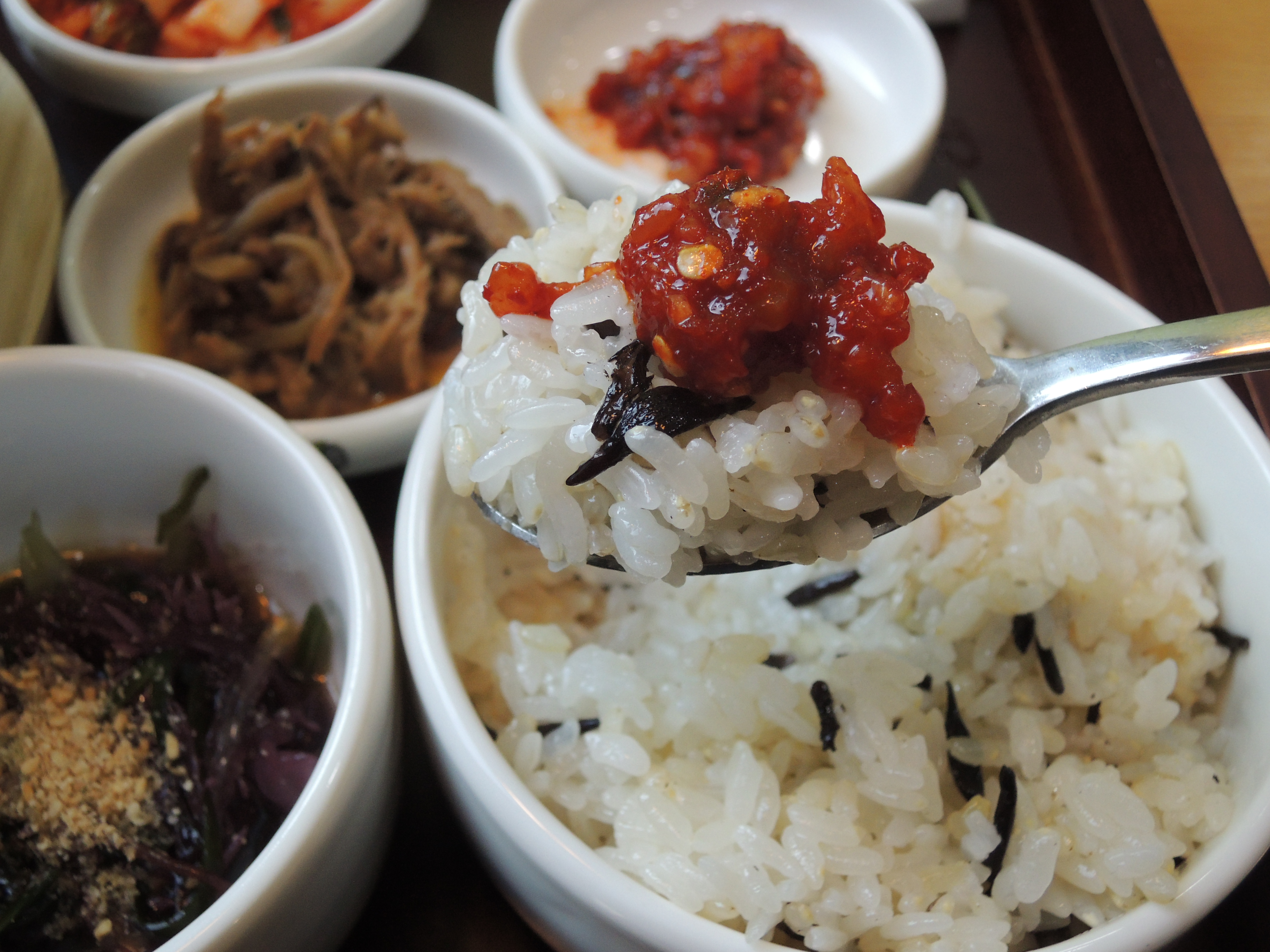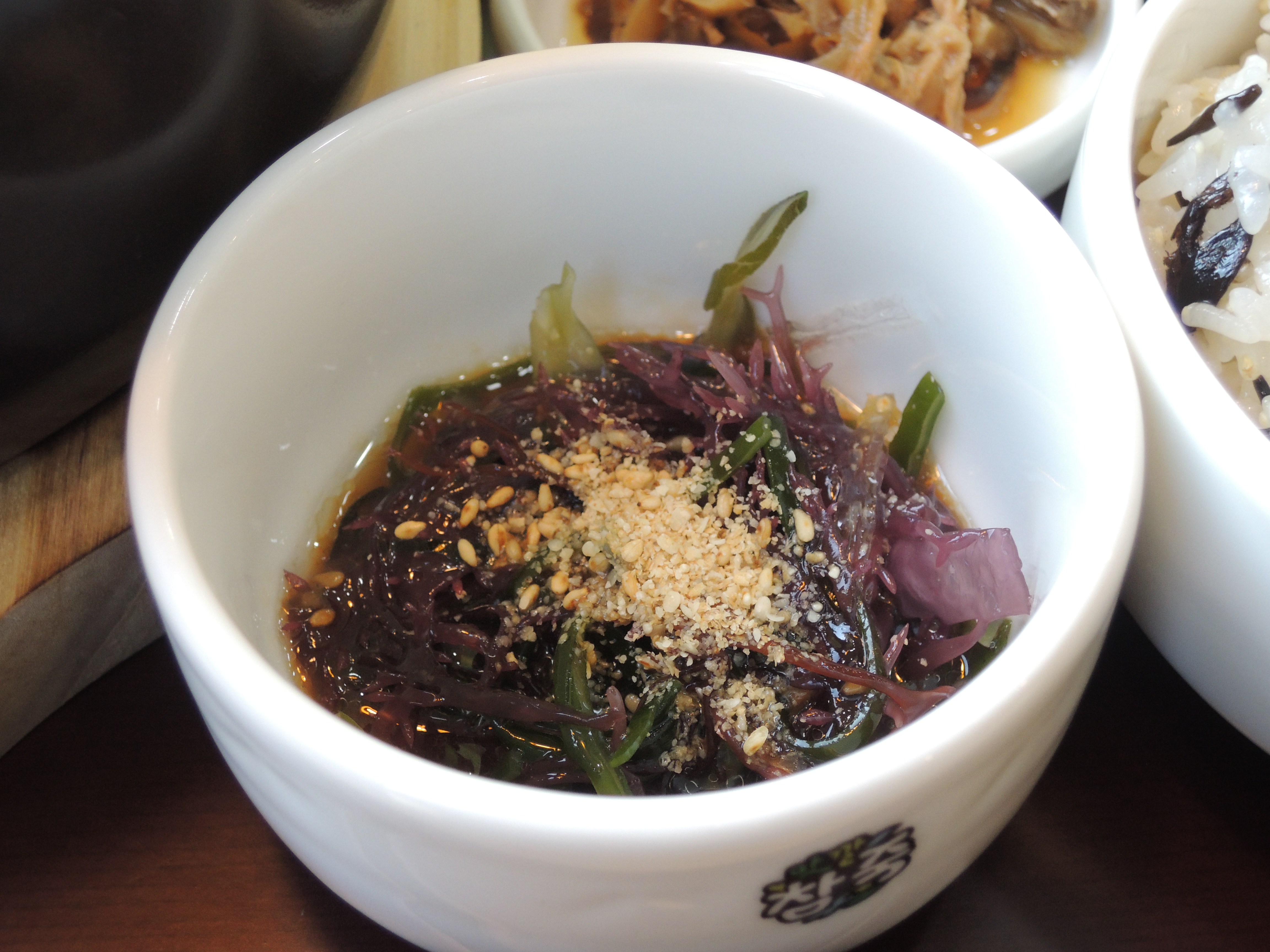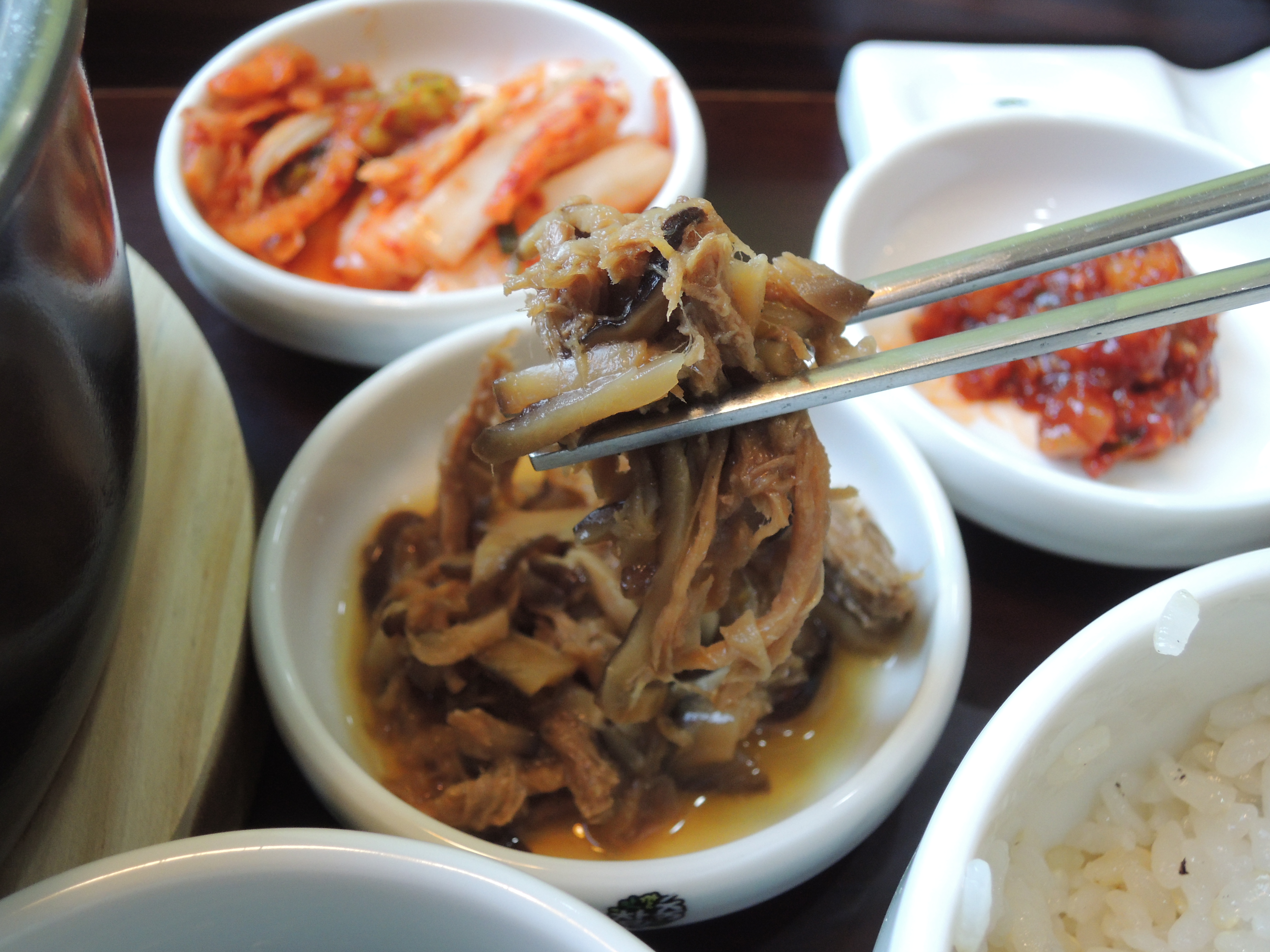 김치, 버섯소고기볶음, 낙지젓갈, 해초무침, 톳밥, 미역국 구성이에요.