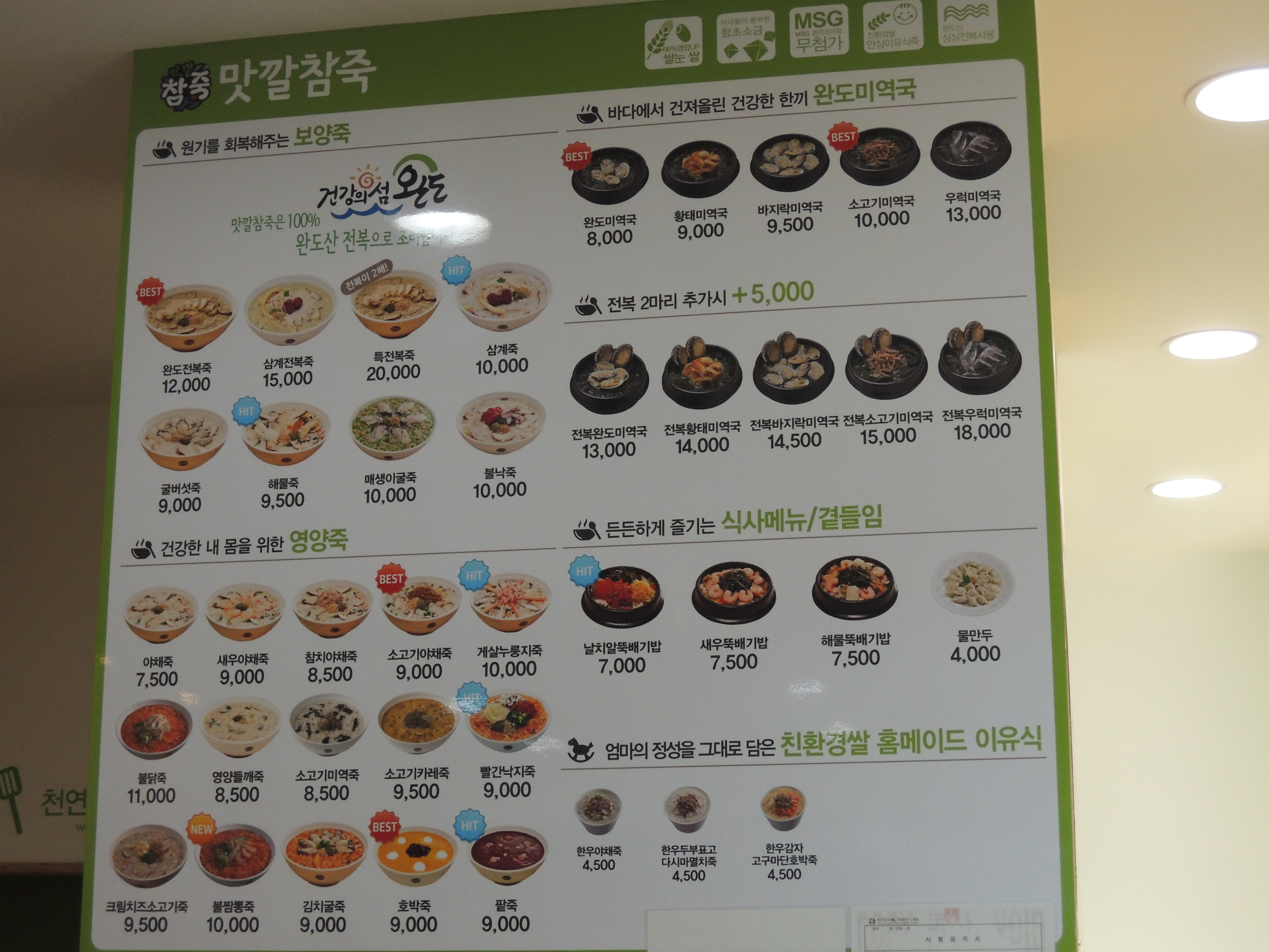 맛깔참죽의 메뉴구성이에요. 저는 전복완도미역국을 주문했어요.