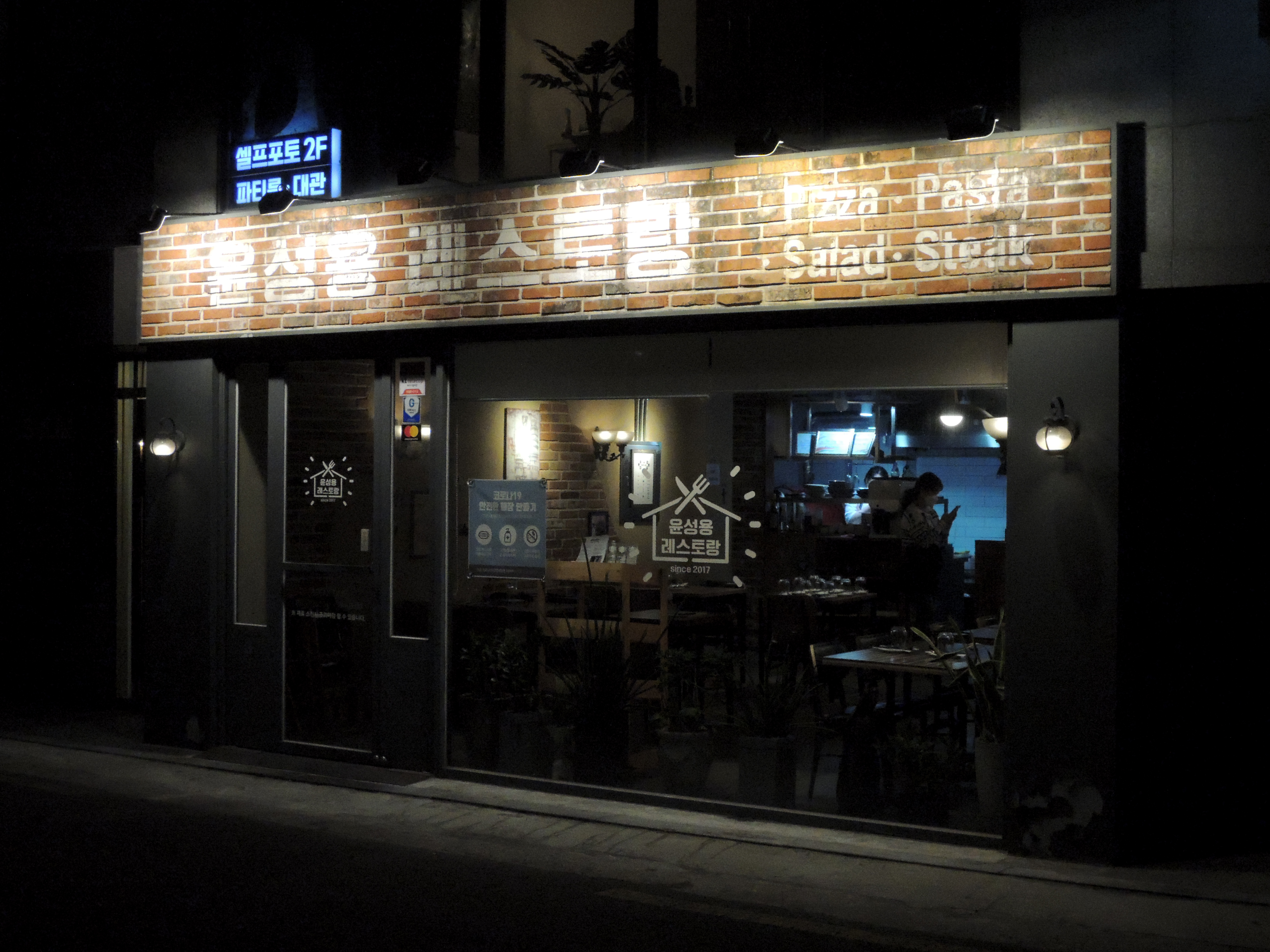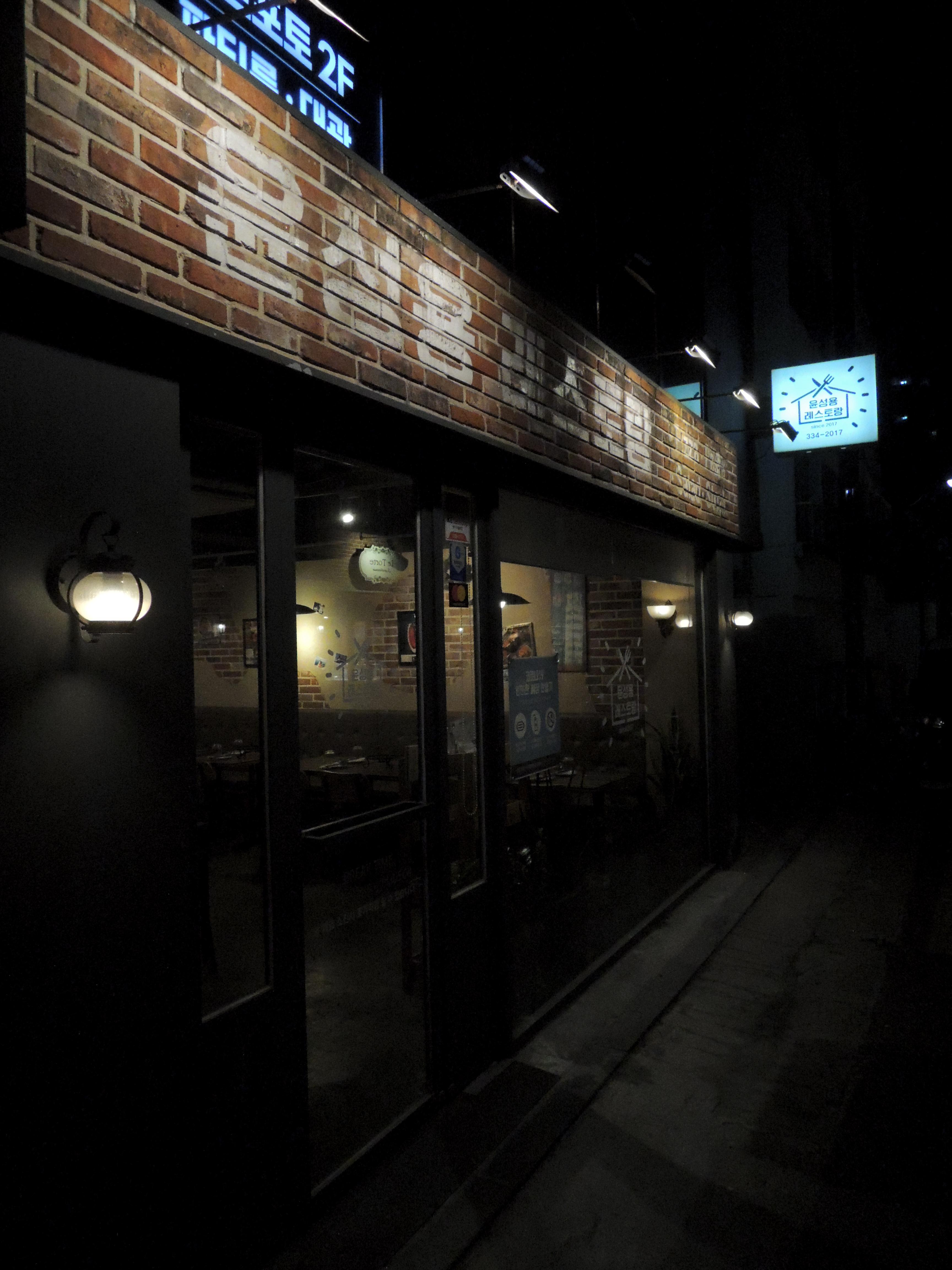 붉은 벽돌에 화이트로 정자로 레스토랑 이름을 적은 간판이 독특해요. 간판도 가격대비 효율이 참 좋게 아이디어 있게 잘 만들었어요.