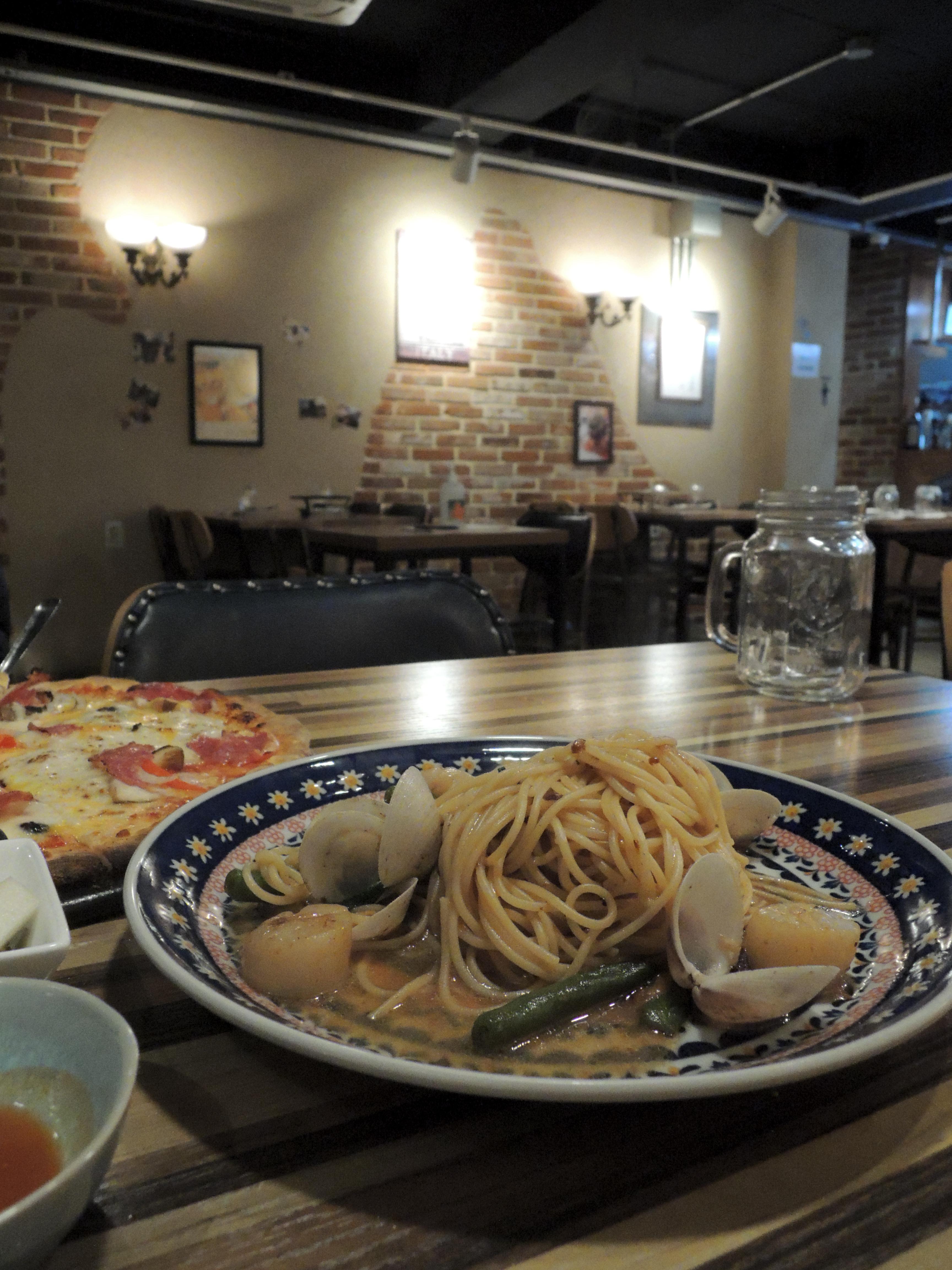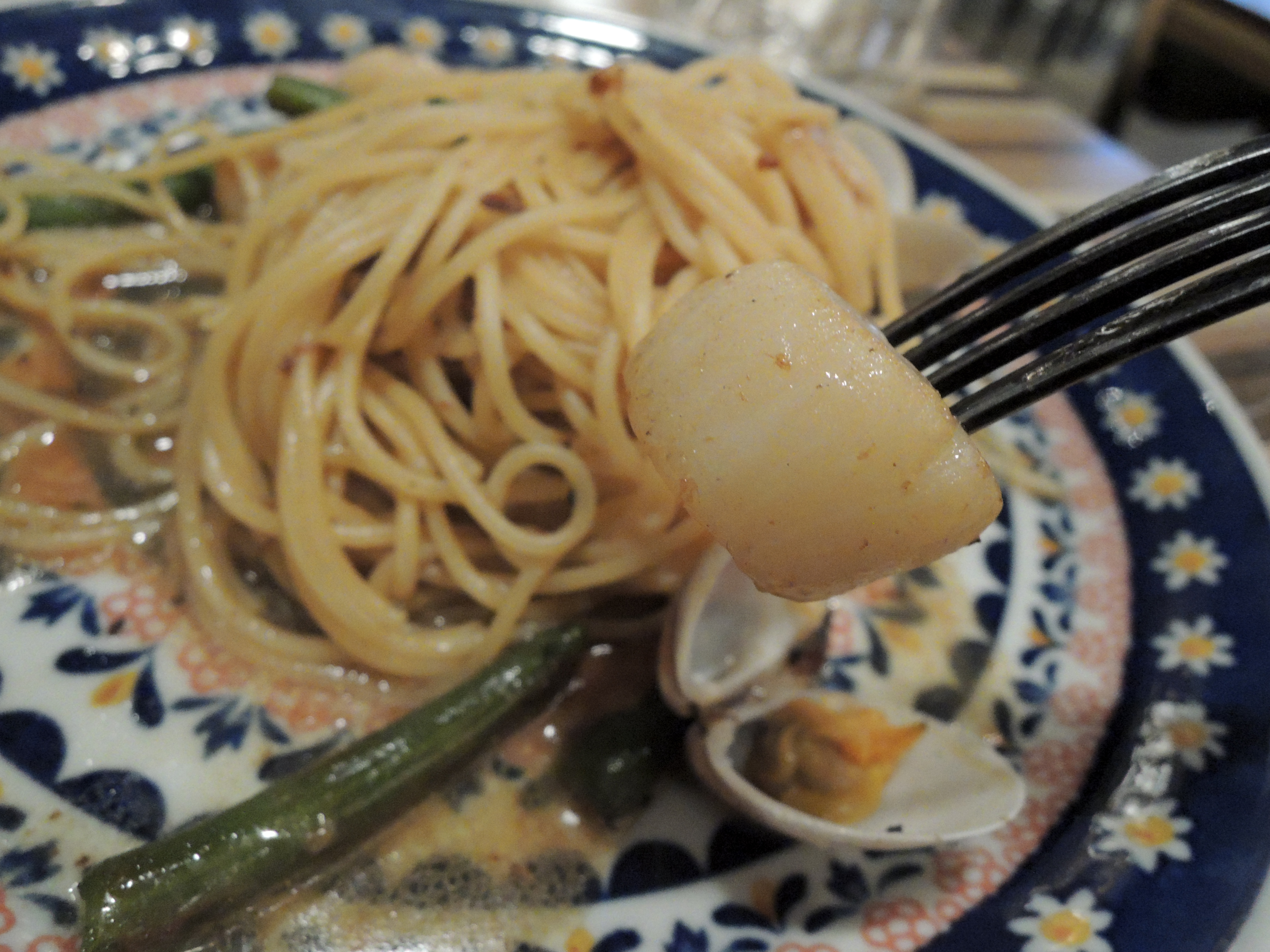 스트립관자파스타에요. 쉐프님이 바로 만들어주셔서 김이 모락모락 납니다. ㅎㅎ 관자가 일단 넘 부드럽고, 면도 잘 익혀졌어요.