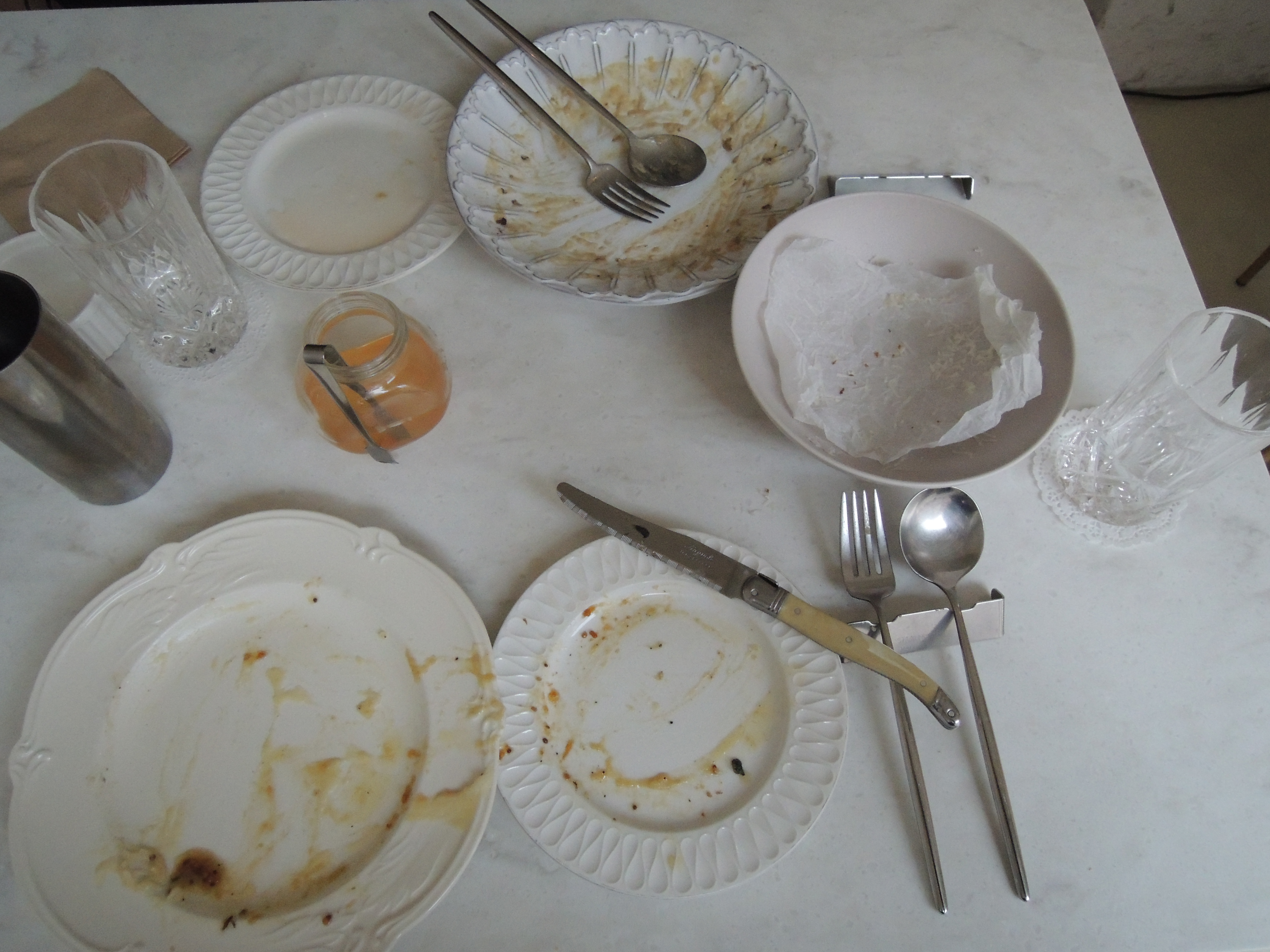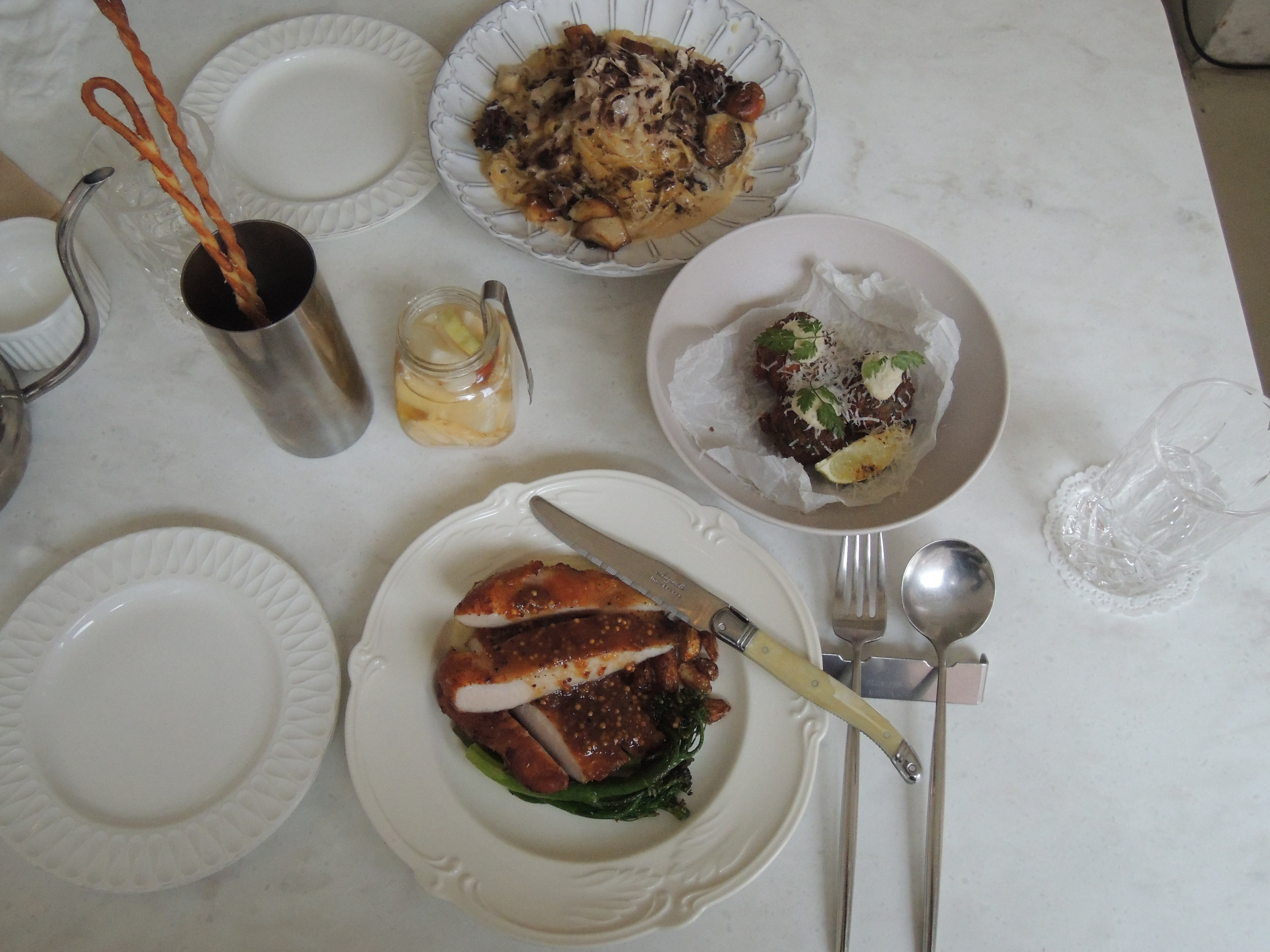 대리석느낌의 테이블에 은색 주전자와 식기, 패턴이 새겨진 접시와 더불어 양초가 마치 이탈리아에 온 느낌을 줍니다.