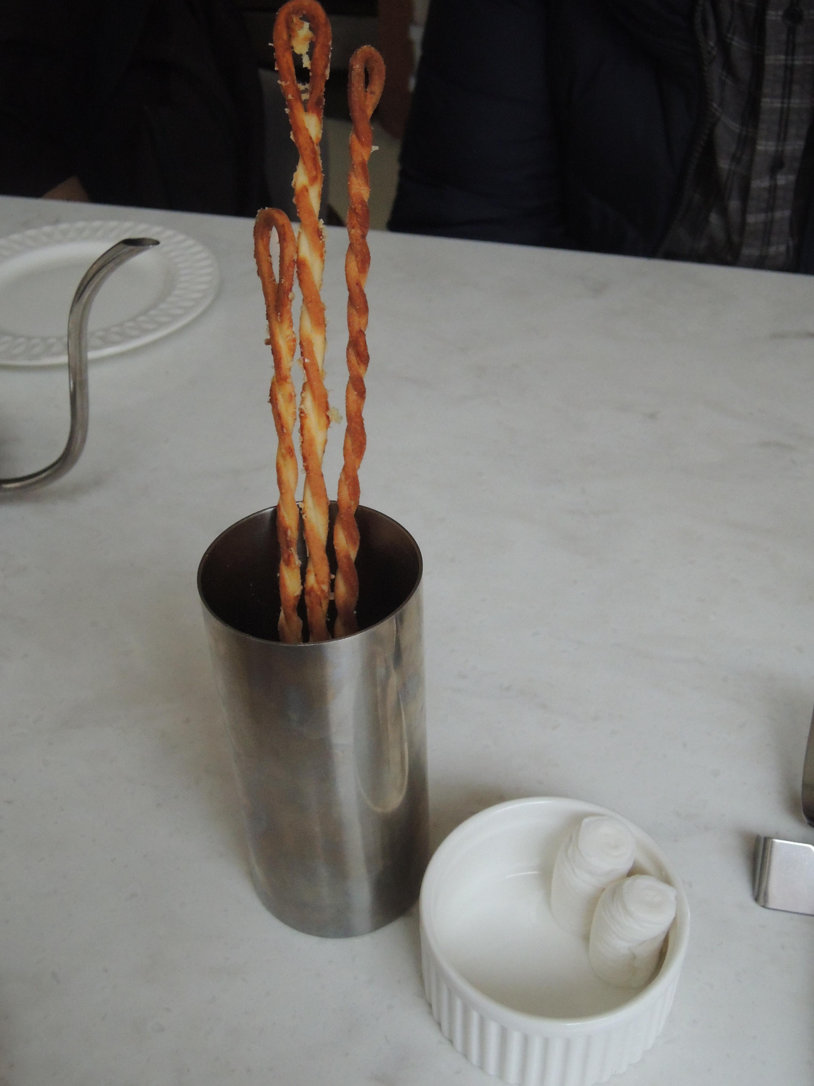 파스타면을 꼬아서 만든 과자와 물티슈를 줍니다.