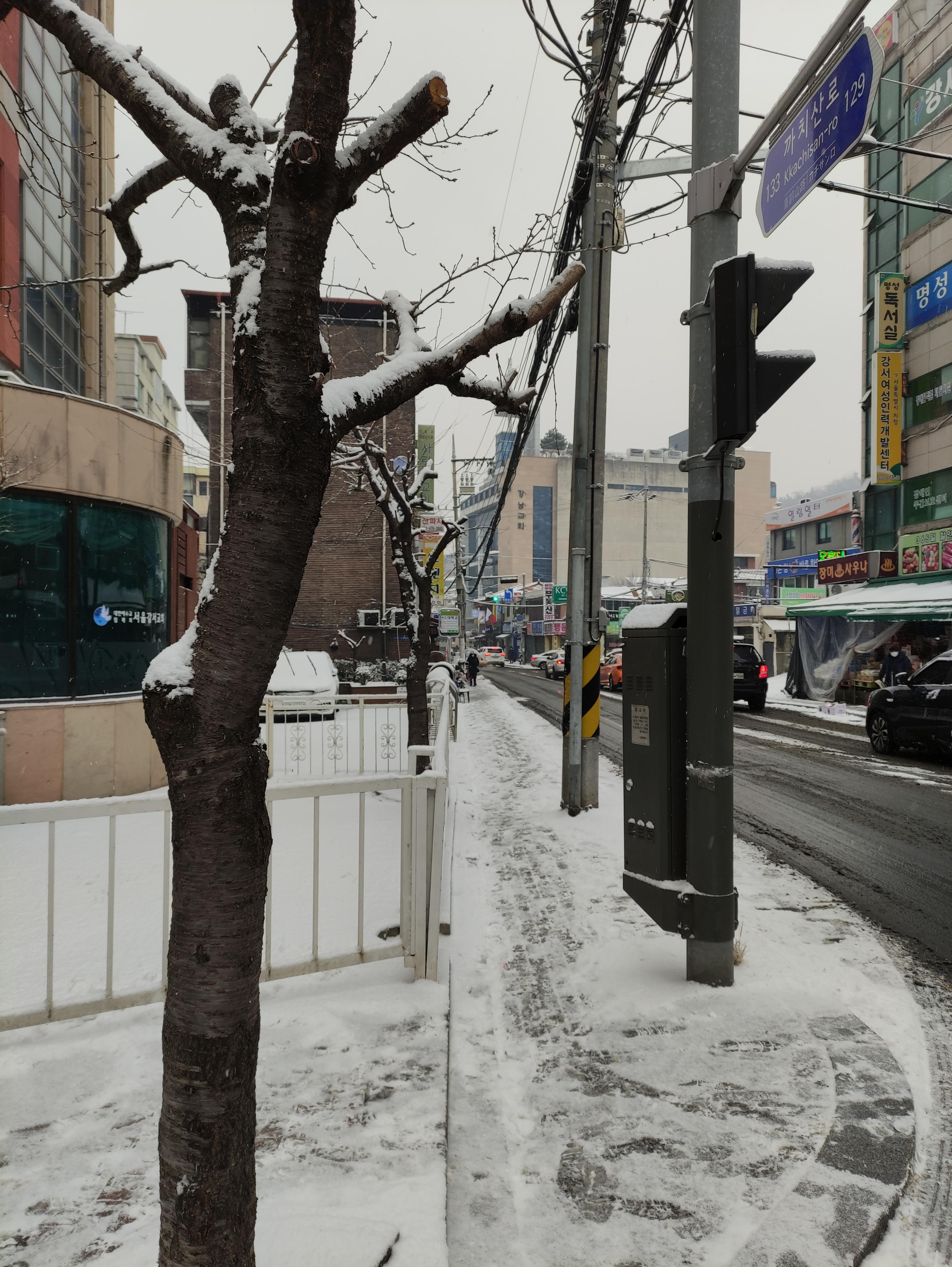 갑자기 낮부터 함박눈이 내려서 길가에 눈이 쌓였네요. ㅎㅎ