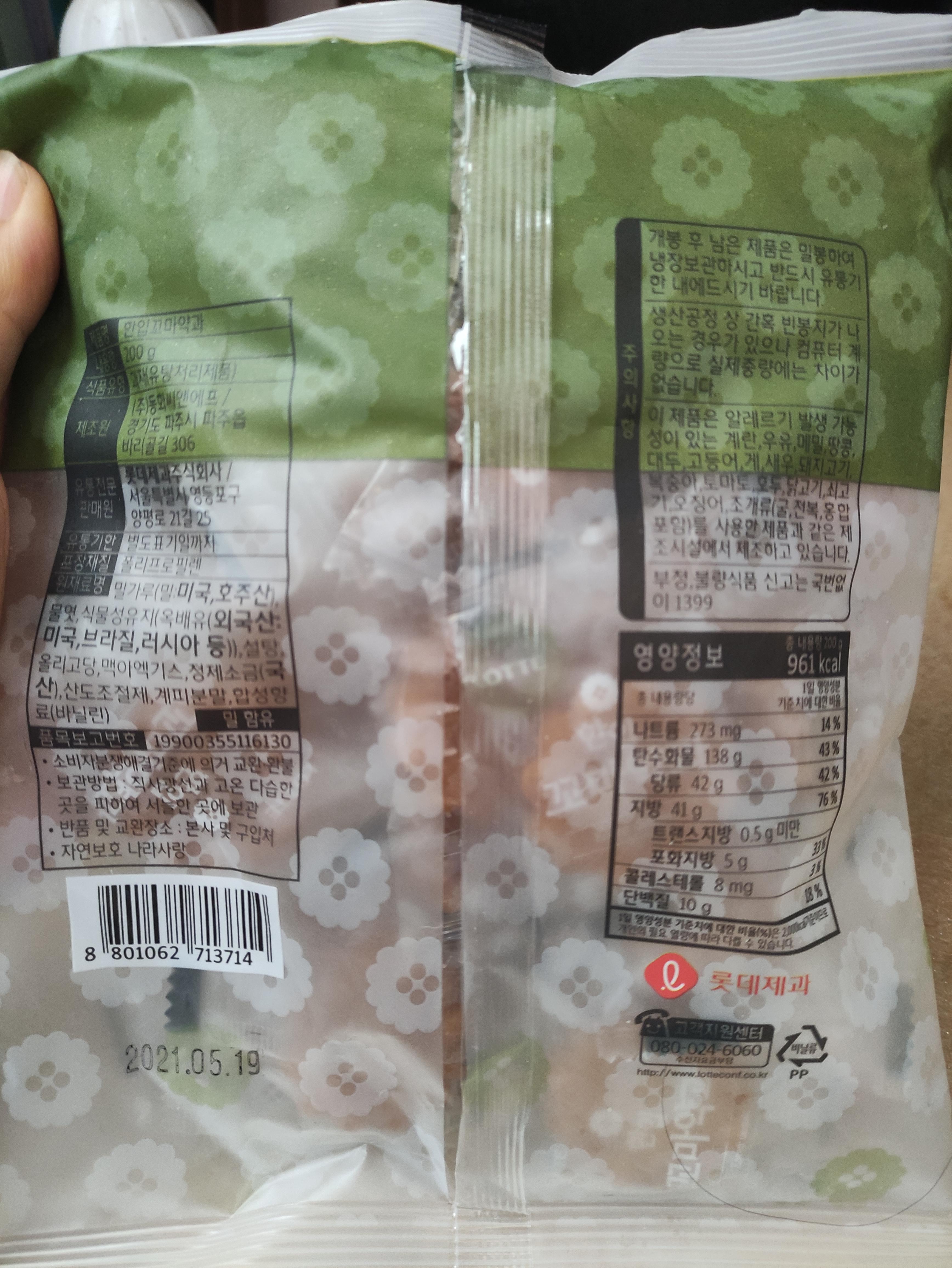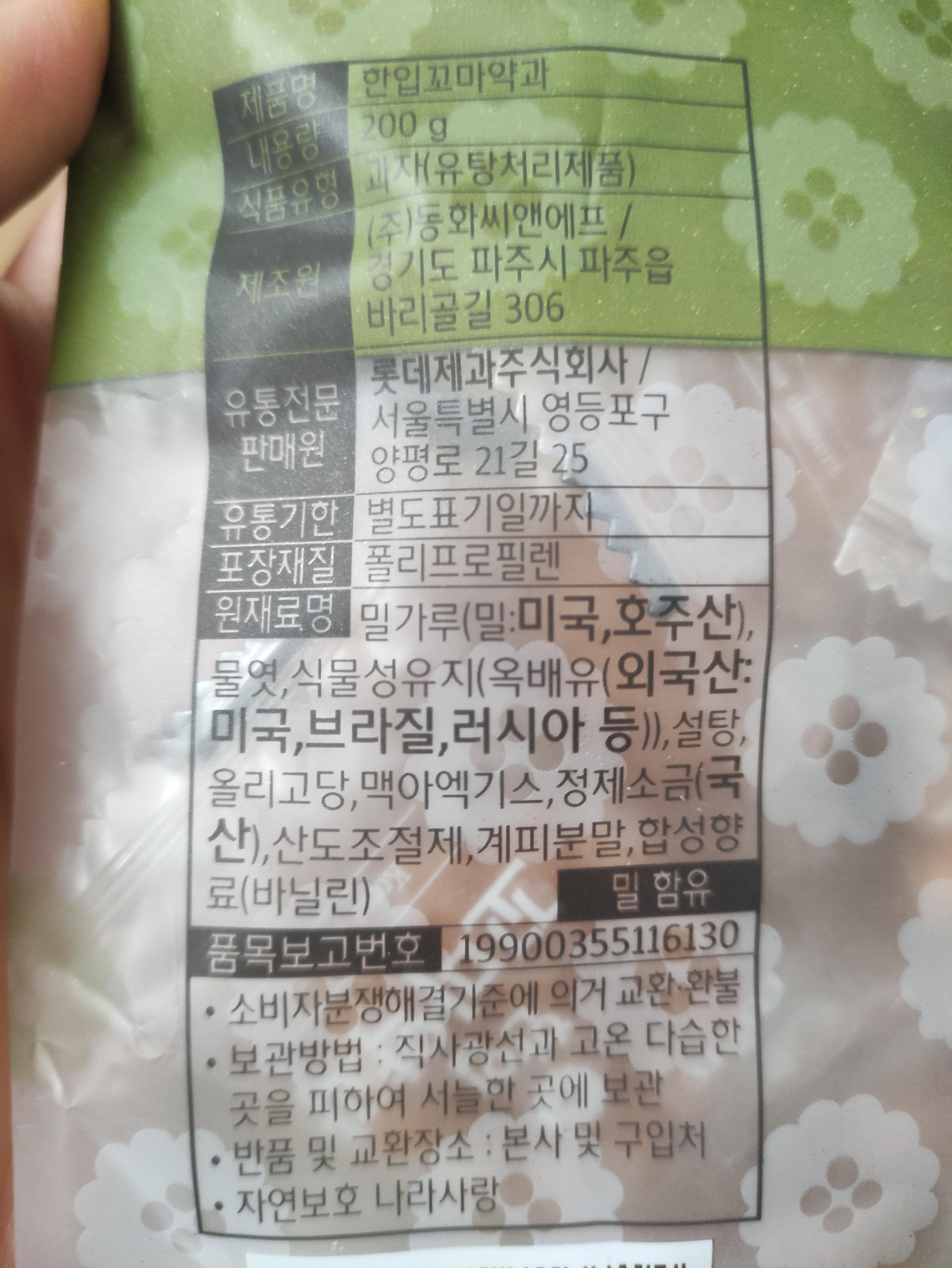 롯데한입약과의 원재료와 영양정보에요. 칼로리가 제법 높네요.