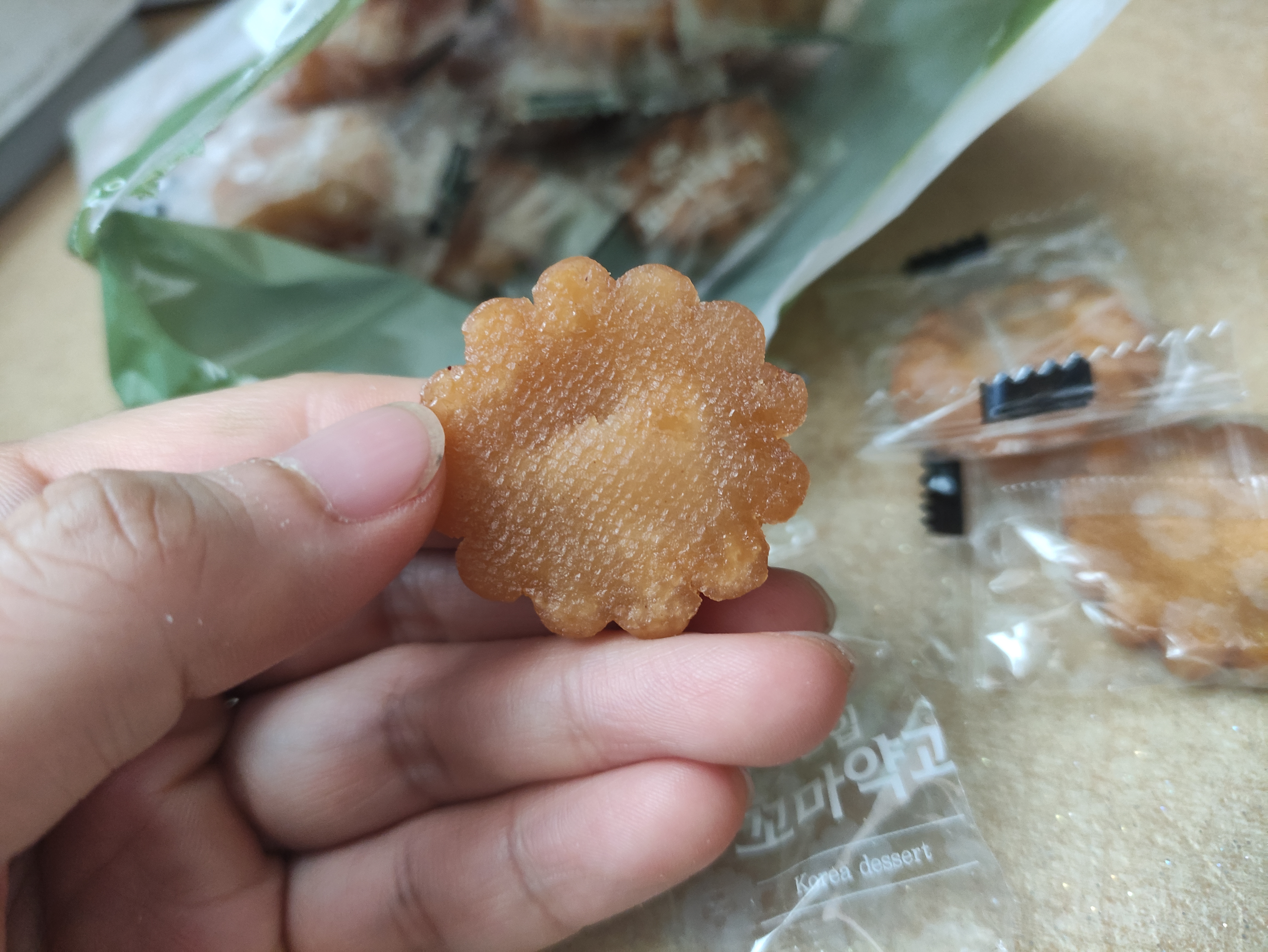 포장봉투를 열면 이렇게 개별포장된 꼬마약과가 나와요. 약과가 서로 들러붙을수있어서 이렇게 개별포장했나봐요. 하나씩 깔끔하게 먹을 수 있어서 좋아요.