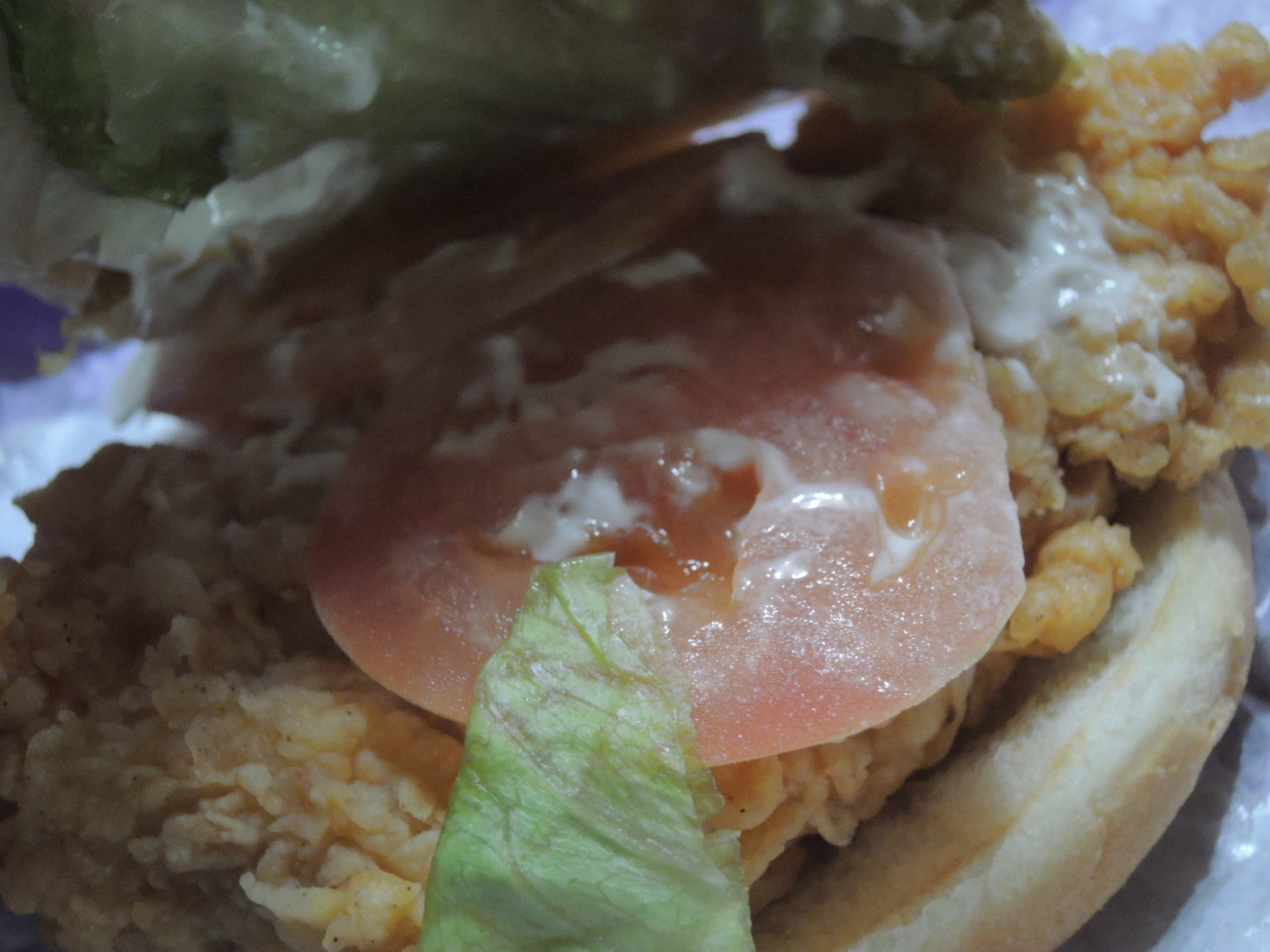 마요네즈소스, 양상추, 토마토가 들어있어요. 매콤한 패티와 부드러운 마요네즈소스가 궁합이 잘 맞아요.